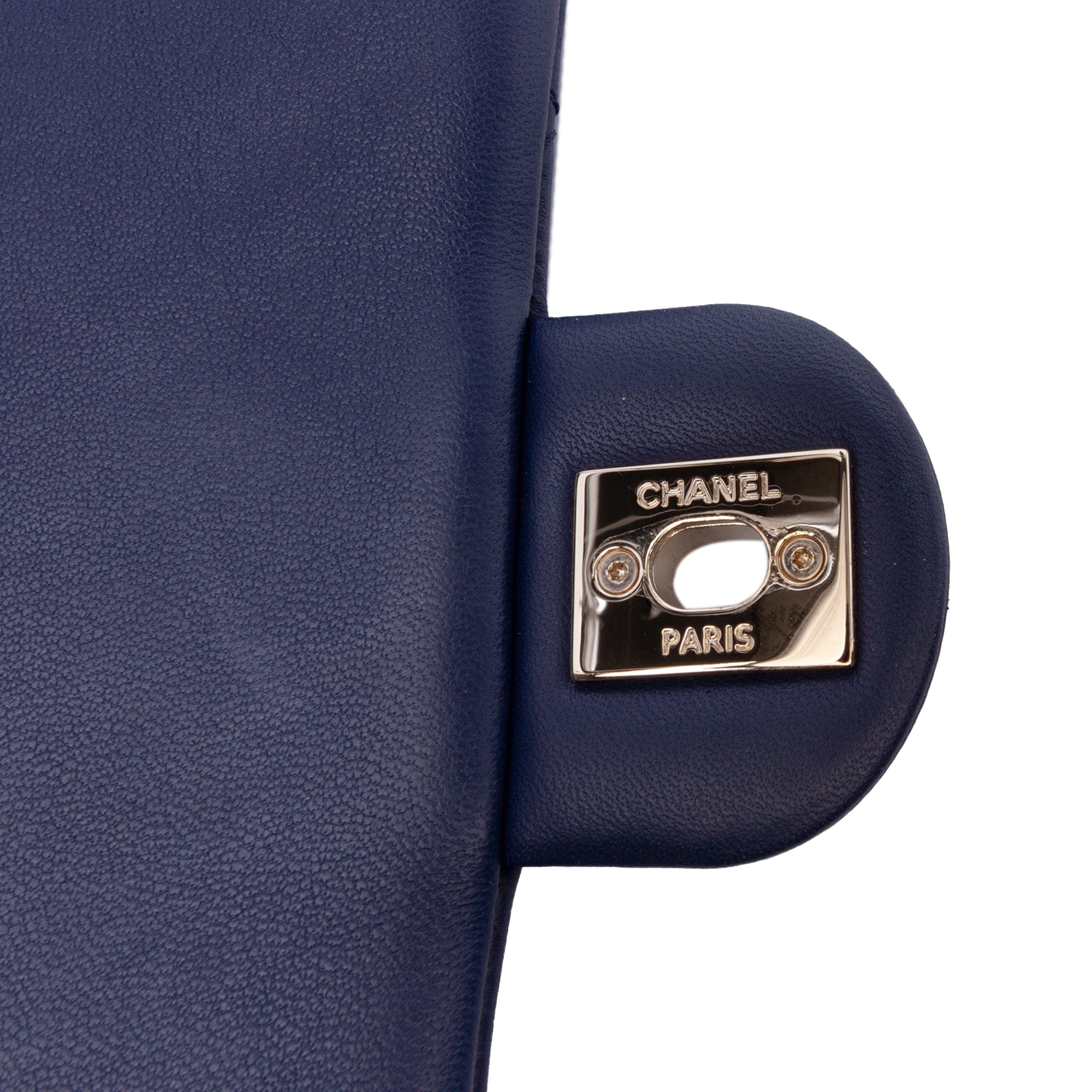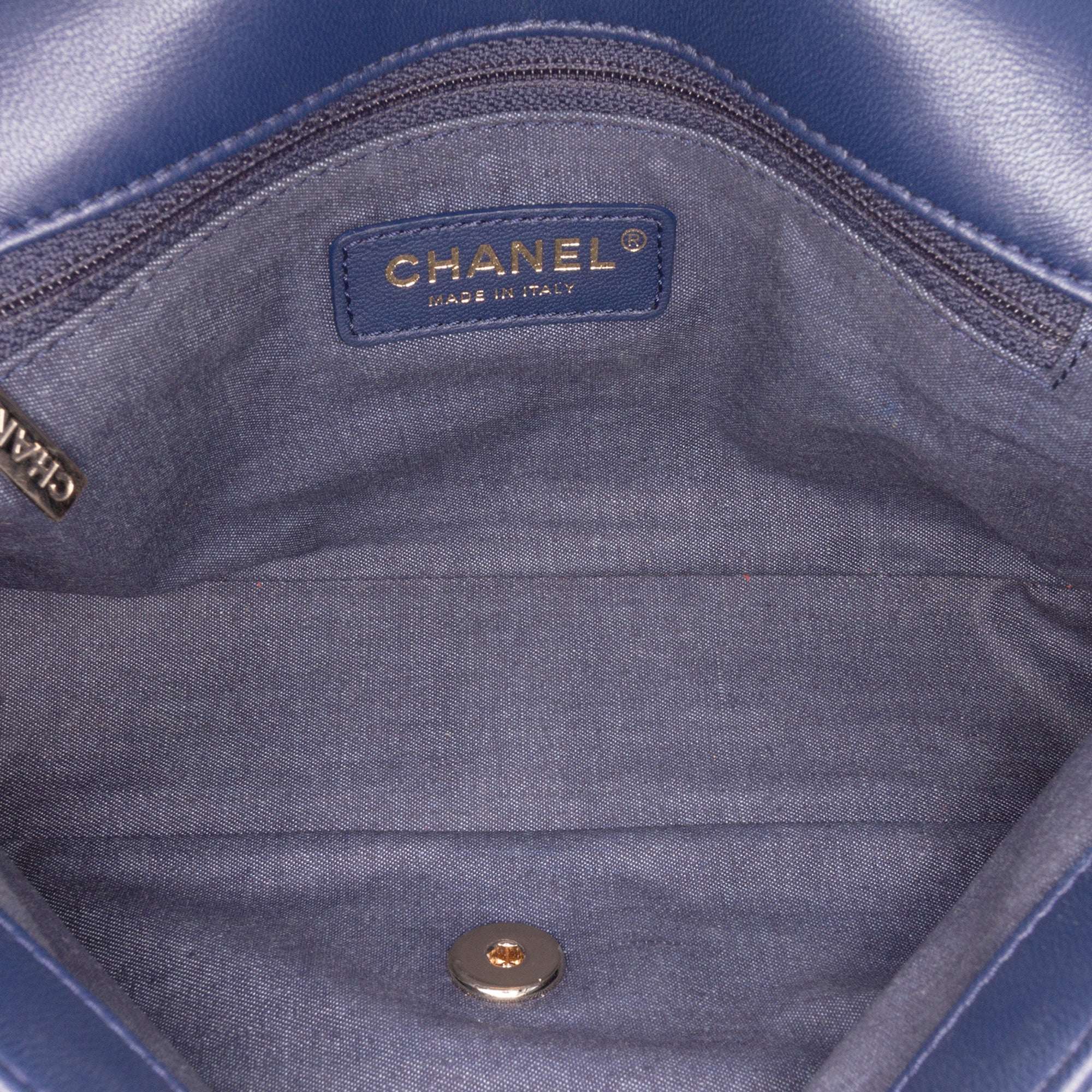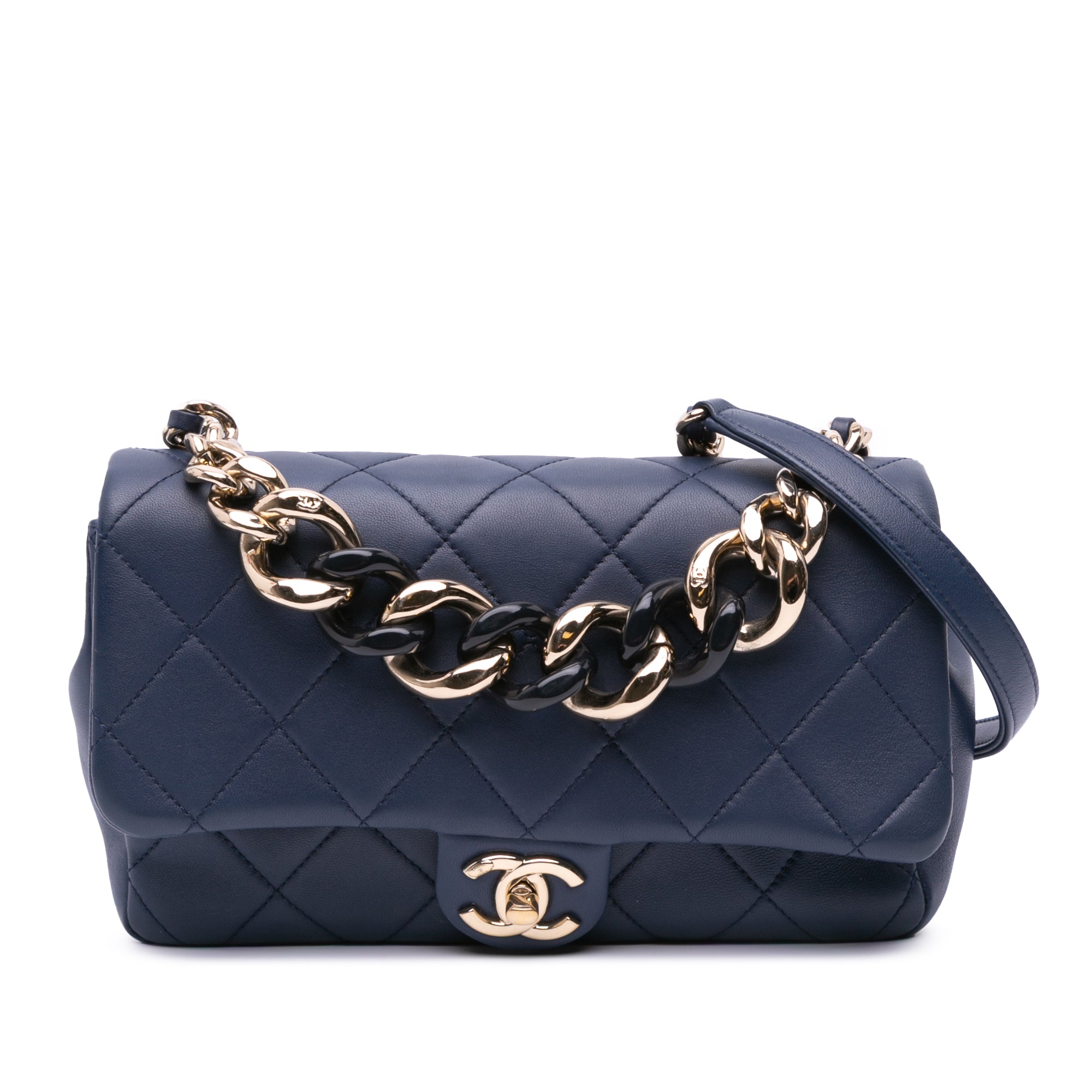 This satchel features a quilted lambskin leather body, a bicolor resin handle, a leather woven chain link strap with leather guard, a single front flap with CC turn-lock closure, an exterior back slip pocket, and an interior zip pocket. Inclusion: authenticity card. Retail Price: 5300.00