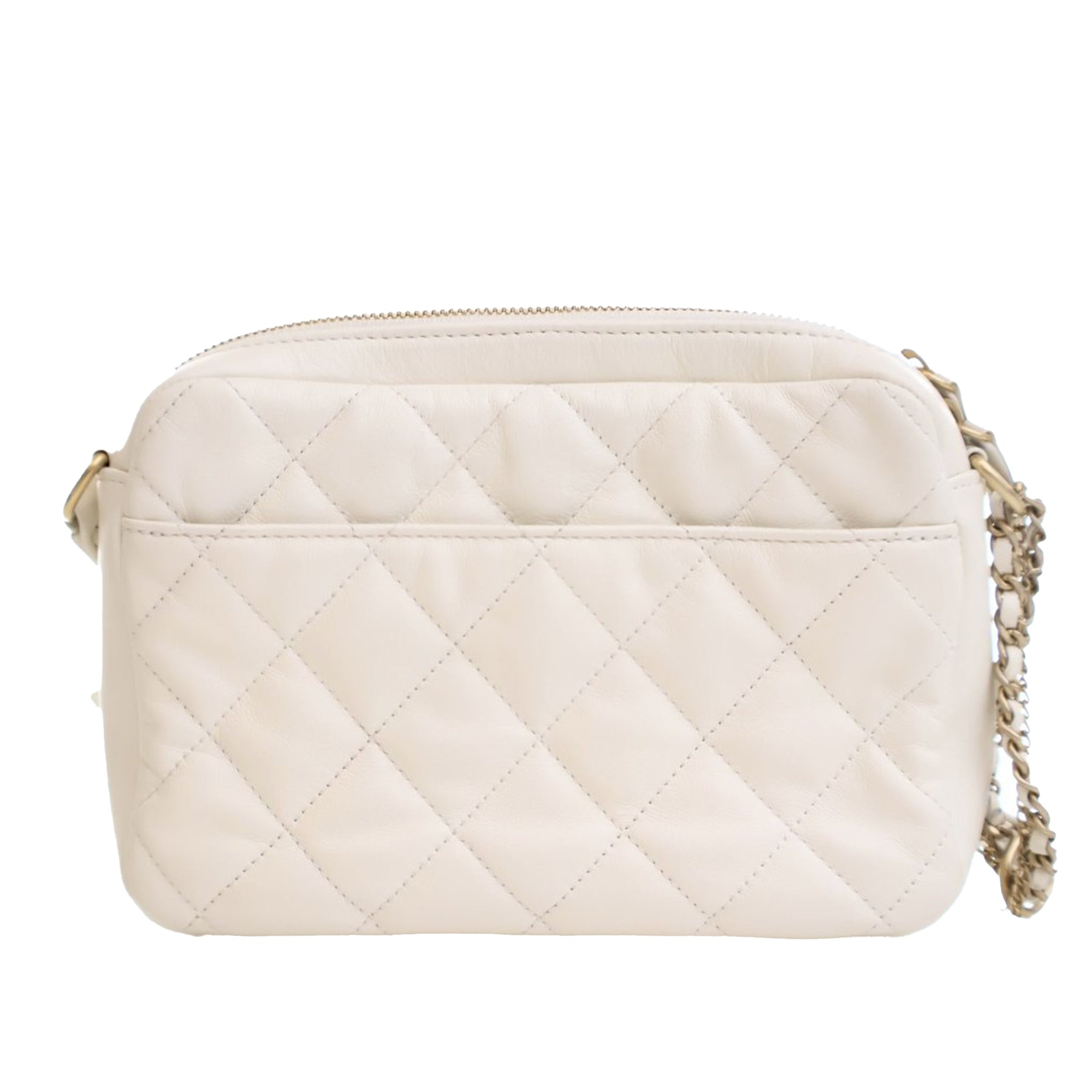 This camera case features a leather body, an adjustable flat leather strap with leather woven chain, a top zip closure, and front exterior zip pockets with chain and leather woven chain. Retail Price: 9900.00