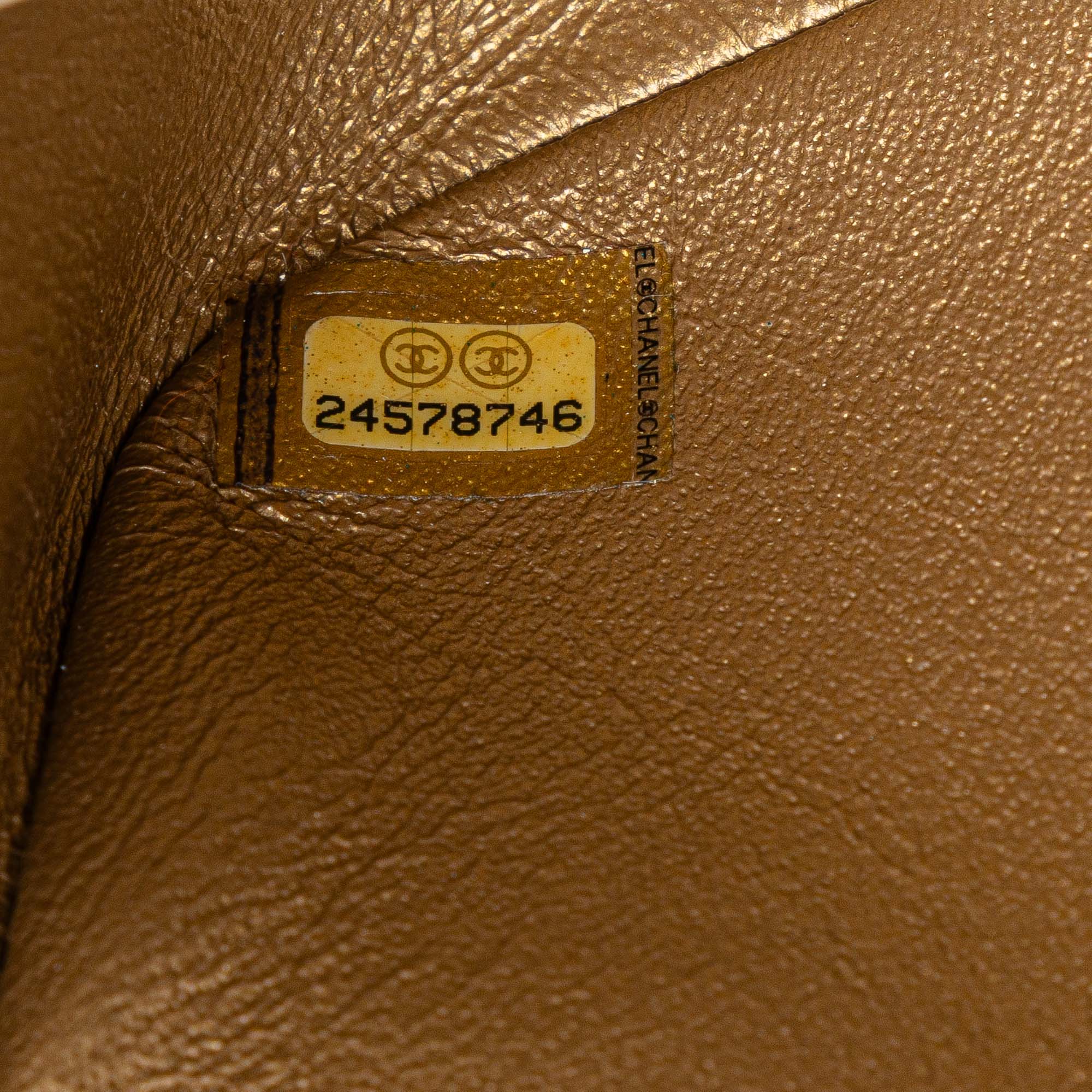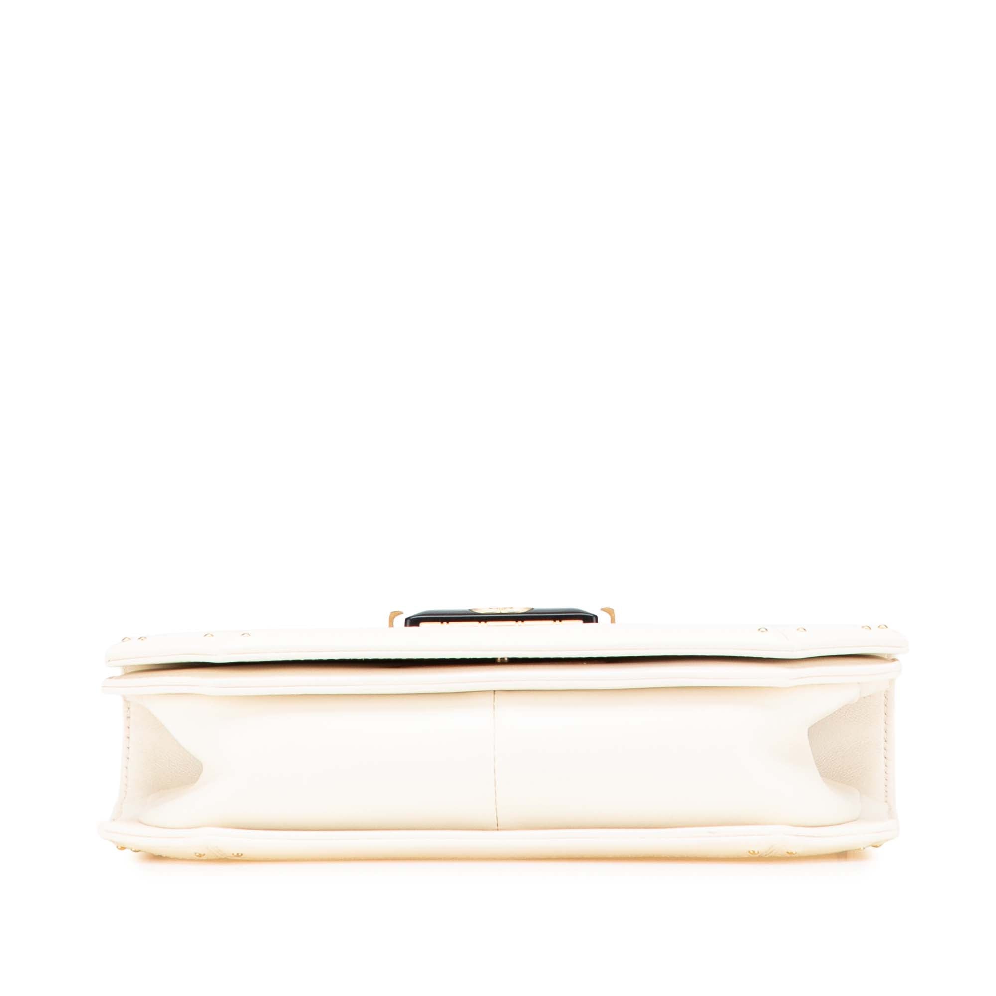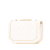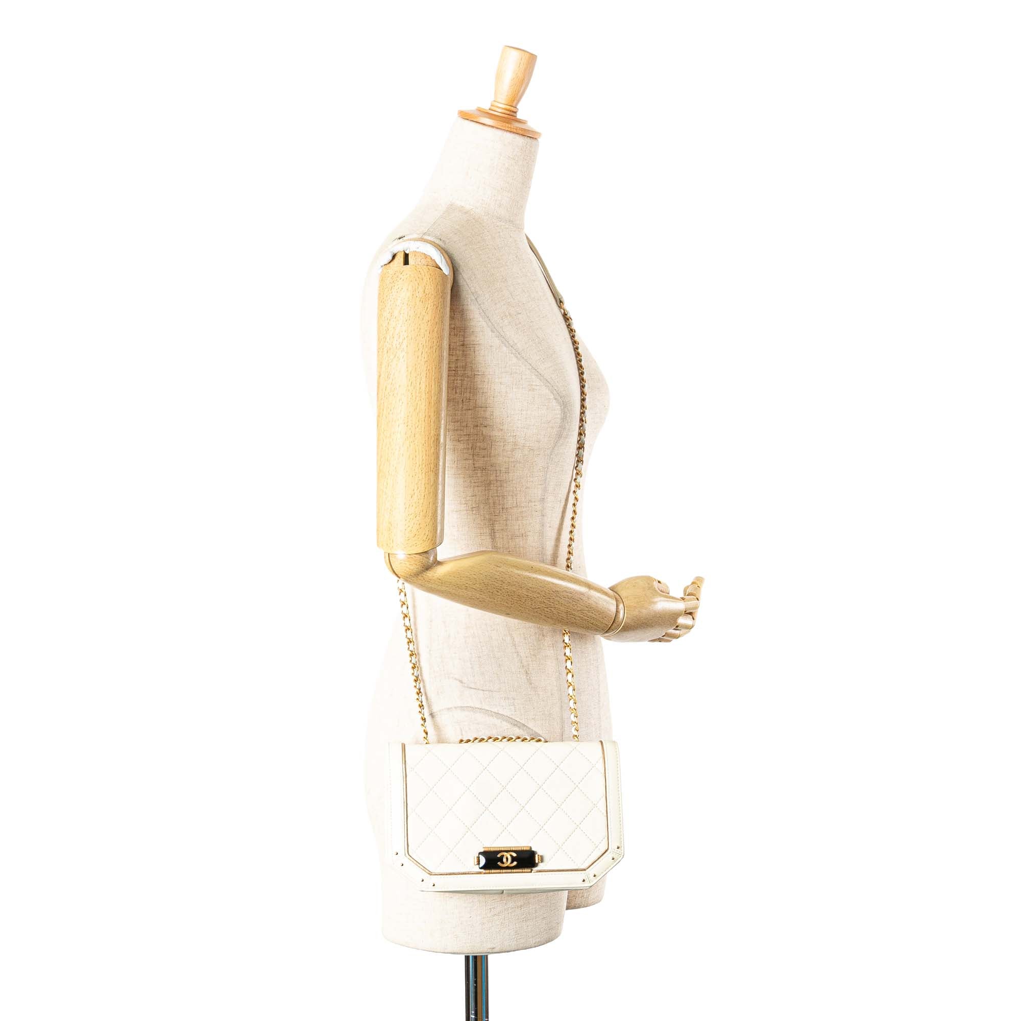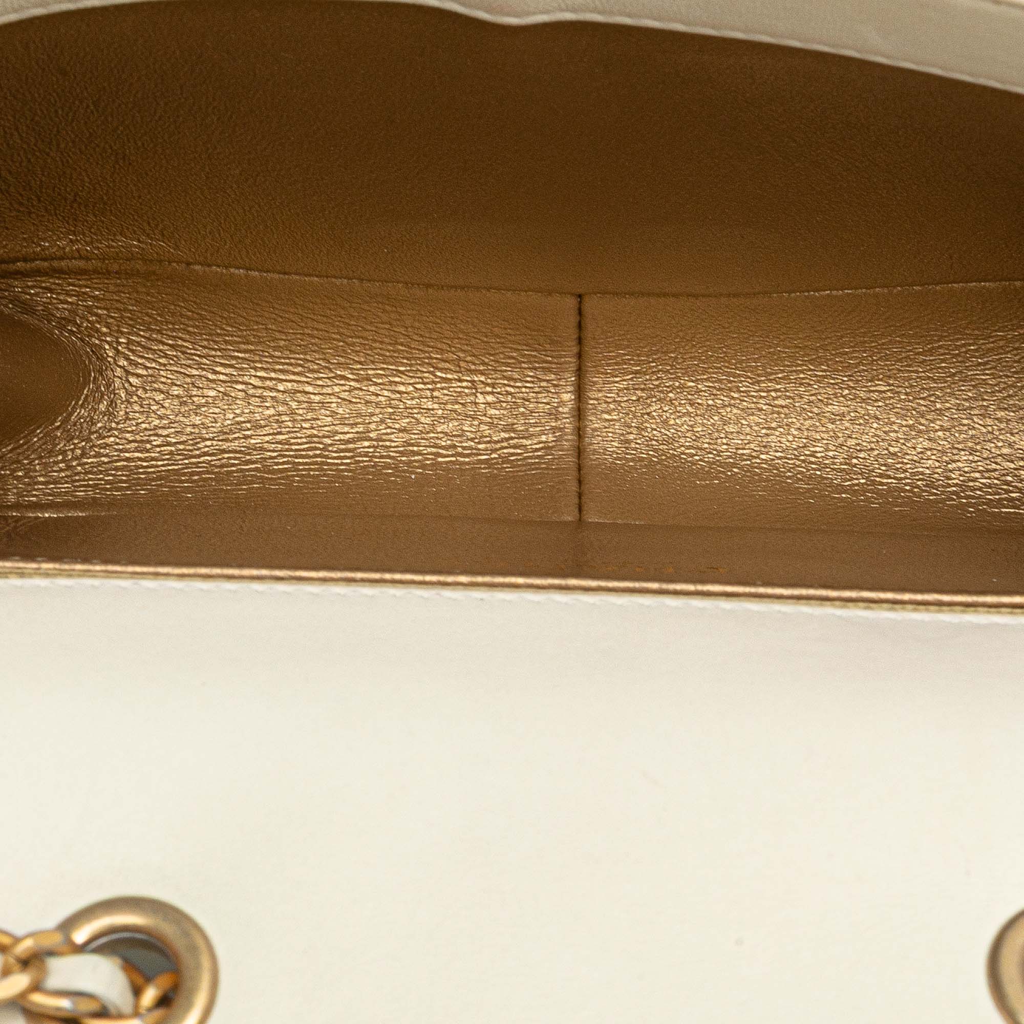 This flap features a quilted calf leather body, a leather woven chain link strap with leather guard, a front flap with a clasp closure, and an interior zip pocket. Inclusion: authenticity card. Retail Price: 3650.00