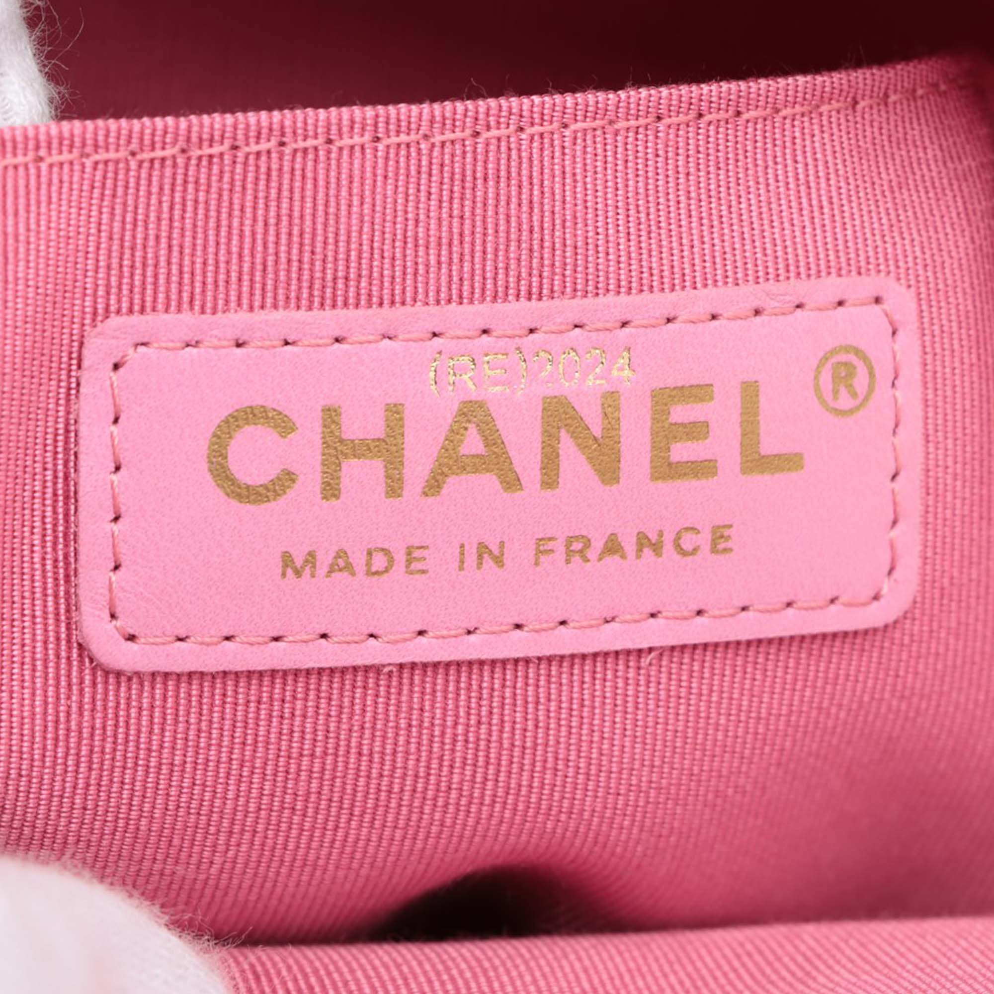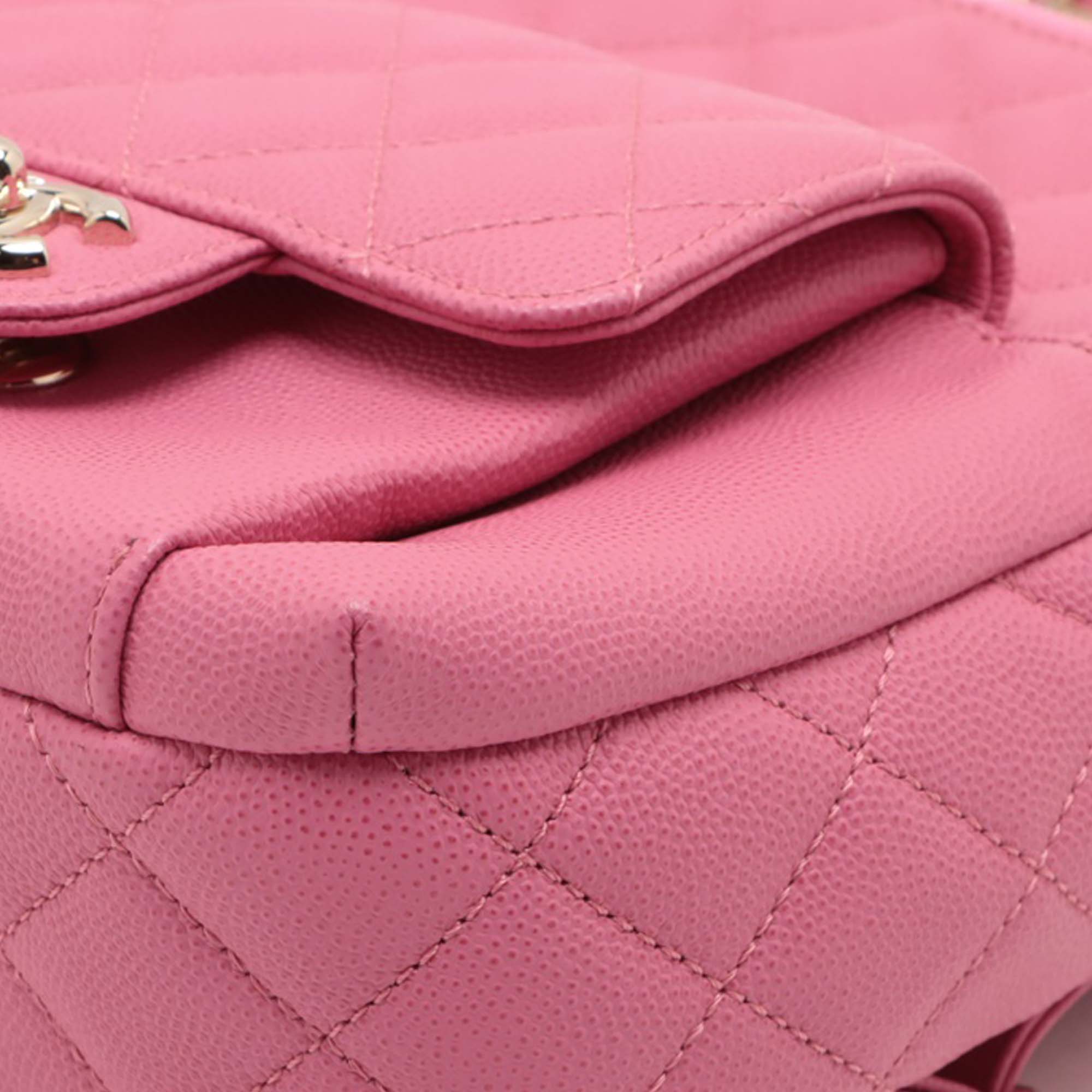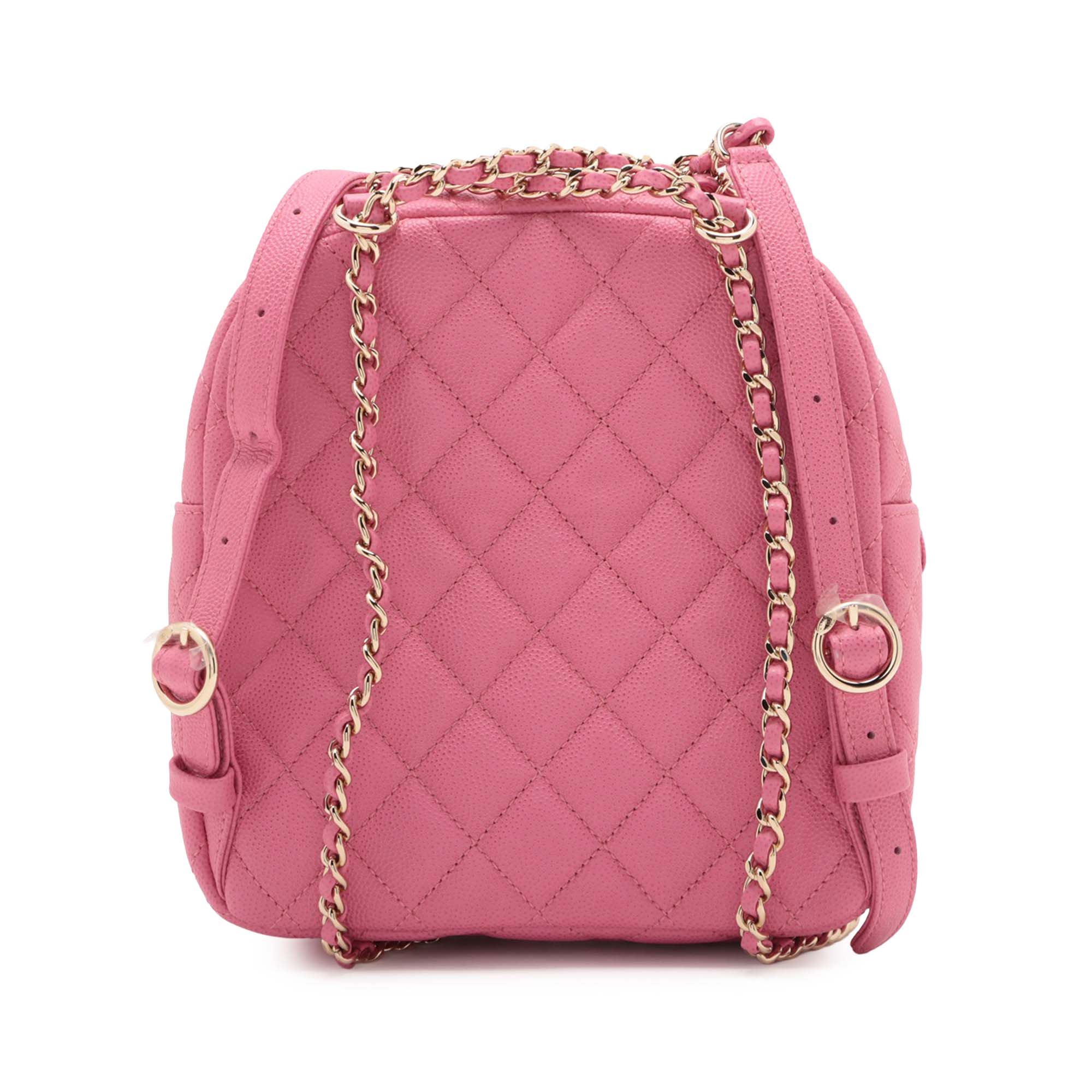 This backpack features a Caviar leather body, flat leather and leather woven chain back straps, a top 2-way zip closure, an exterior front flap pocket with a CC turn lock closure, and an interior slip pocket. Retail Price: 3900.00