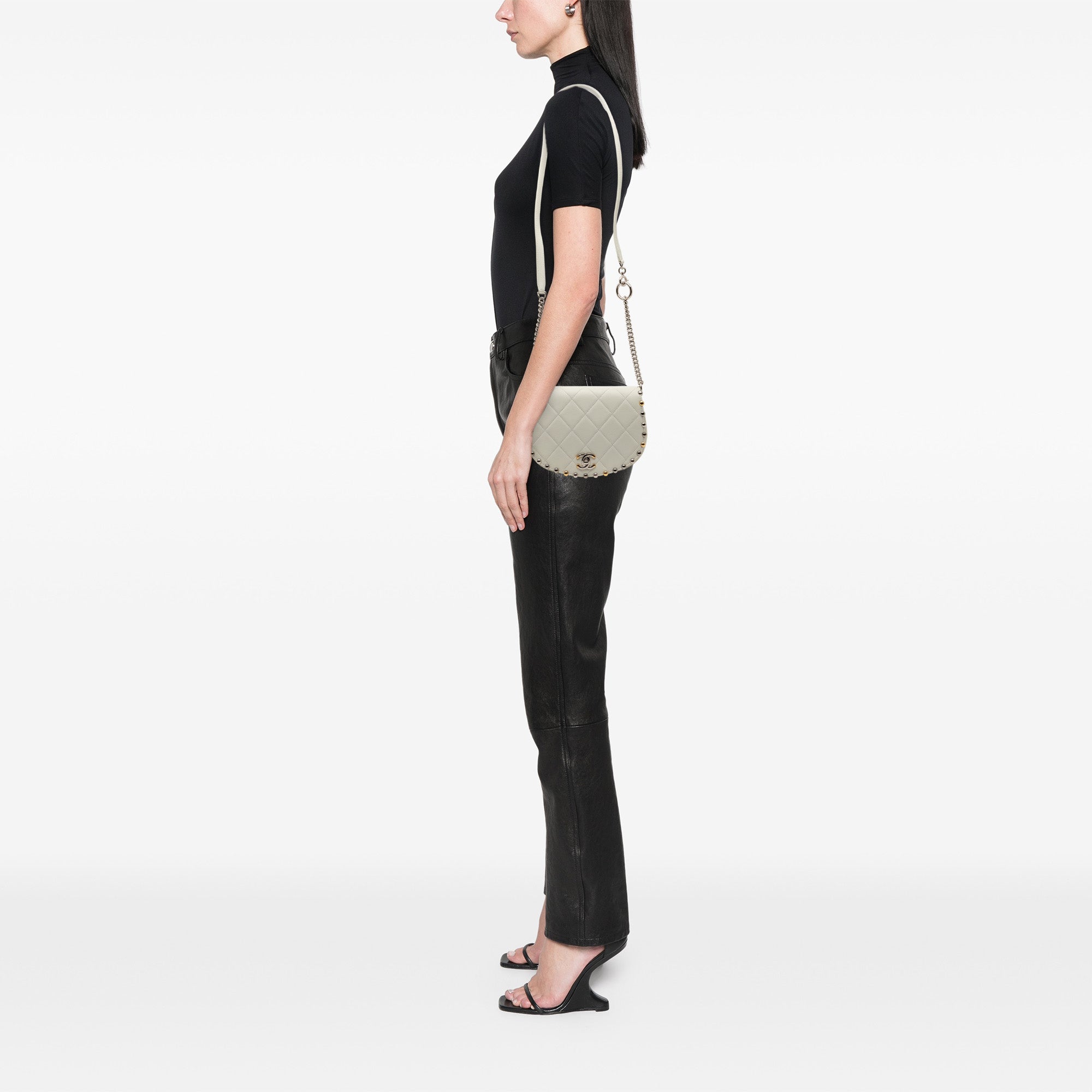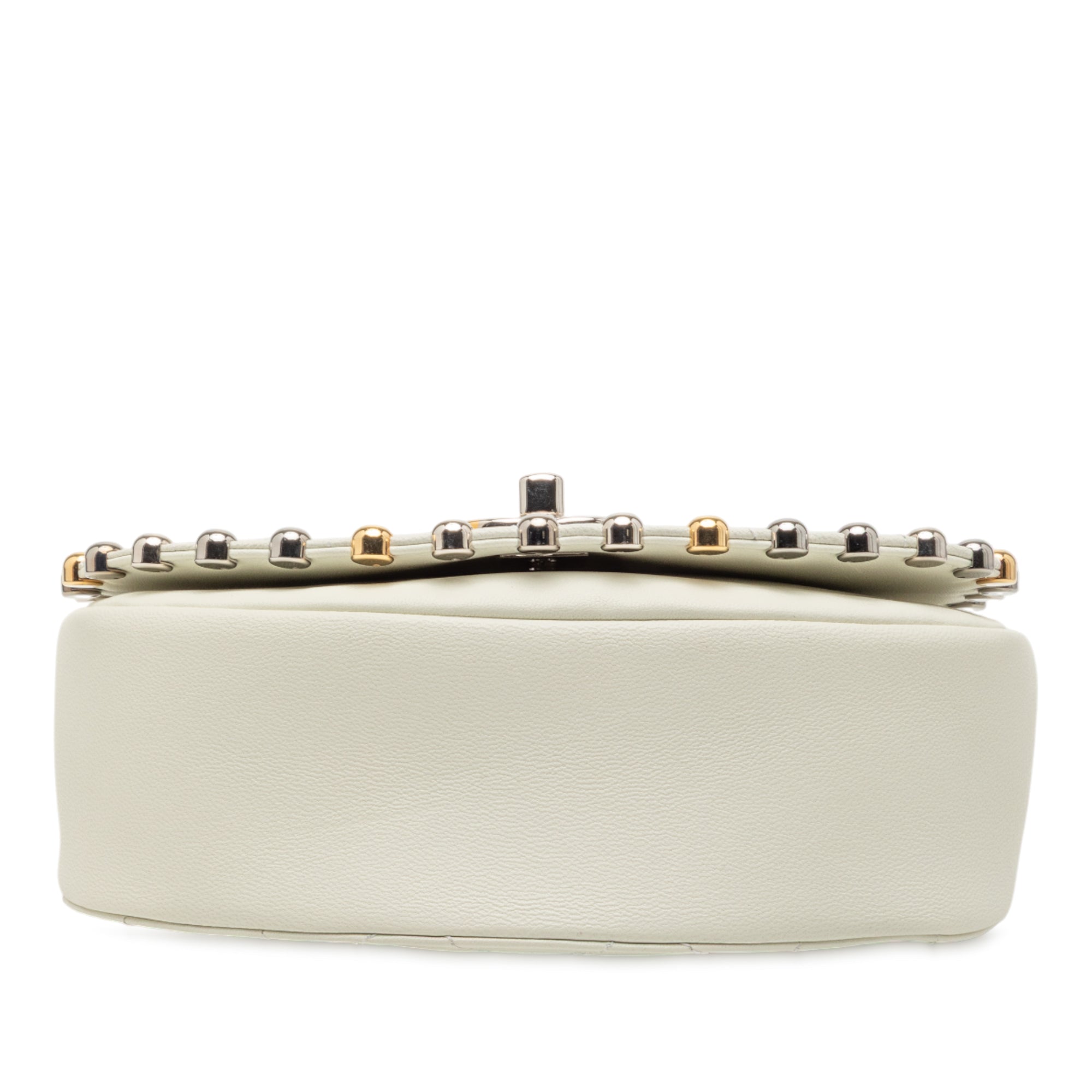 This crossbody bag features a quilted lambskin leather body with studs detail, a flat leather and chain shoulder strap, a front flap with twist lock closure, an exterior back slip pocket, and an interior zip pocket. Retail Price: 7900.00