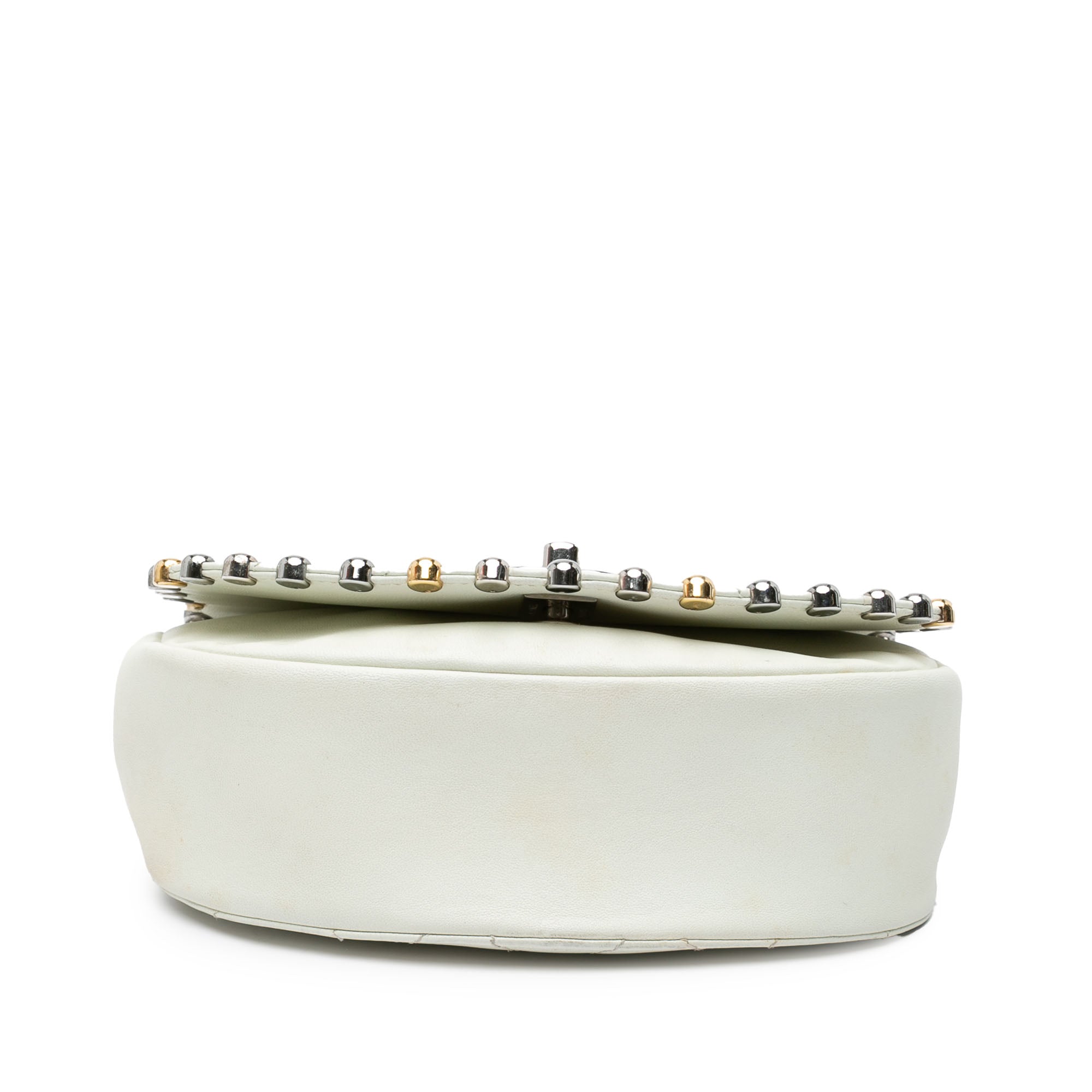This crossbody bag features a quilted lambskin leather body with studs detail, a flat leather and chain shoulder strap, a front flap with twist lock closure, exterior front slip pocket, and an interior zip pocket. Retail Price: 7900.00