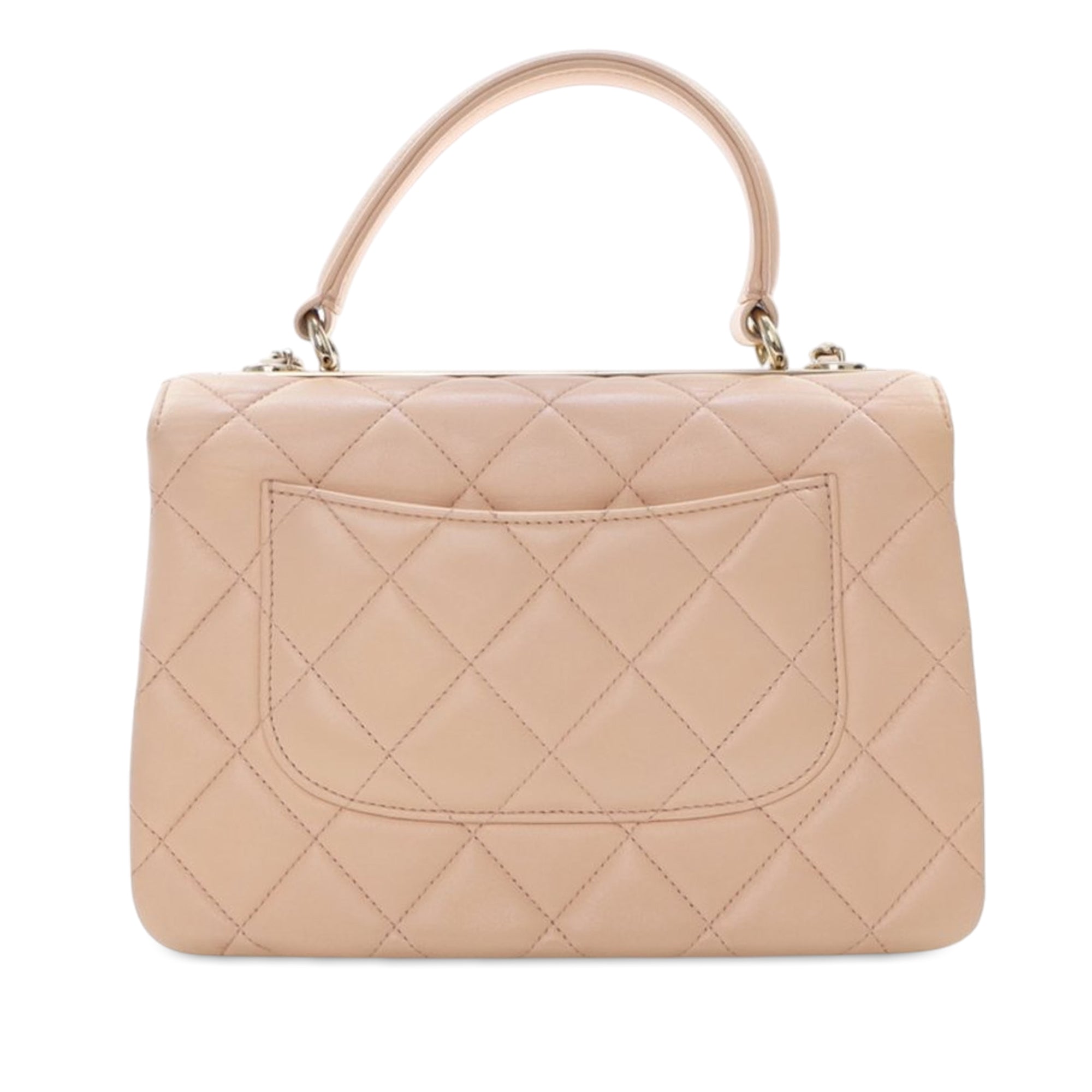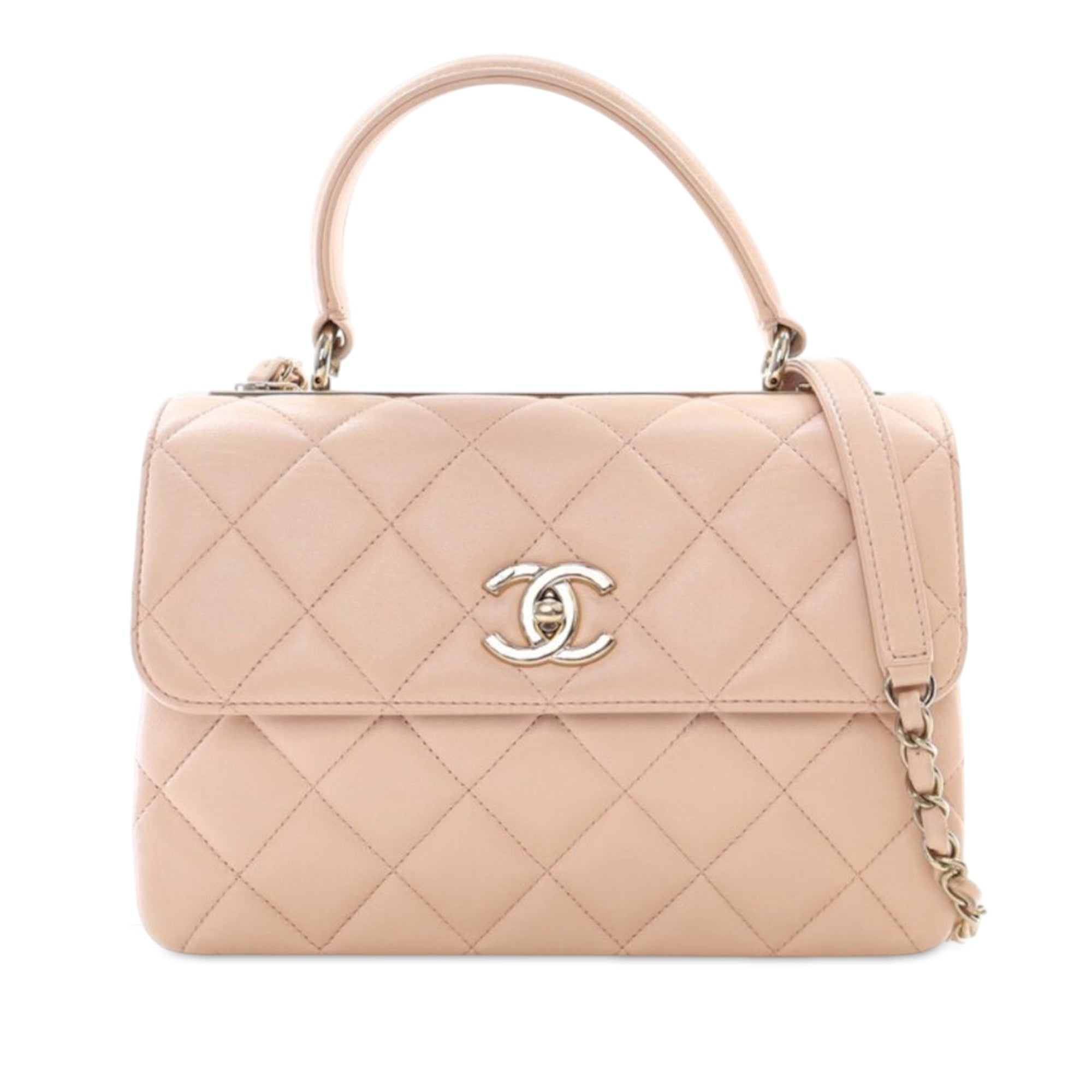 The Trendy CC satchel features a quilted lambskin leather body, a flat leather top handle, a leather-woven chain strap with leather shoulder guard, a front flap with CC turn-lock closure, an exterior back slip pocket, and interior zip and slip pockets. Inclusion: authenticity card. Retail Price: 5560.00