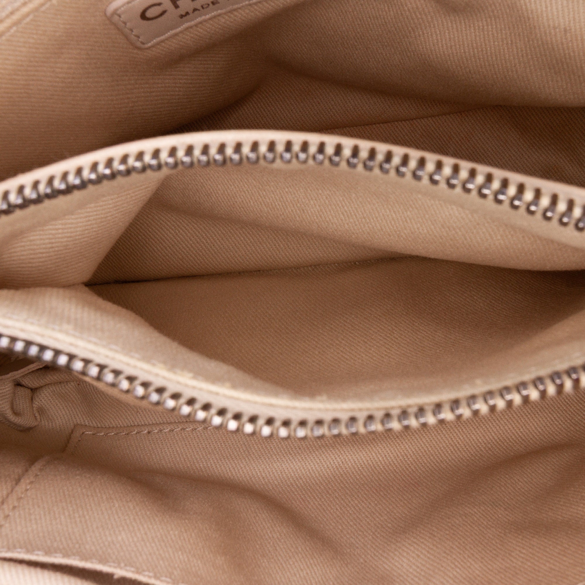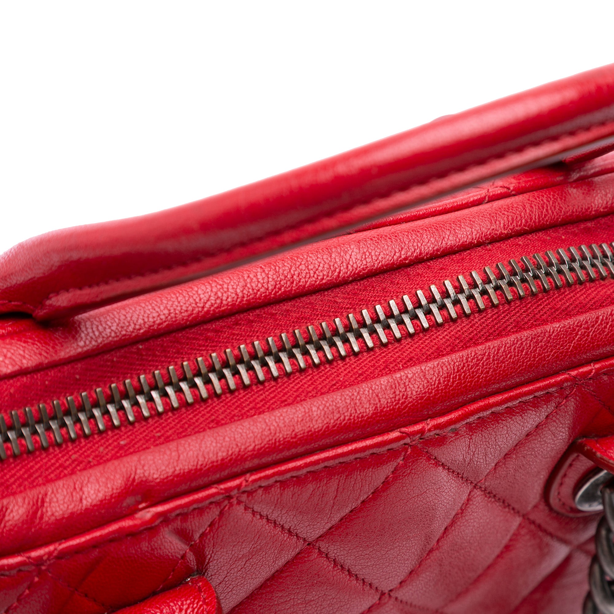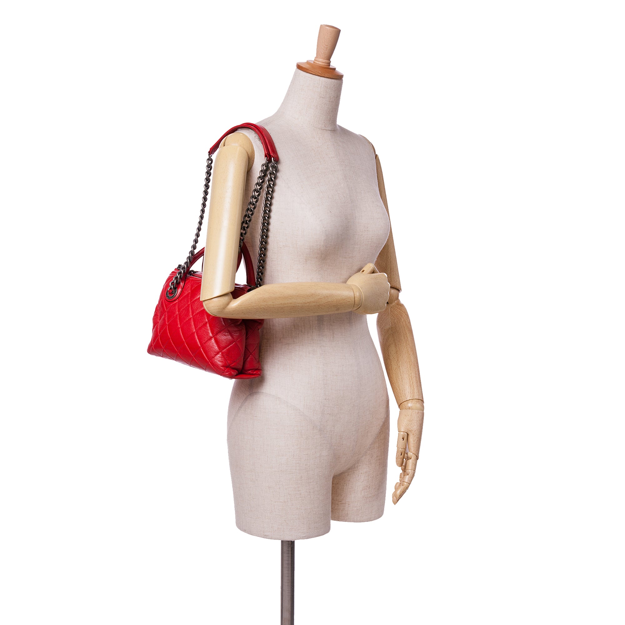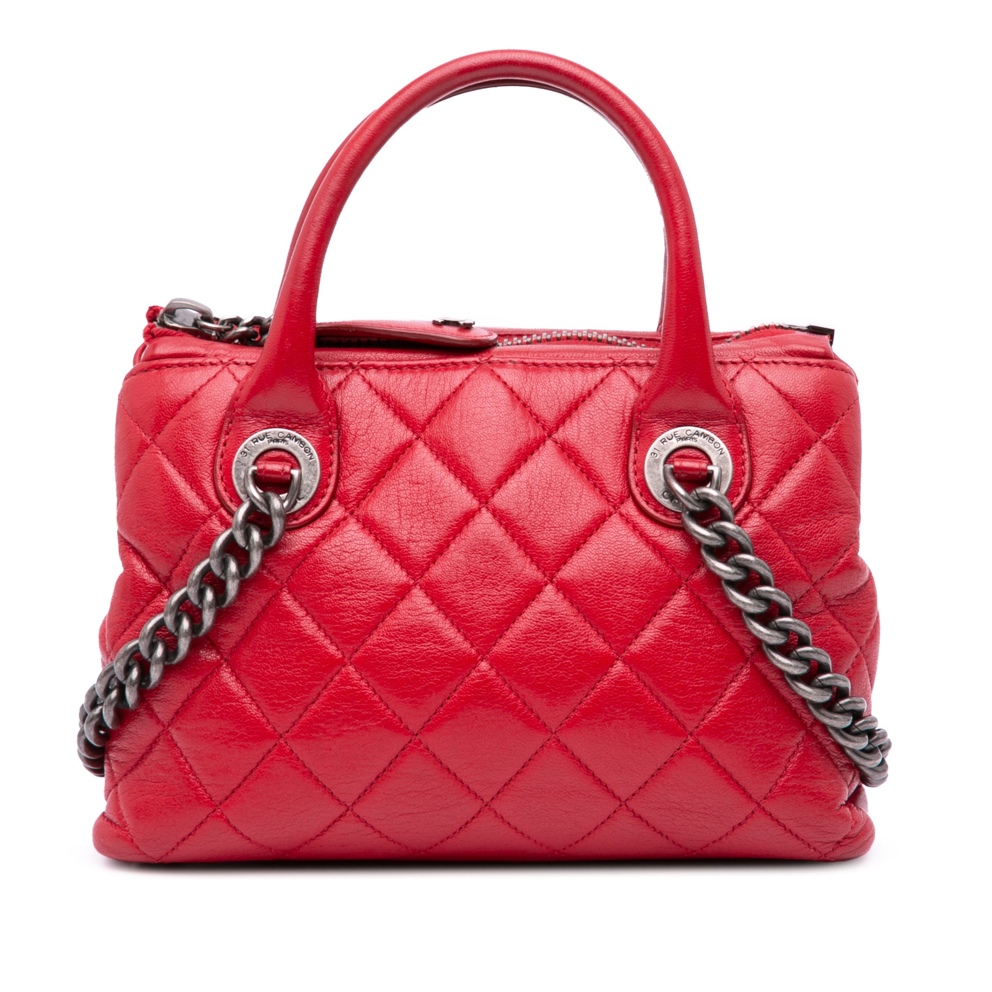 This satchel features a quilted sheepskin leather body, rolled leather top handles, chain link and leather shoulder straps, a top zip closure, an interior zip compartment, and interior zip and slip pockets. Retail Price: 3100.00