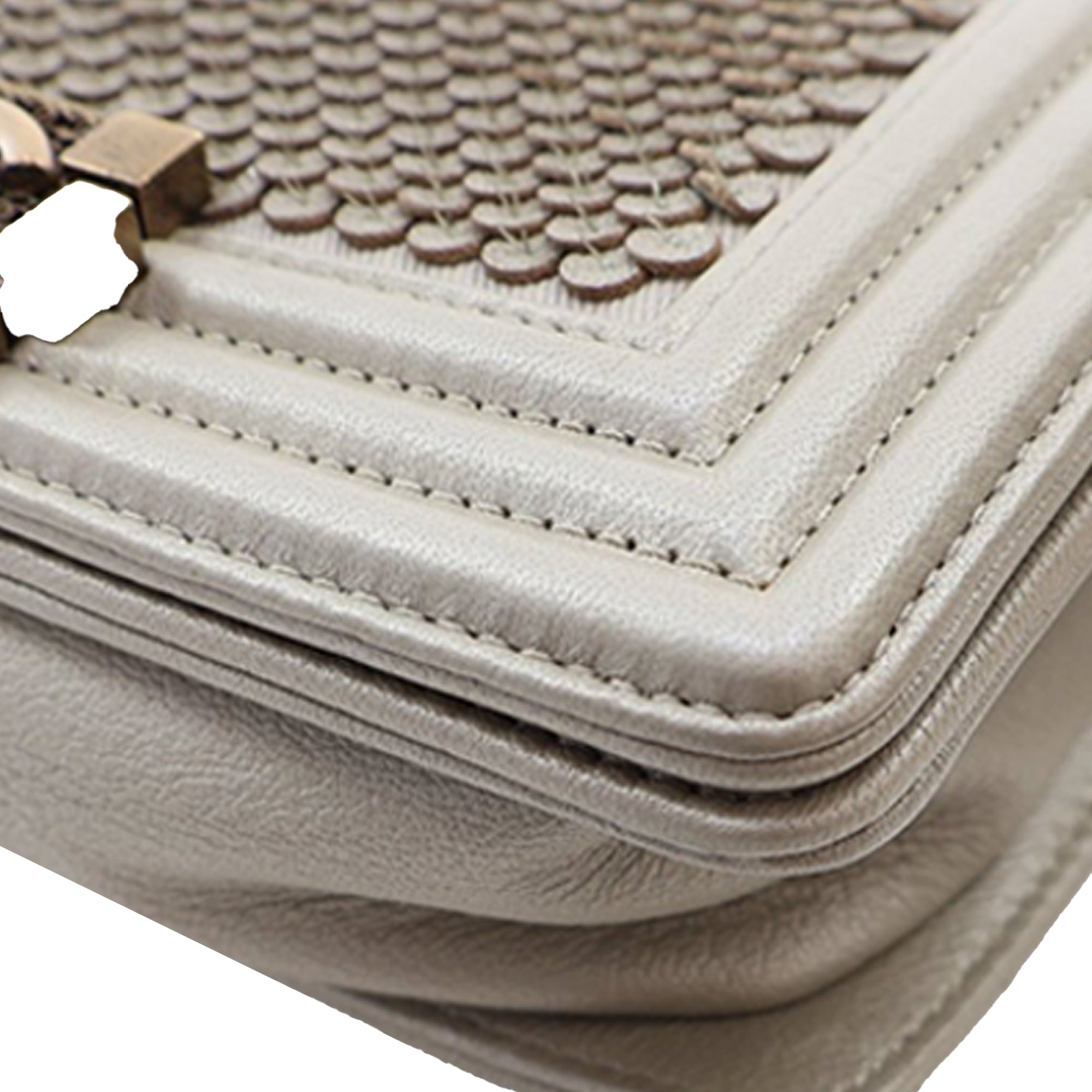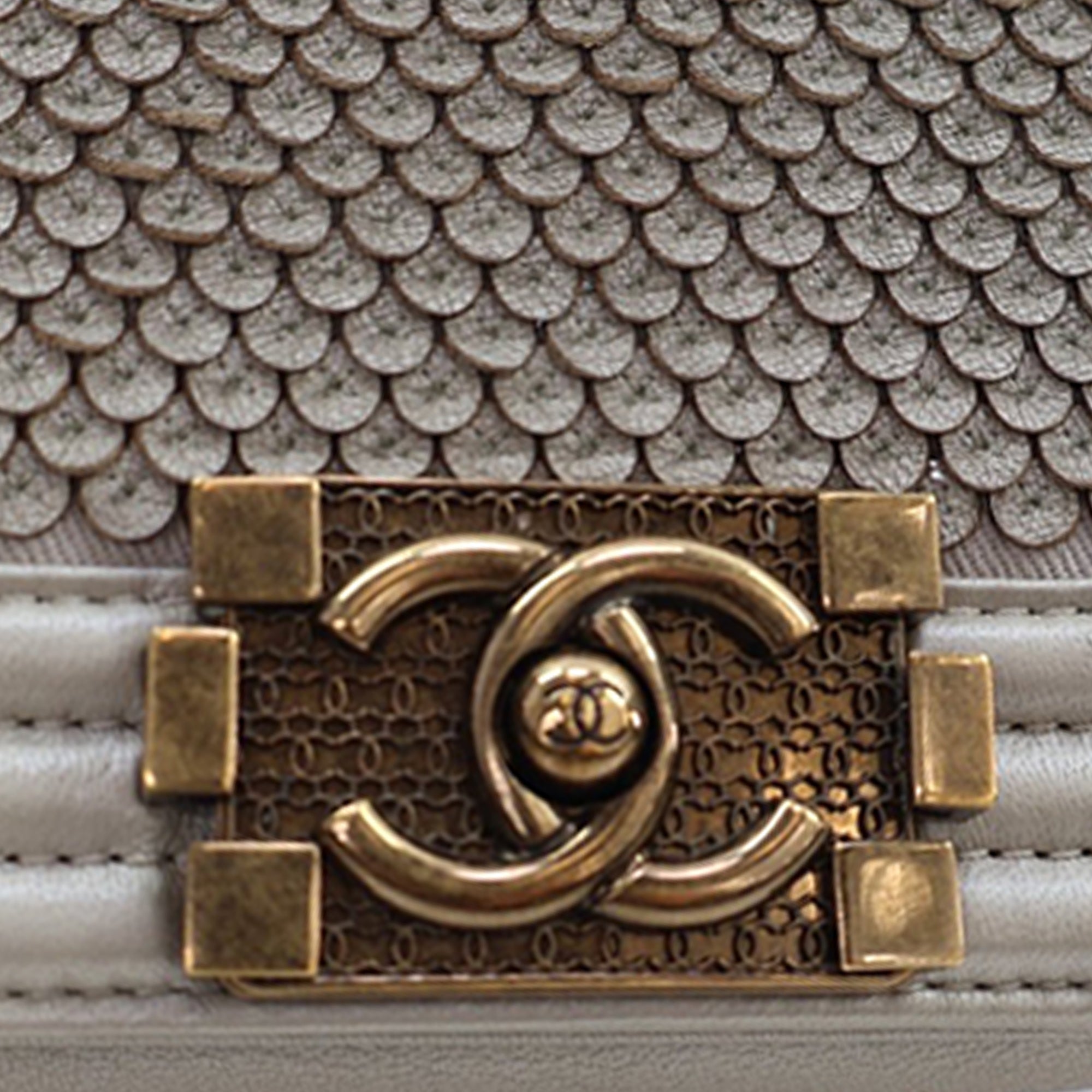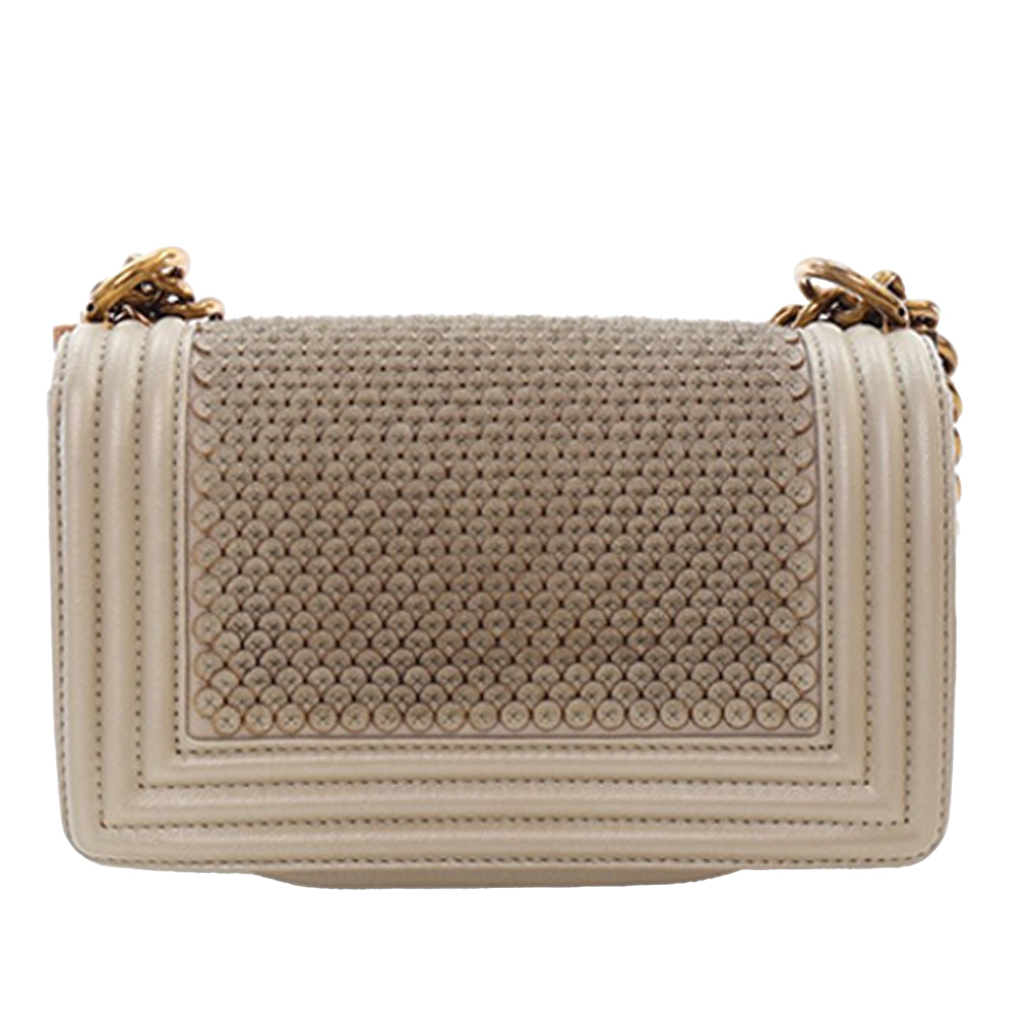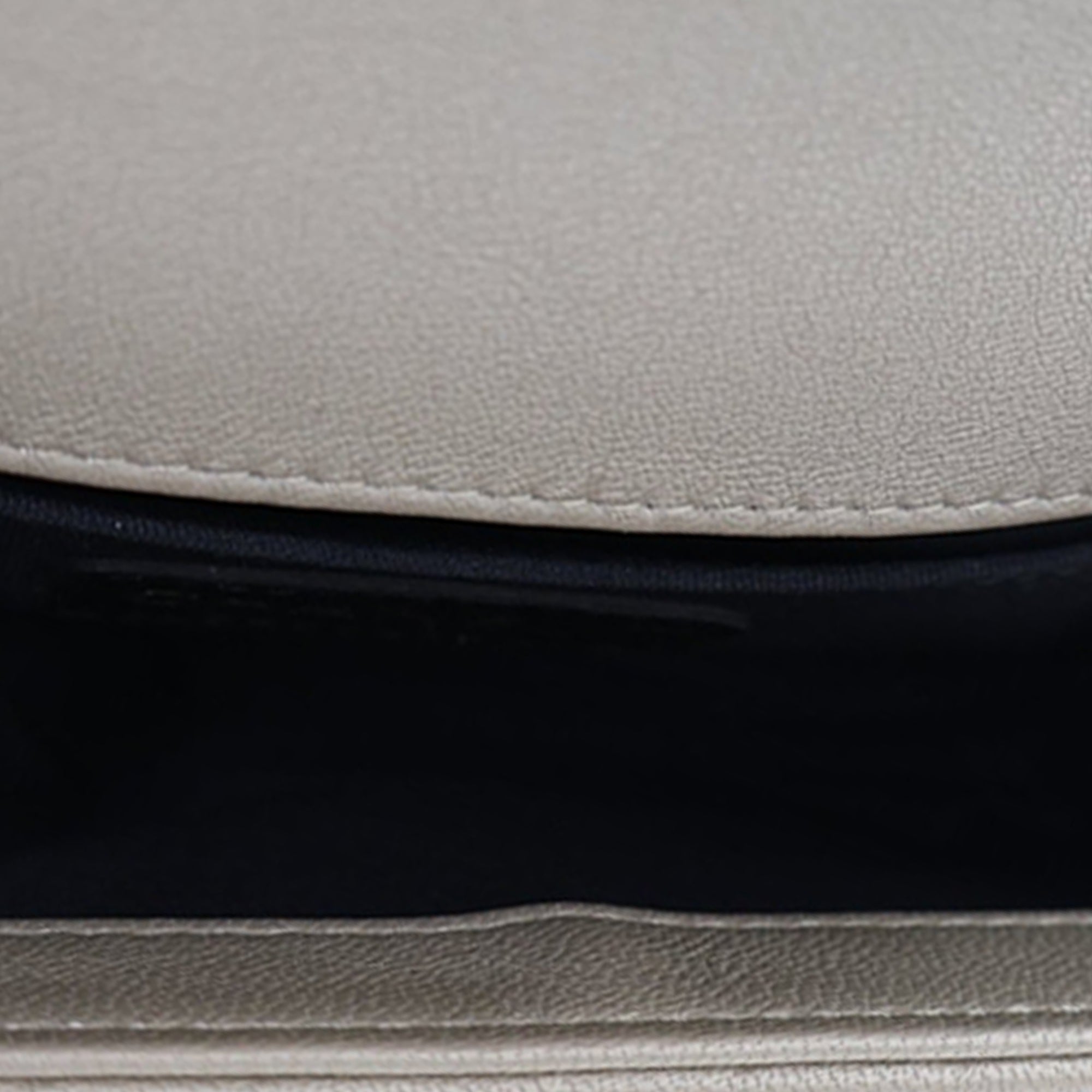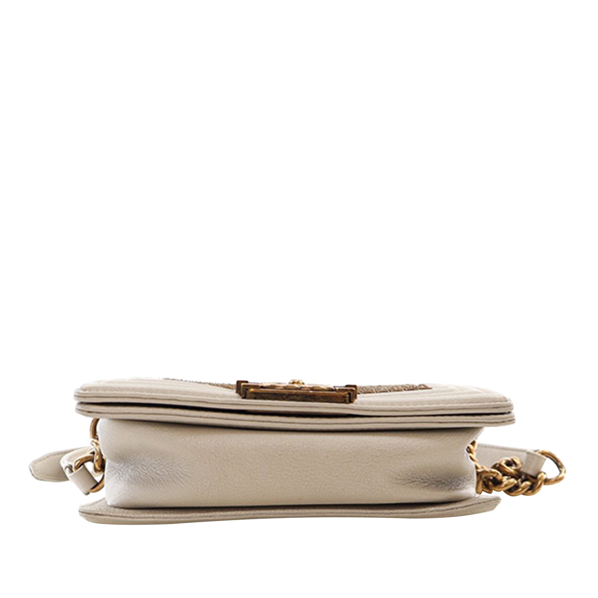 The Boy flap bag features a lambskin leather body, a curb chain and flat leather shoulder strap, a front flap with push-lock closure, and an interior slip pocket. Inclusion: authenticity card. Retail Price: 5002.00