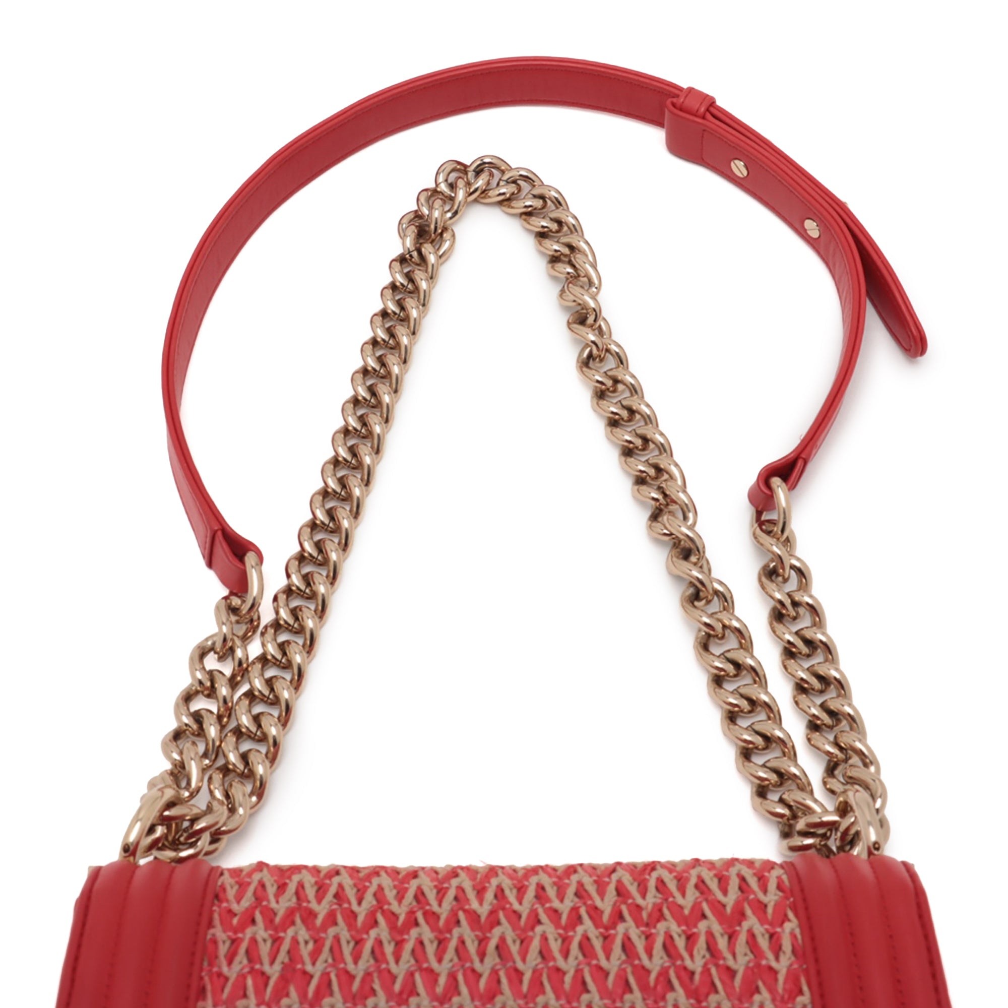 The Boy Flap bag features a woven straw and lambskin leather body, a chain link and leather shoulder strap, a flap with push-lock closure, and an interior slip pocket. Retail Price: 3700.00
