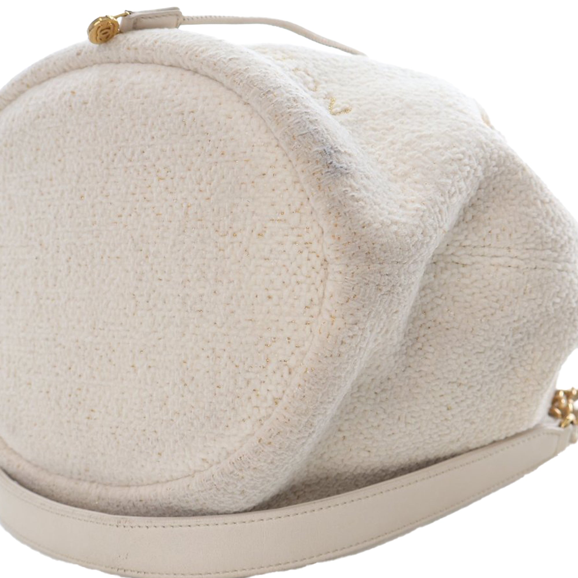 This bucket bag features a tweed body, a curb chain strap, a top drawstring closure, and an interior zip pocket. Inclusion: Dust bag. Retail Price: 2900.00