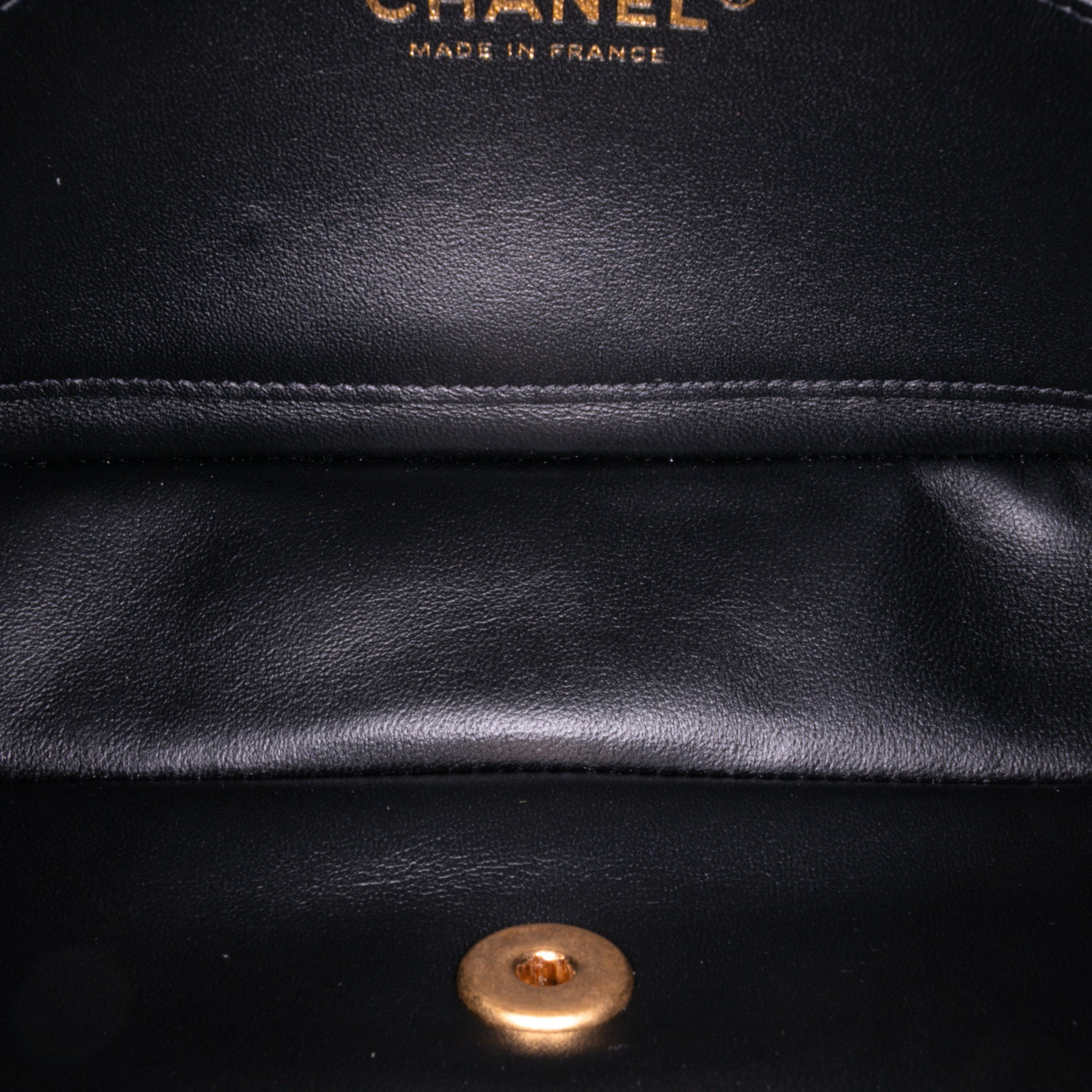 This crossbody bag features a tweed body with pearl detail, a leather woven strap, a front flap with interlocking Cs and a twist lock closure, and an interior zip pocket. Retail Price: 7000.00