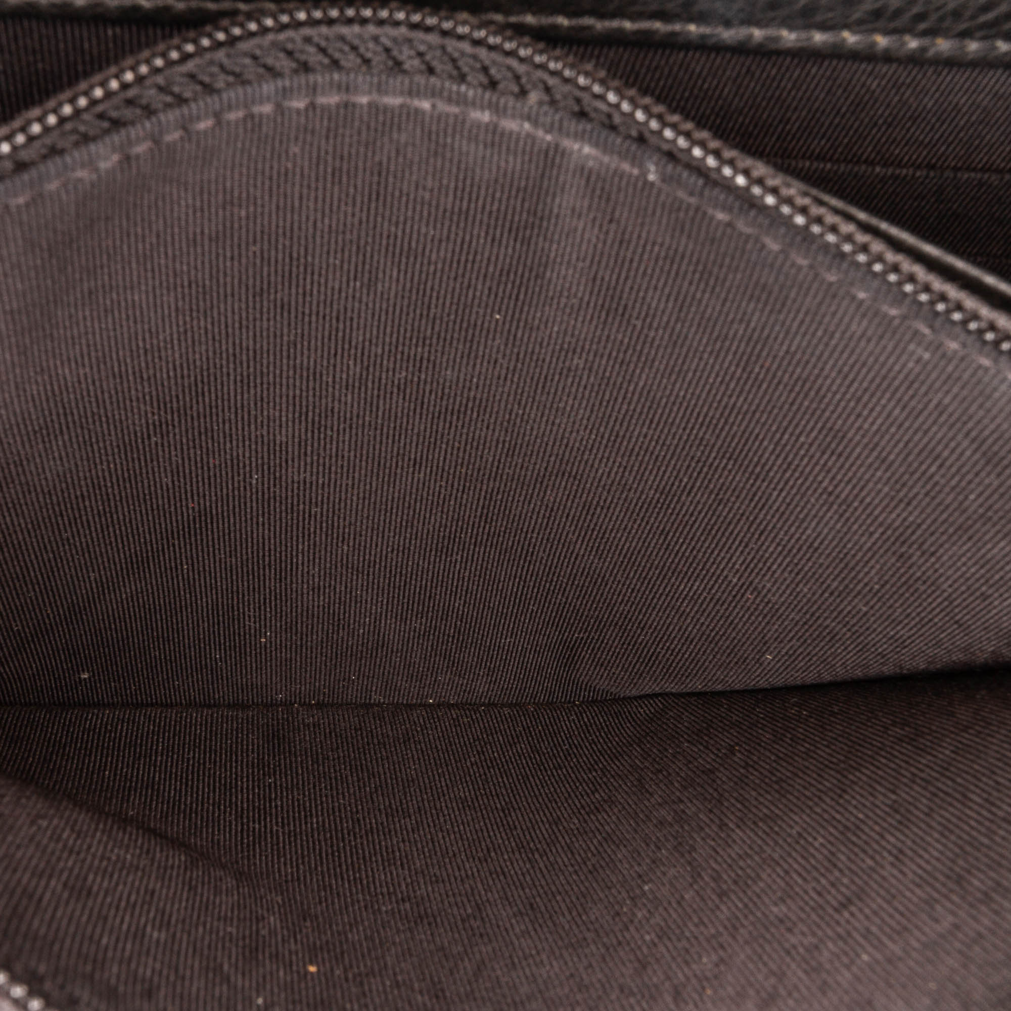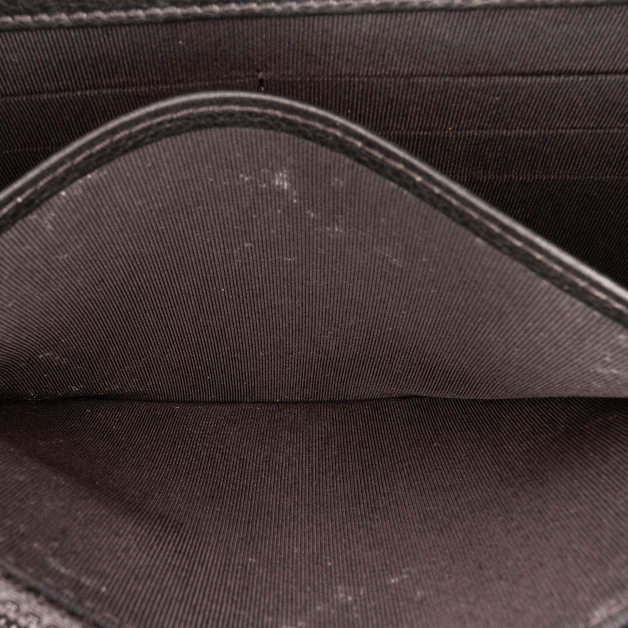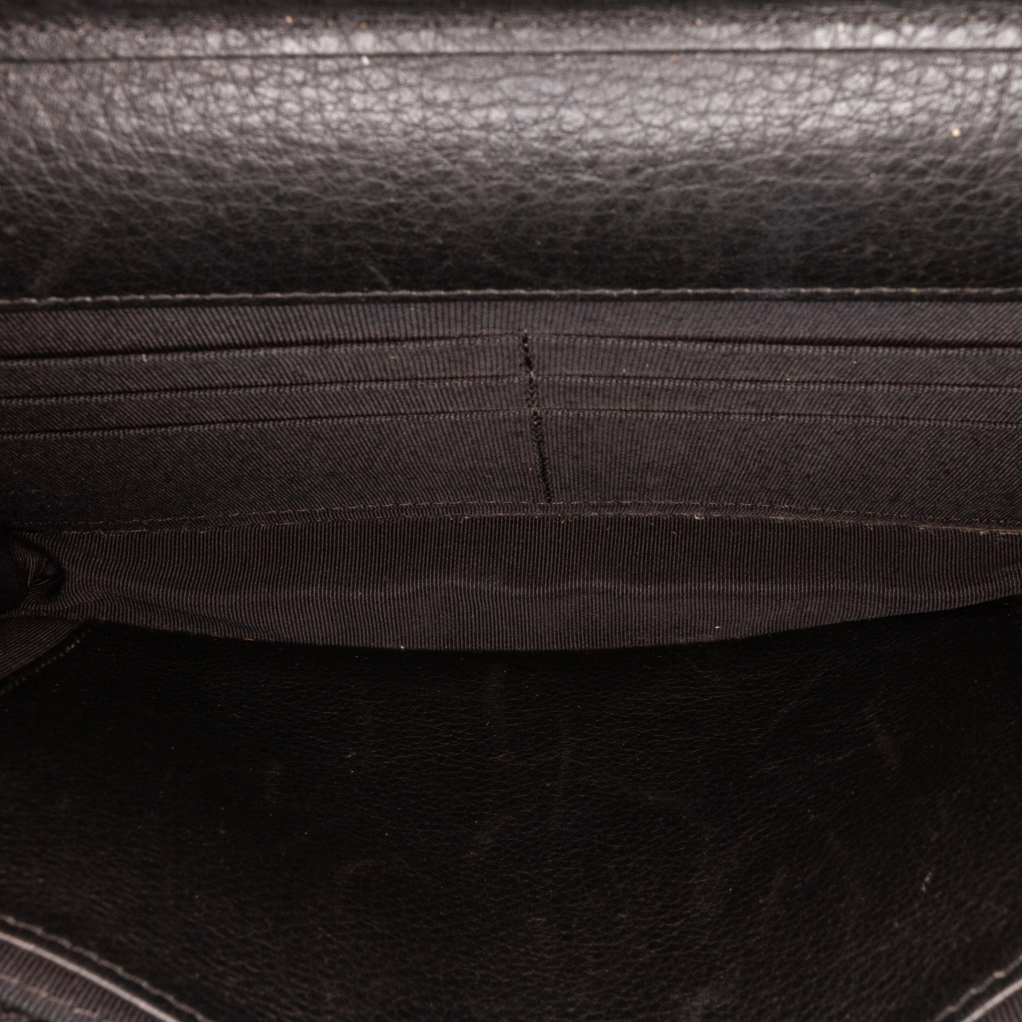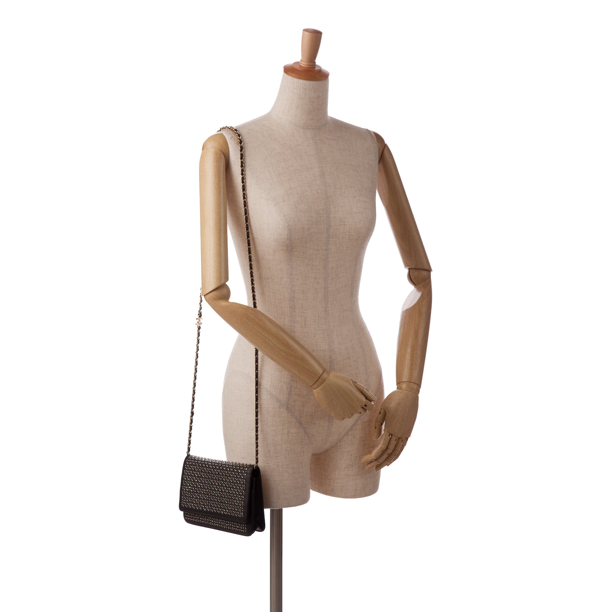 This wallet on chain features a studded leather body, a woven leather chain strap, an interior zip compartment, and interior slip pockets. Retail Price: 6950.00