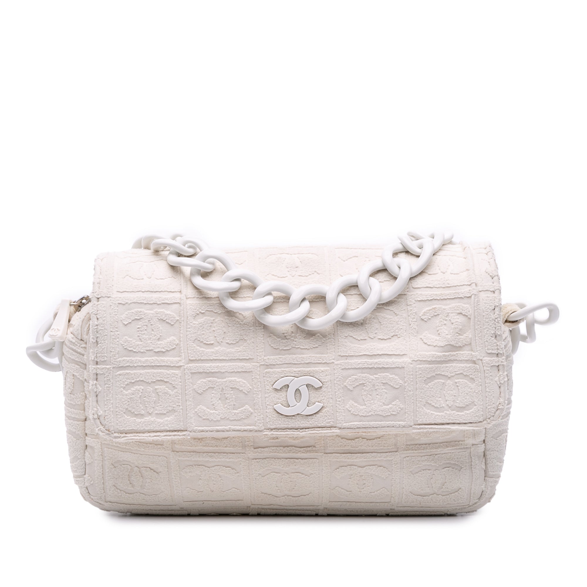 This flap bag features a terry cloth body, a resin chain strap, a front flap with magnetic snap closure, and an interior slip pocket. Retail Price: 3100.00