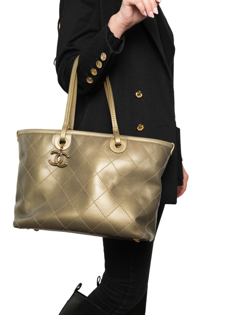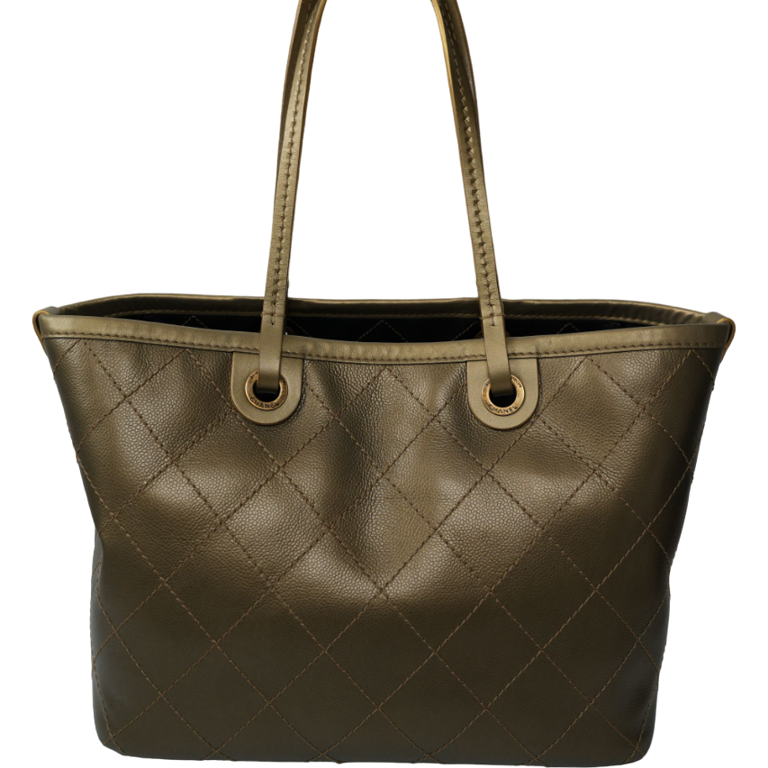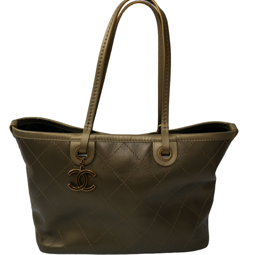 Chanel Tote Bag. Khaki leather iridescent. CC charm on the front. khaki stitching. With hologram. perfect condition. Sold individually. Dimensions. Width: 45 cm. Height: 25 cm. Depth: 15cm