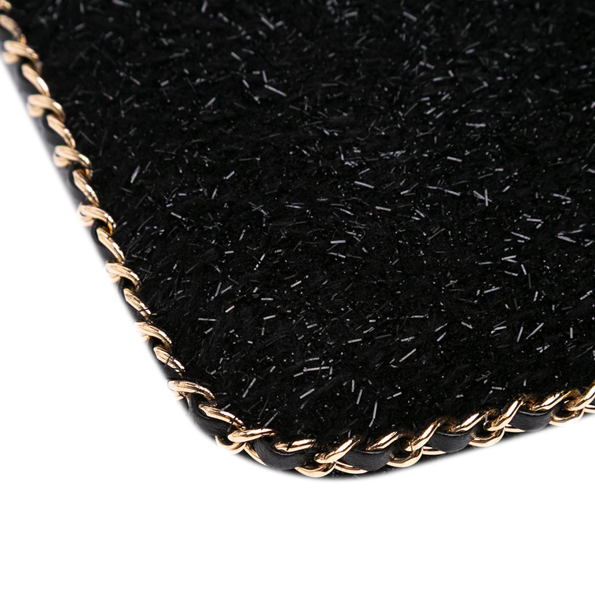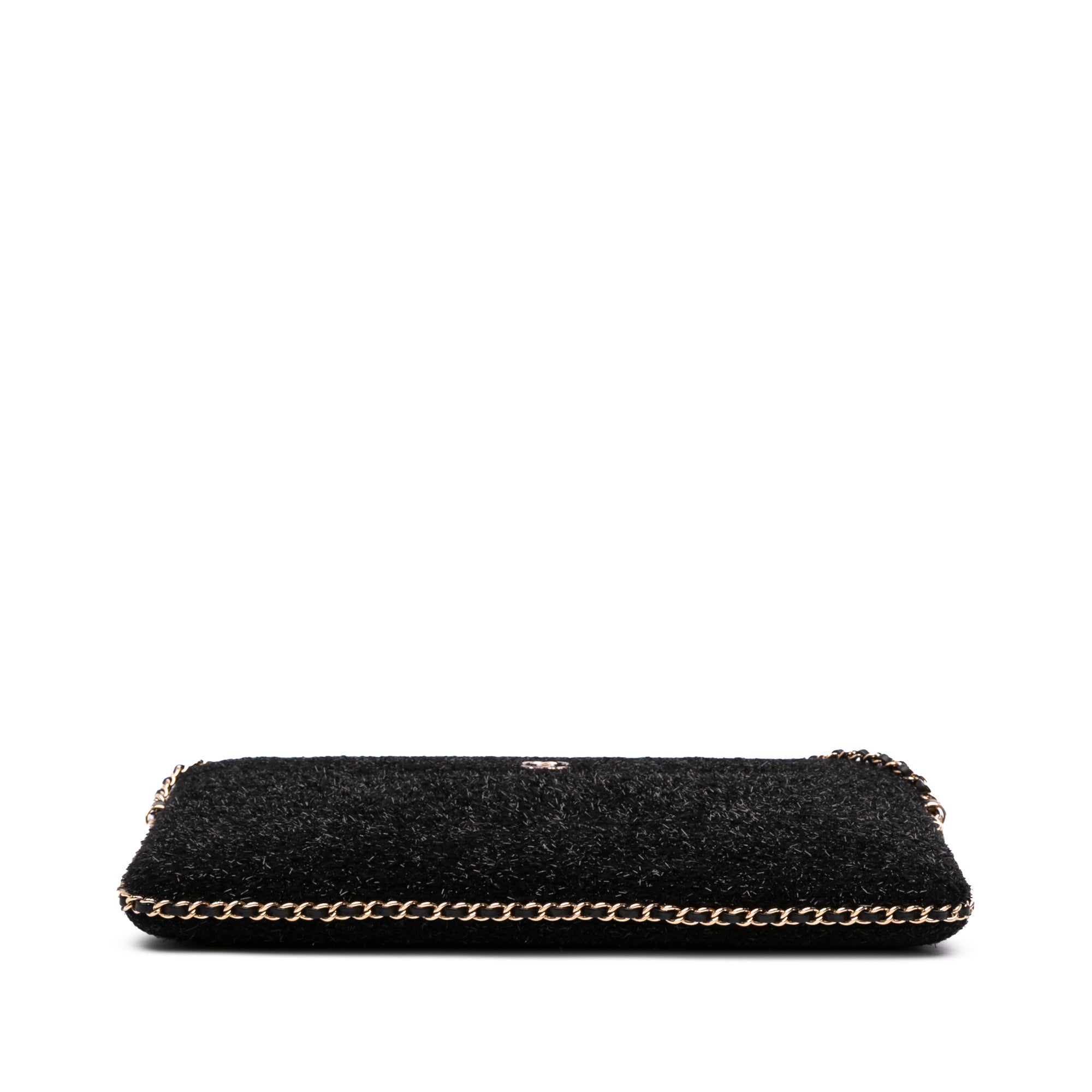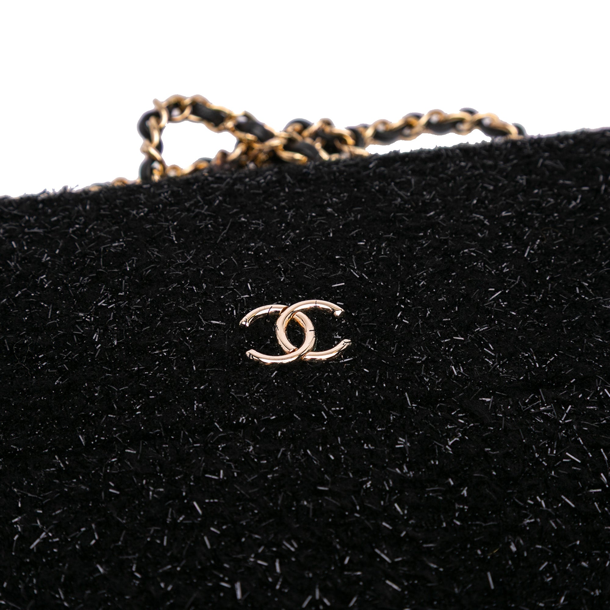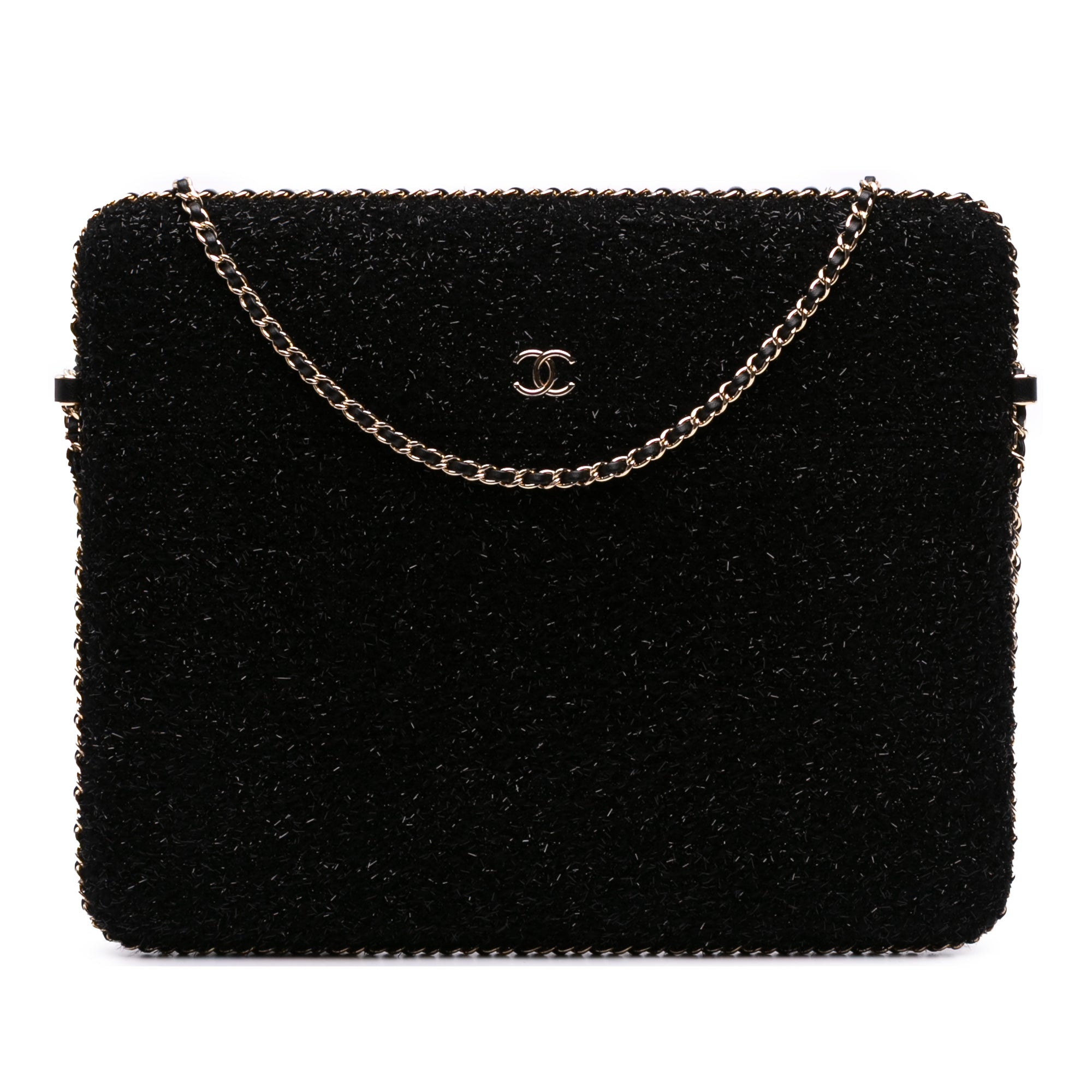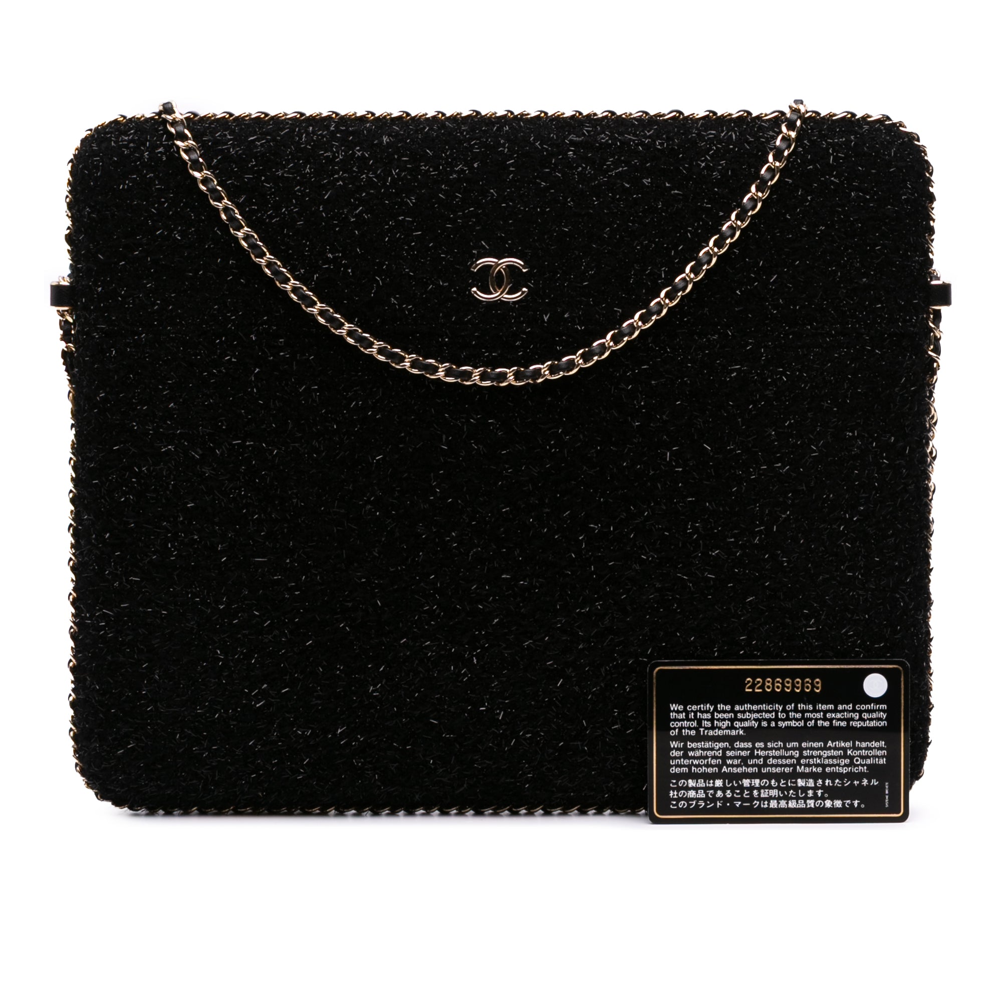 This crossbody features a tweed body with chain embellishment, a leather-woven chain strap, and a top removable cap closure. Inclusion: authenticity card. Retail Price: 2450.00