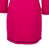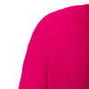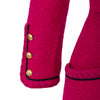 This Chanel Vintage Long Jacket from the 80s is crafted with wool in a fuchsia pink color and boasts a double breasted design with golden CC embossed buttons. The long and fitted silhouette is complemented by four pockets and threaded trims, making it a classic and elegant addition to any wardrobe.