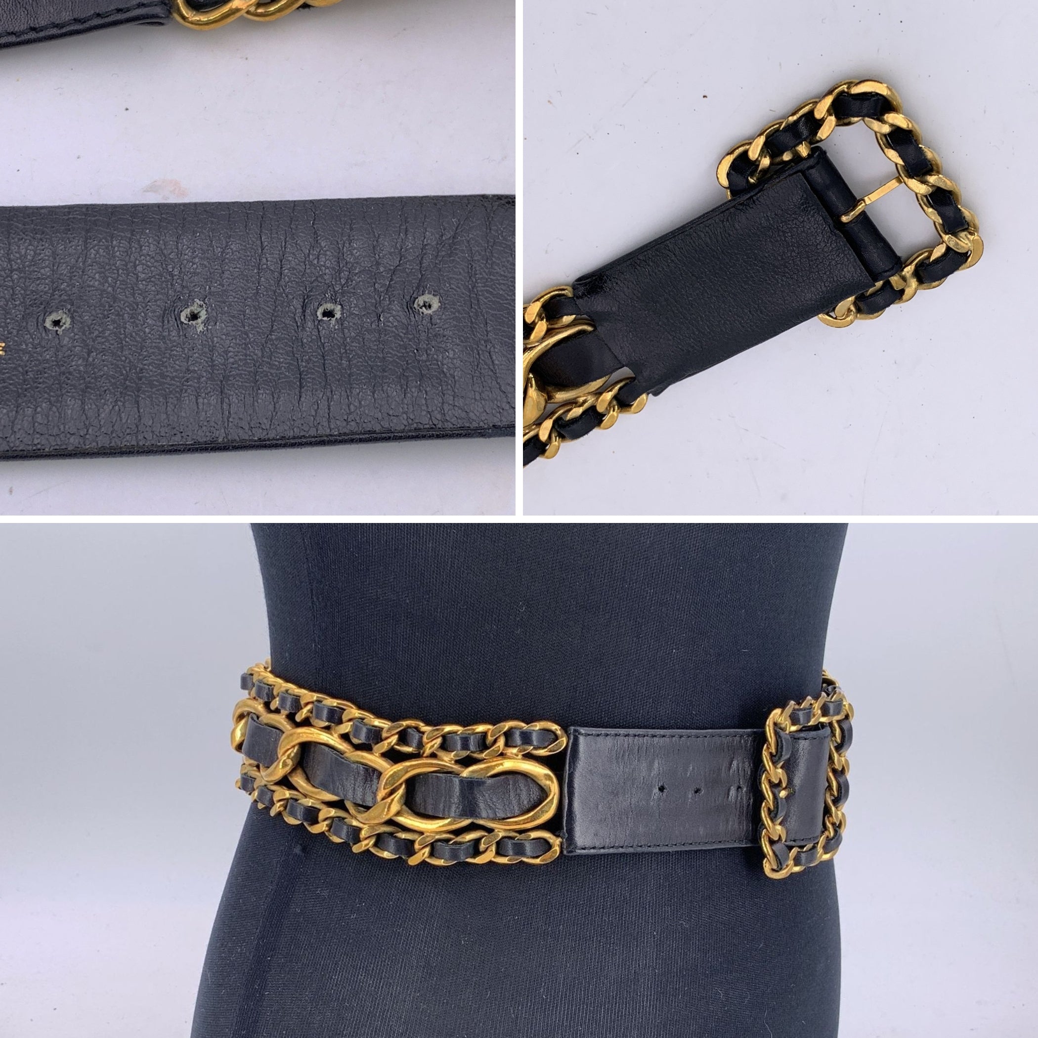 This Vintage Chanel Belt Captures Everything We Love About The Maison's Golden Era - Bold Hardware, Decadent Chains, And That Unmistakable Parisian Glamour. Crafted In Smooth Black Leather, The Belt Is Framed By Interlaced Gold-tone Chains, a Signature Chanel Detail That Instantly Recalls The Iconic Handbag Straps Invented By Gabrielle Herself. The Design Feels Both Luxurious And Tactile: The Warm Glow Of The Chains Contrasts Beautifully With The Softness Of The Leather, Creating a Piece That Drapes The Waist With Effortless Sophistication. At The Center Sits a Chain-framed Buckle, Sculptural And Confident, Echoing The Couture Spirit Of 1980s And 1990s Chanel Accessories. This Is The Kind Of Belt That Transforms An Outfit - Cinched Over a Blazer, Paired With a Simple Dress, Or Added To Denim For a Touch Of Vintage Opulence. A True Collector's Piece, Rich With The Heritage And Craftsmanship That Make Chanel's Archives Endlessly Coveted. Size 70/28. Width: 1.5 Inches - 3.8 Cm. Total Length Of The Strap: 31 Inches - 78.7 Cm. From Buckle To First Notch (Max. Circumference): 28.75 Inches - 73 Cm. From Buckle To Last Notch (Min. Circumference). 26.6 Inches - 67,3 Cm