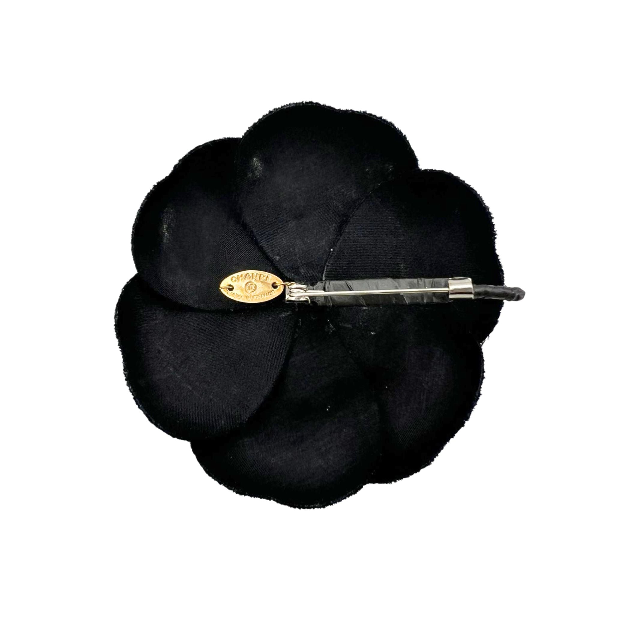 Chanel Vintage Camelia Camellia Flower Pin Brooch. Black Satin Petals. Safety Pin Closure. Measurements: Diameter: 2.5 Inches - 6.3 Cm . 'Chanel - Cc - Made In France' Oval Tab On The Back