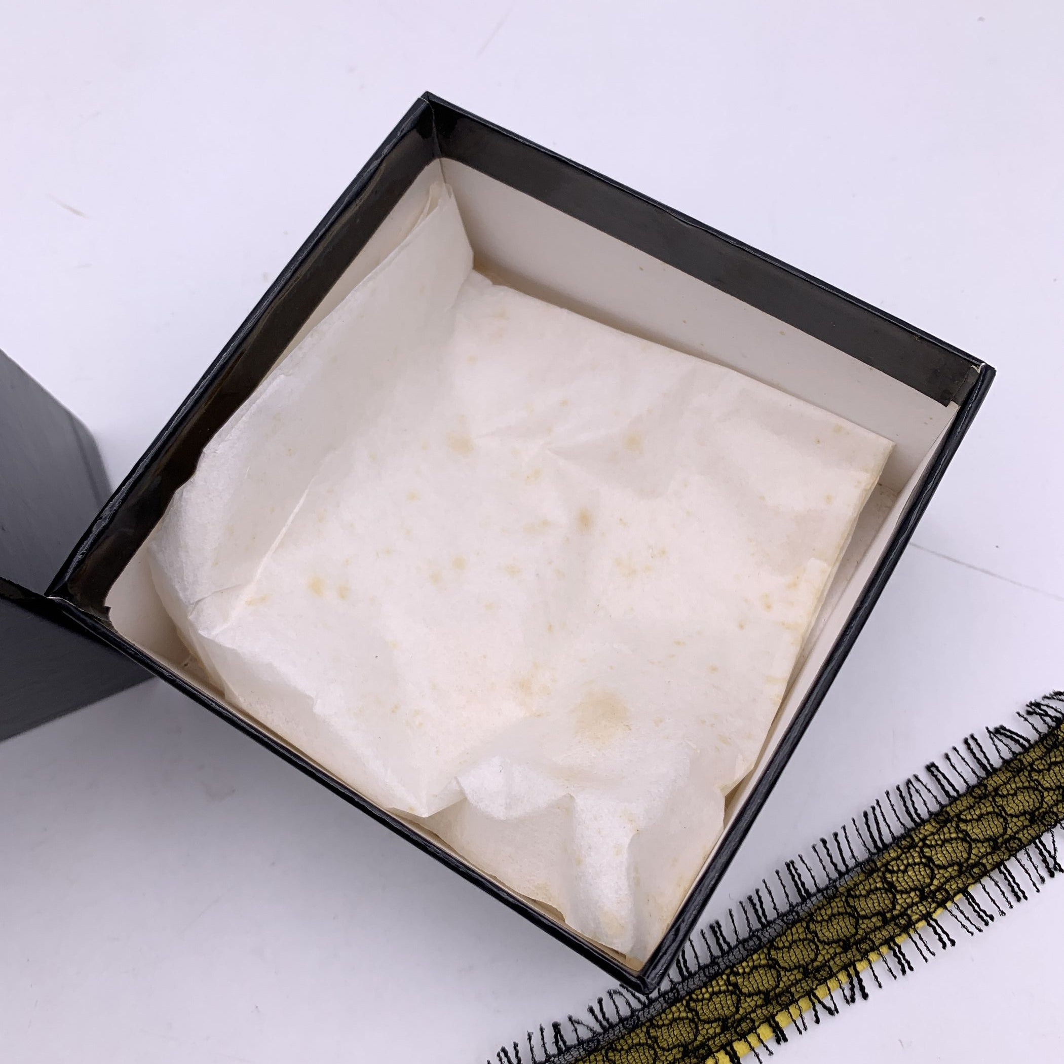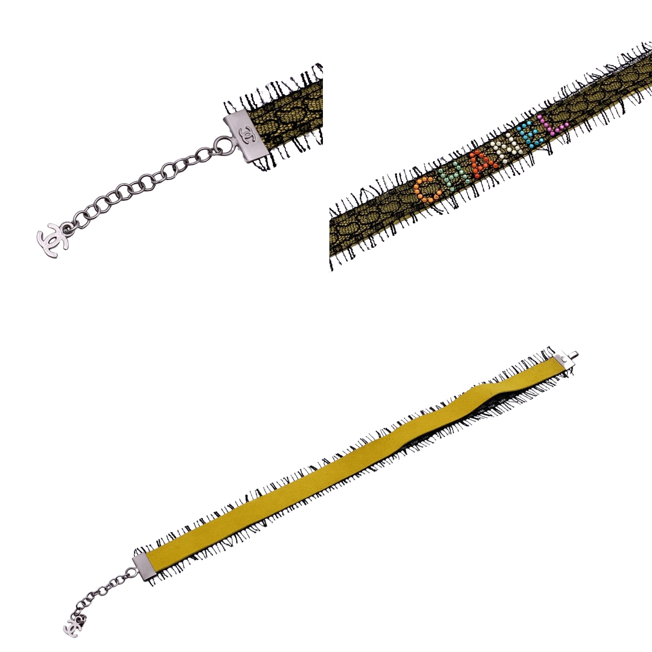 A Playful Blend Of Elegance And Statement Glamour, This Chanel Ribbon Lace Choker Necklace Is a Collectible Piece That Instantly Elevates Any Look. Crafted From Delicate Ribbon Lace And Lined In Soft Yellow Suede, It Features a Sparkling Multicolor Rhinestone Chanel Logo On The Front, Capturing The Maison's Signature Flair For Whimsy And Luxury. The Choker Is Finished With a Silver Chain Link And Cc-logo Hook Closure, Fully Adjustable To Fit Up To 13.5 Inches (34.3 Cm), Ensuring Both Comfort And Style. At The End Of The Necklace, An Oval Tab Stamped "Chanel - 00 Cc T - Made In France" Confirms Its Authenticity And Impeccable Craftsmanship. Perfect For Layering Or Wearing Alone As a Statement Accessory, This Choker Embodies Chanel's Ability To Turn Even The Smallest Piece Into a Striking Symbol Of Elegance And Charm.