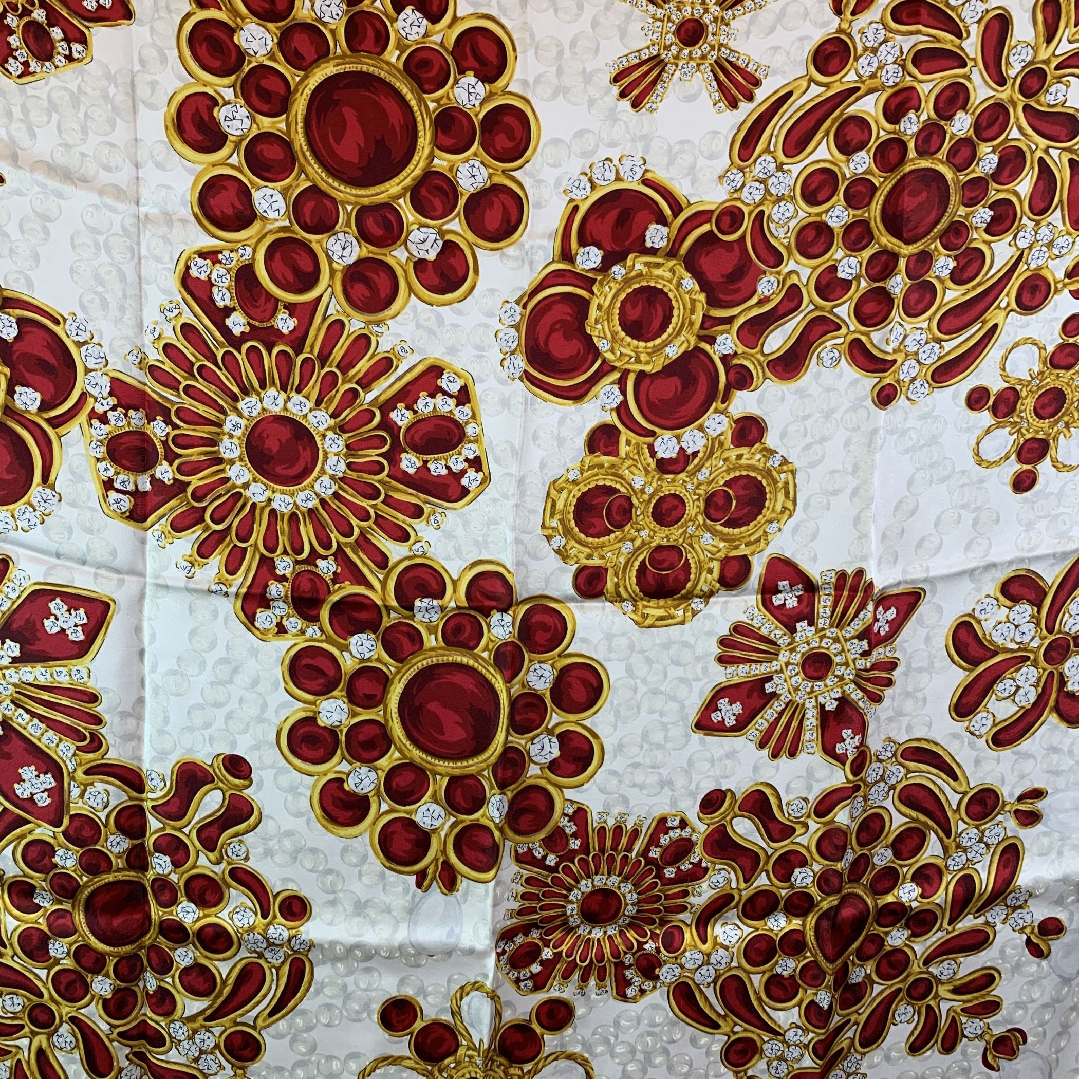 A Striking And Glamorous Accessory, This Vintage Chanel Scarf Is Crafted From 100% Pure Silk And Features An Opulent Yellow Gold Gripoix Jewelry Motif Set Against a Beige/off-white Background. The Intricate Design Captures Chanel's Timeless Fascination With Bijoux And Statement Adornments, Echoing The Maison's Classic Elegance. Finished With a Hand-rolled Edge, This Luxurious Scarf Showcases Exceptional Craftsmanship And Refined Detail-a True Vintage Treasure That Adds a Touch Of Parisian Sophistication And Golden Allure To Any Look.