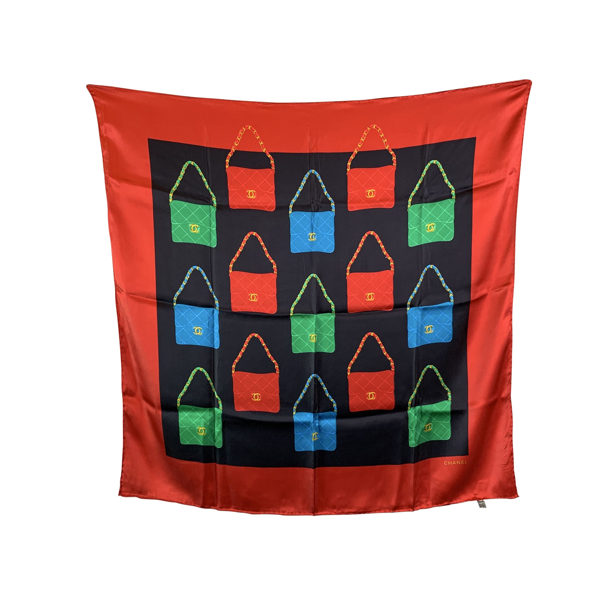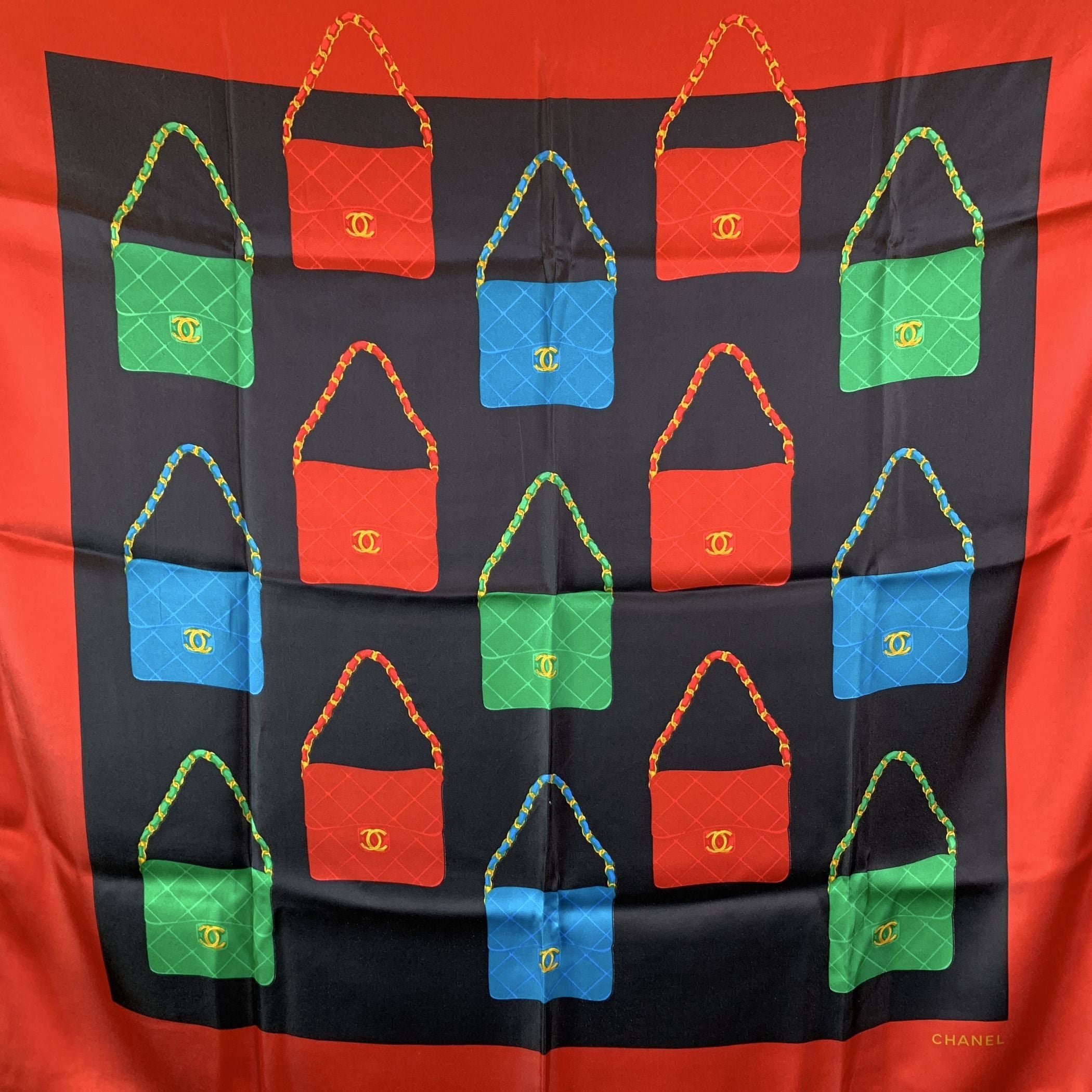 Chic And Instantly Recognizable, This Chanel Silk Scarf Celebrates One Of The Maison's Most Iconic Designs - The Classic Matelassé Flap Bag. Crafted From 100% Luxurious Silk, It Features a Black Background Adorned With a Detailed Print Of The Timeless Chanel Bag, Blending Fashion Heritage With Artistic Flair. Bold Red Borders. Measuring Approximately 34 Inches x 34 Inches (87 x 87 Cm), This Elegant Scarf Offers Endless Styling Possibilities - Wear It Around The Neck, As a Headscarf, Or Tied To Your Handbag For a Touch Of Iconic Parisian Sophistication.