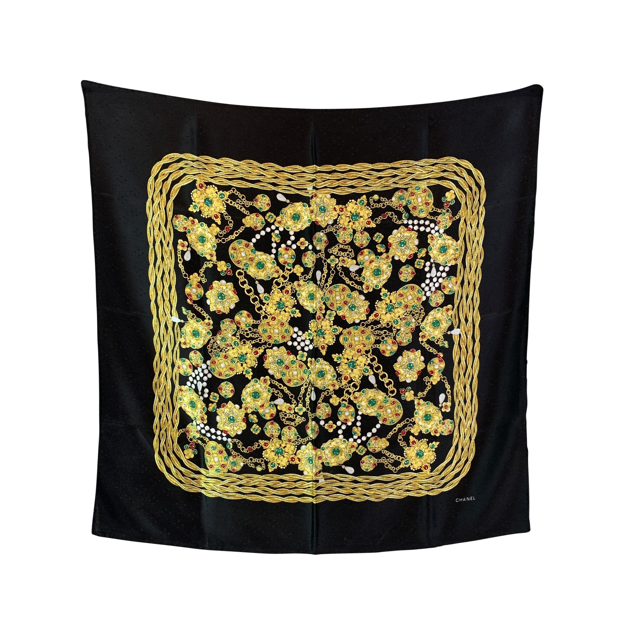 A Striking And Glamorous Accessory, This Vintage Chanel Scarf Is Crafted From 100% Pure Silk And Features An Opulent Yellow Gold Jewelry Motif Set Against a Deep Black Background. The Intricate Design Captures Chanel's Timeless Fascination With Bijoux And Statement Adornments, Echoing The Maison's Classic Elegance. Finished With a Hand-rolled Edge, This Luxurious Scarf Showcases Exceptional Craftsmanship And Refined Detail-a True Vintage Treasure That Adds a Touch Of Parisian Sophistication And Golden Allure To Any Look.