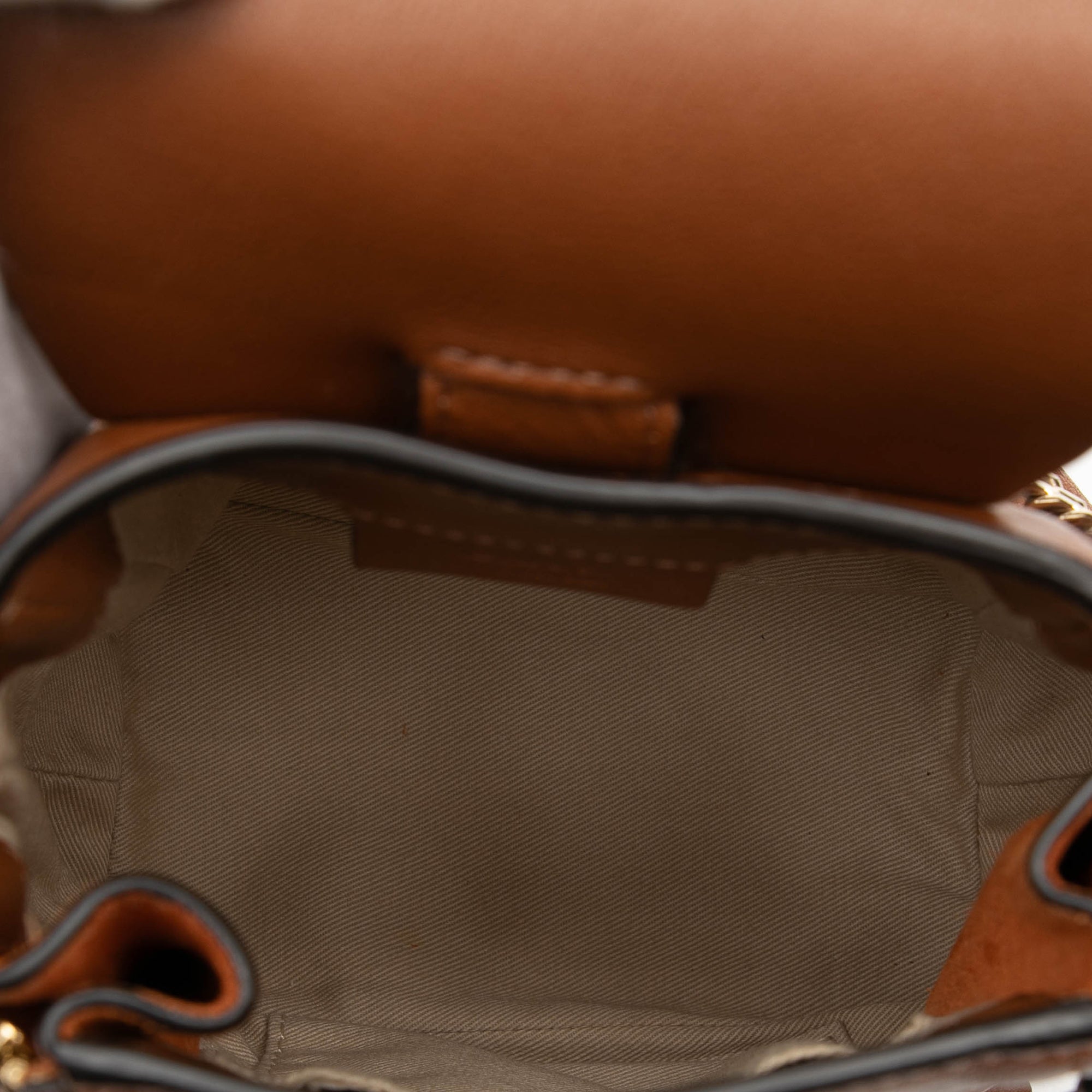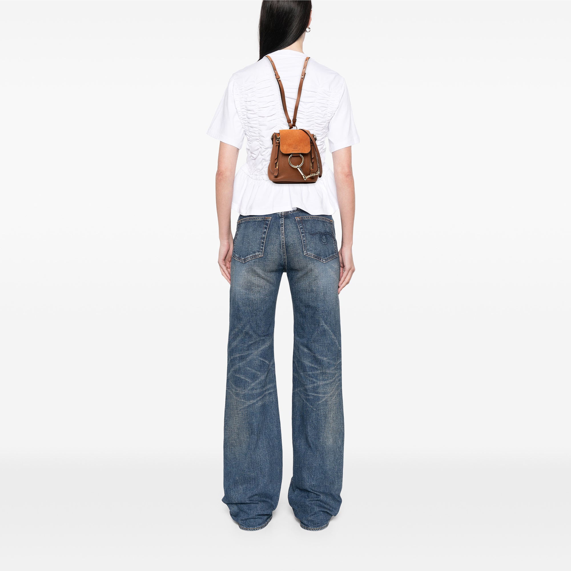 The Mini Faye backpack features a leather body with zip details, adjustable flat back straps, a detachable shoulder strap, a suede front flap with a hook closure, and an interior slip pocket. Retail Price: 1500.00