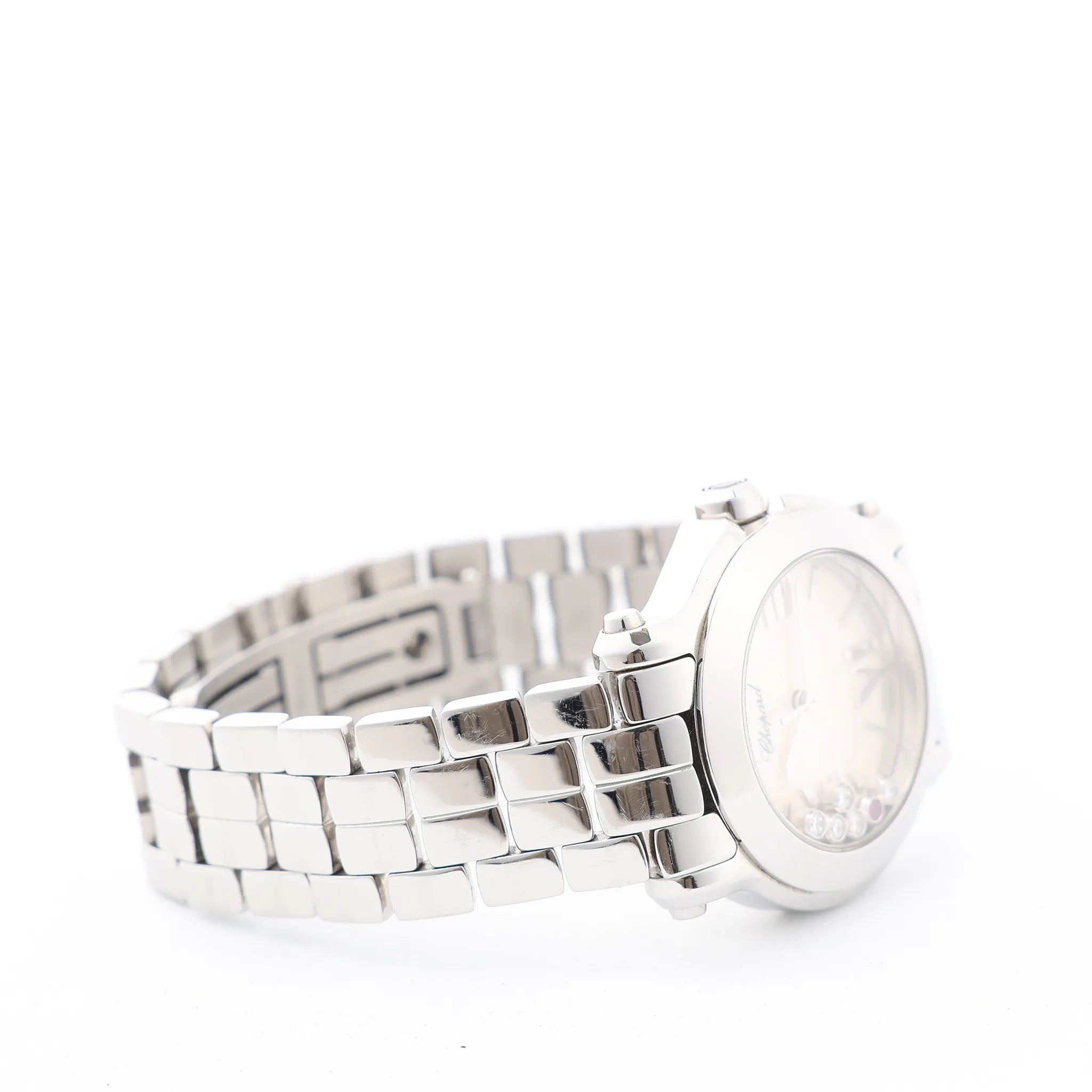 The Chopard Happy Sport 278509-3006 dazzles with its stainless steel case, quartz movement, and elegant mother-of-pearl dial featuring free-floating diamonds—luxury in motion.