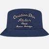 The bucket hat pays homage to the House's couturiers. Crafted in blue cotton canvas, it features Christian Dior Atelier embroidery on the front, Dior Oblique lining and a contrasting colour under the brim. Modern and relaxed, this bucket hat will enhance all your casual outfits.. Grey Christian Dior Atelier embroidery on the front. Color opposition under the edge. Tone-on-tone Dior Oblique jacquard lining. 100% cotton, lining: 100% cotton. Made in Italy. size L