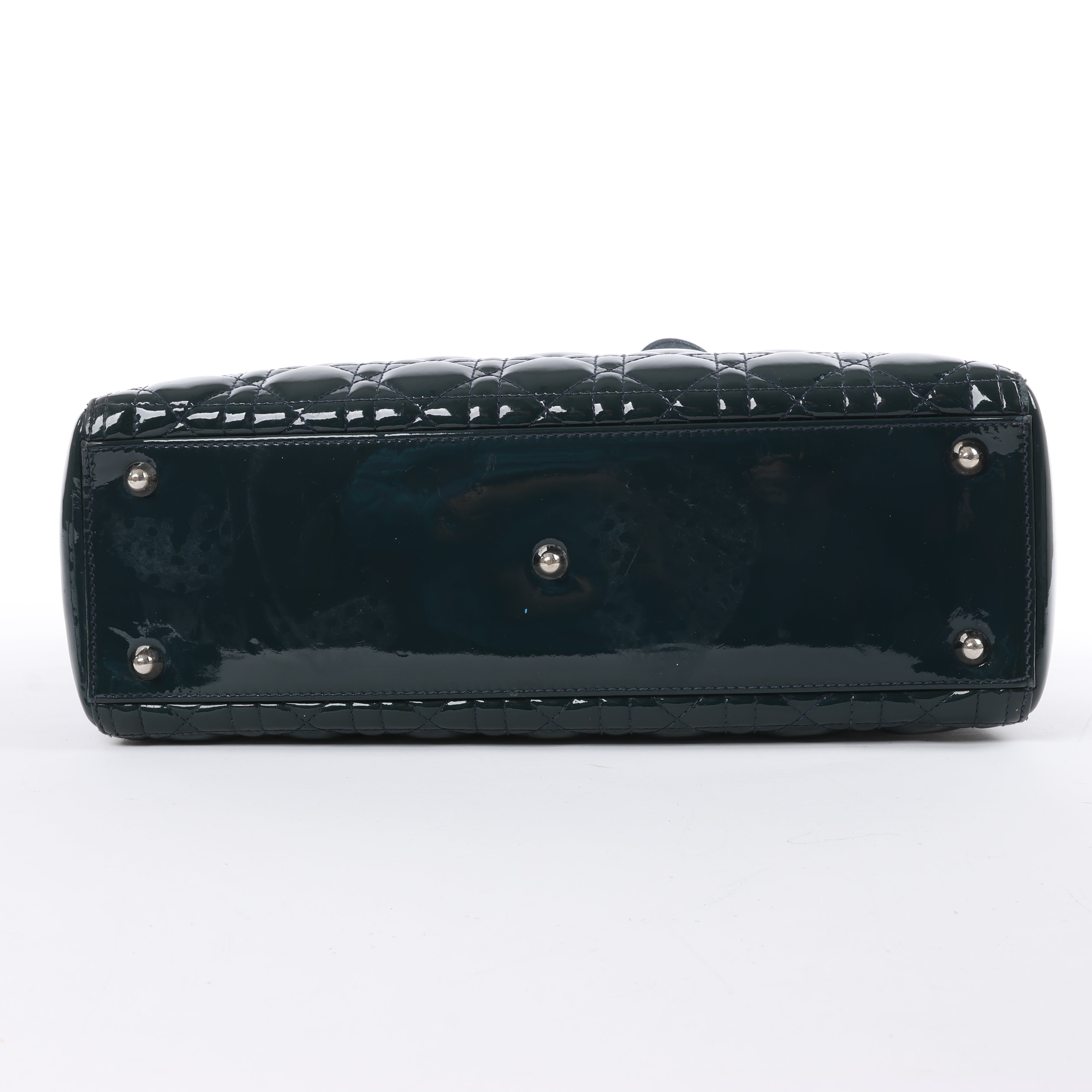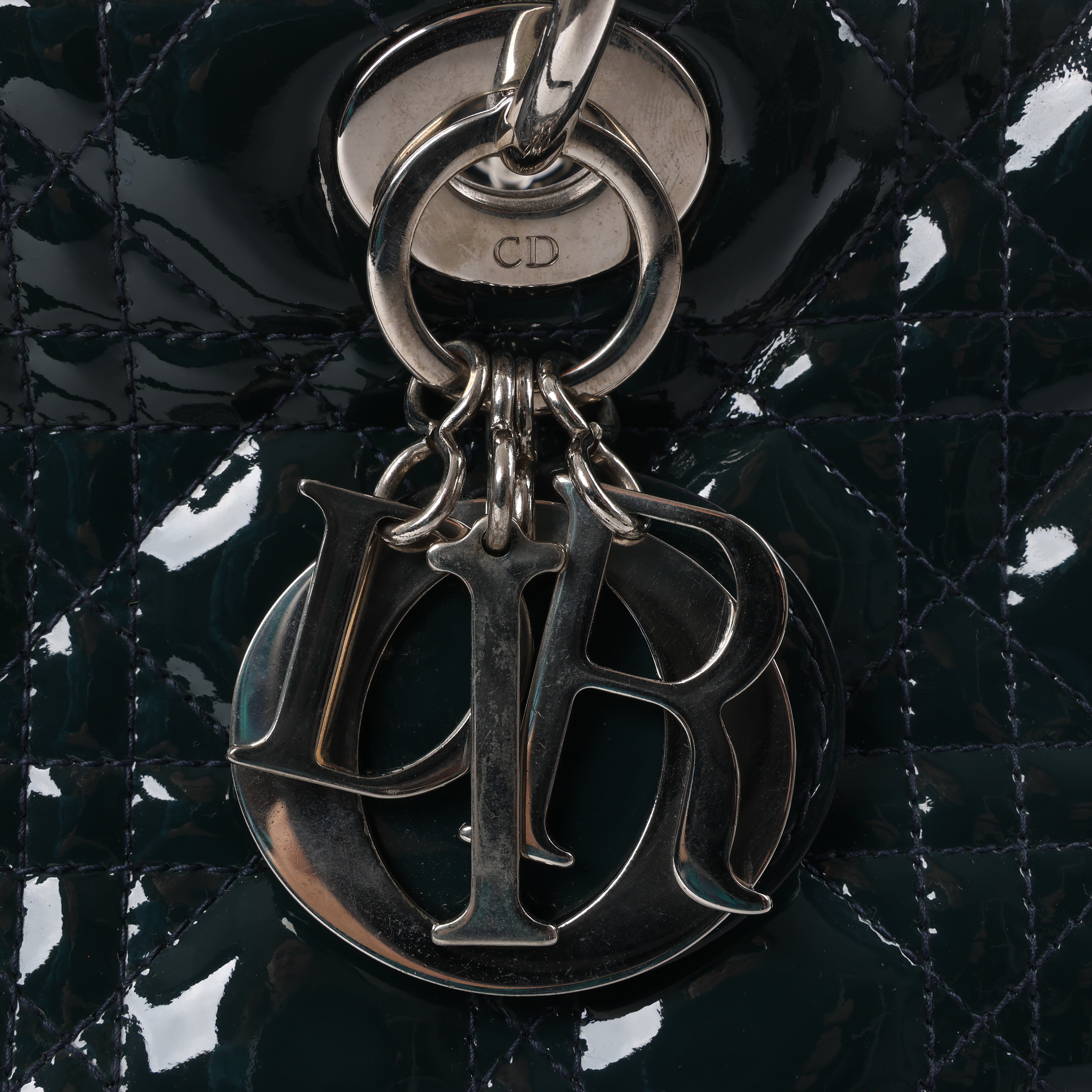Christian Dior Lady Dior Large handbag in deep green Cannage patent leather with silver-tone hardware. Iconic Dior charms, structured top handles, and detachable strap offer refined elegance with versatile 2-way wear.