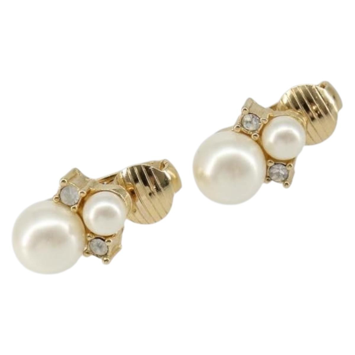 Christian Dior Vintage Round Clip-On Earrings Metal with Crystals and Faux Pearls