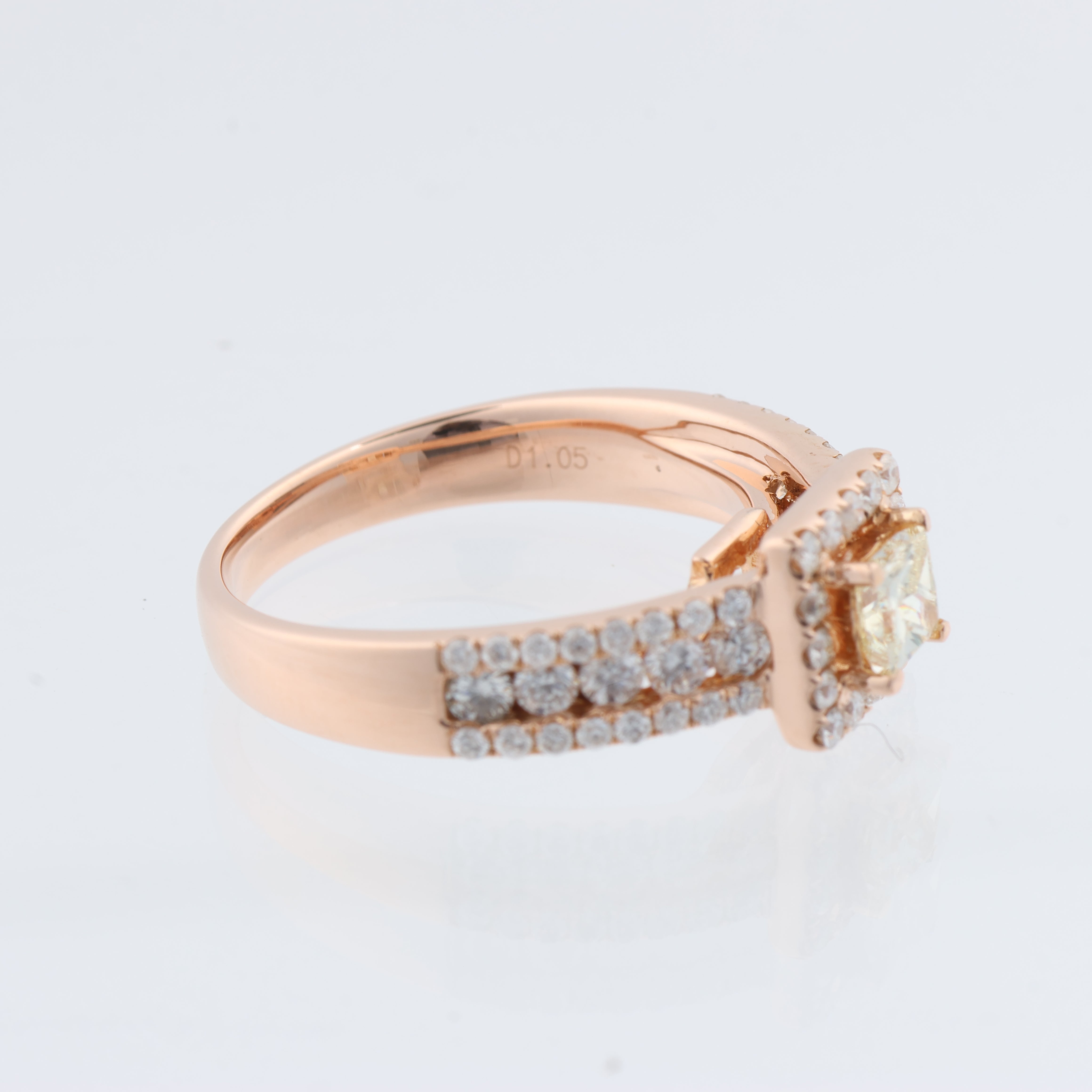 Stunning 18k pink gold ring, size 52 EU, set with 59 natural diamonds totaling \~1.15 ct. Features a 0.65 ct princess-cut light yellow diamond (SI1) and 58 brilliant-cut near-colorless diamonds (G–H, SI–I1). Total weight: 4.97 g. Certified elegance.