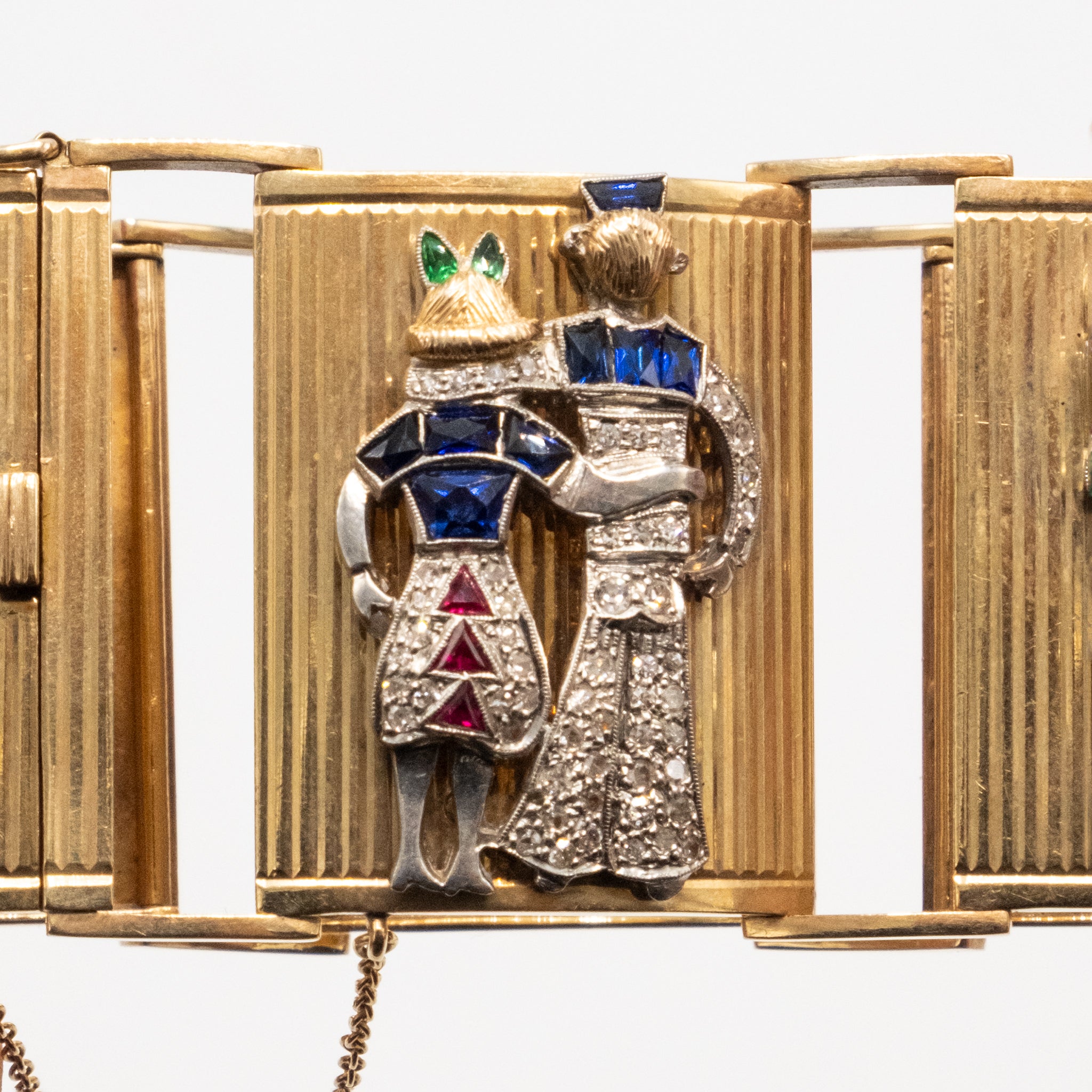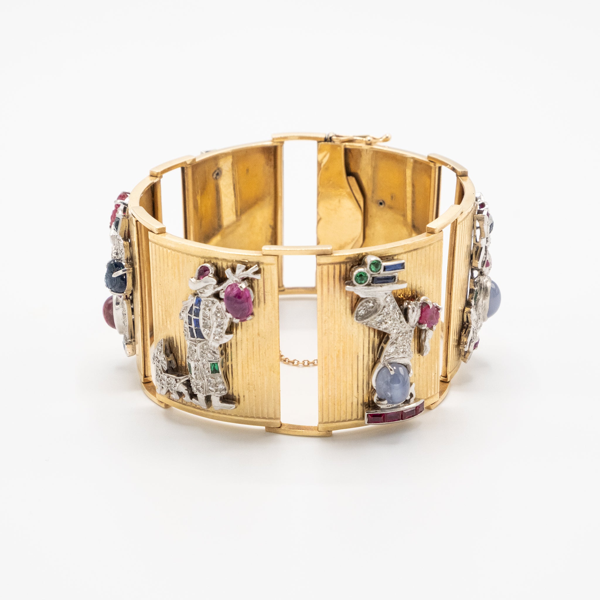 A rare and theatrical masterpiece from the 1940s, this wide French bracelet showcases exceptional craftsmanship and playful luxury. Composed of articulated vertical panels in rich 18K yellow gold, each segment is meticulously adorned with figurative gem-set scenes — from charming dogs and flowers to stylized dancers and musicians — rendered in a dazzling combination of carved rubies, sapphires, emeralds, and brilliant-cut diamonds.