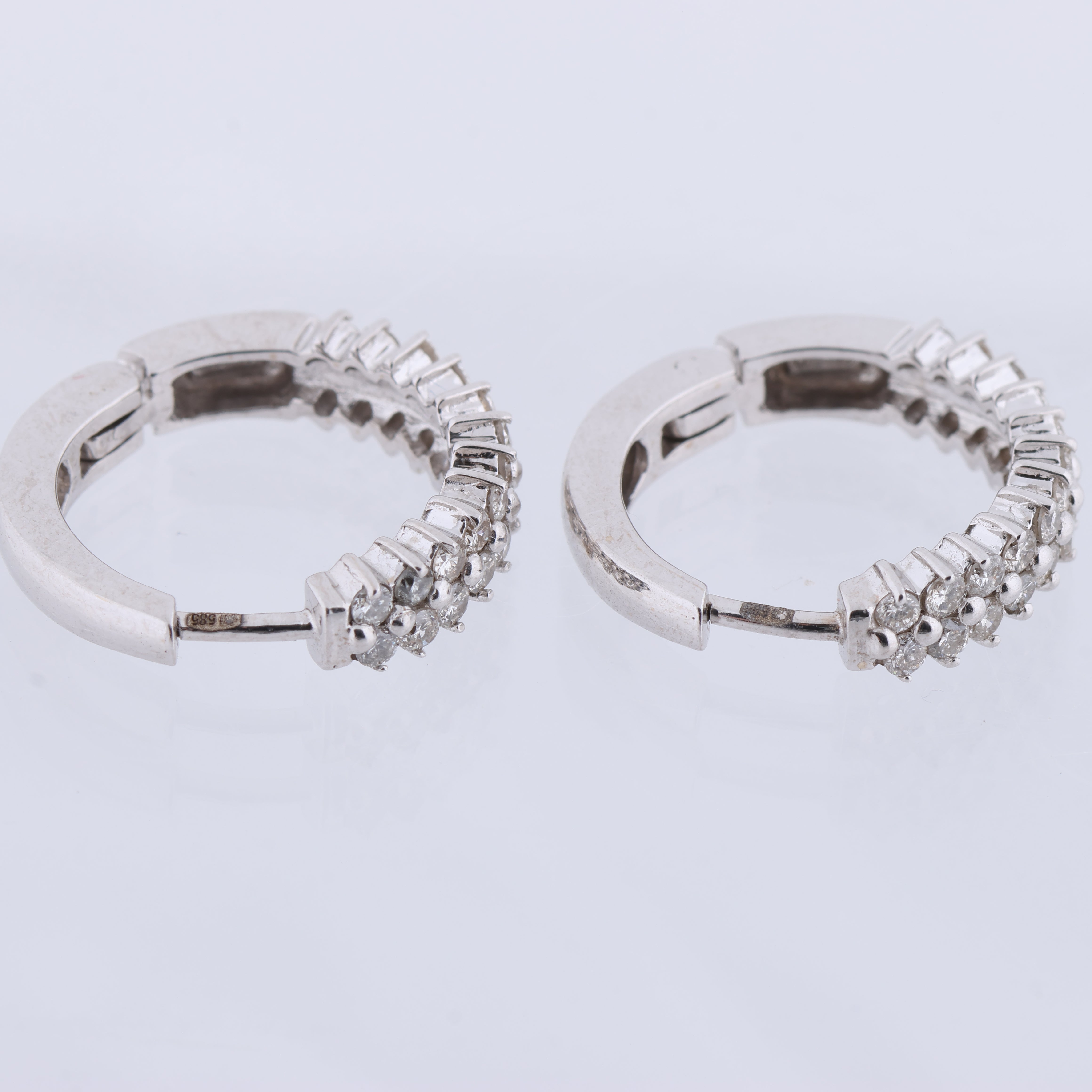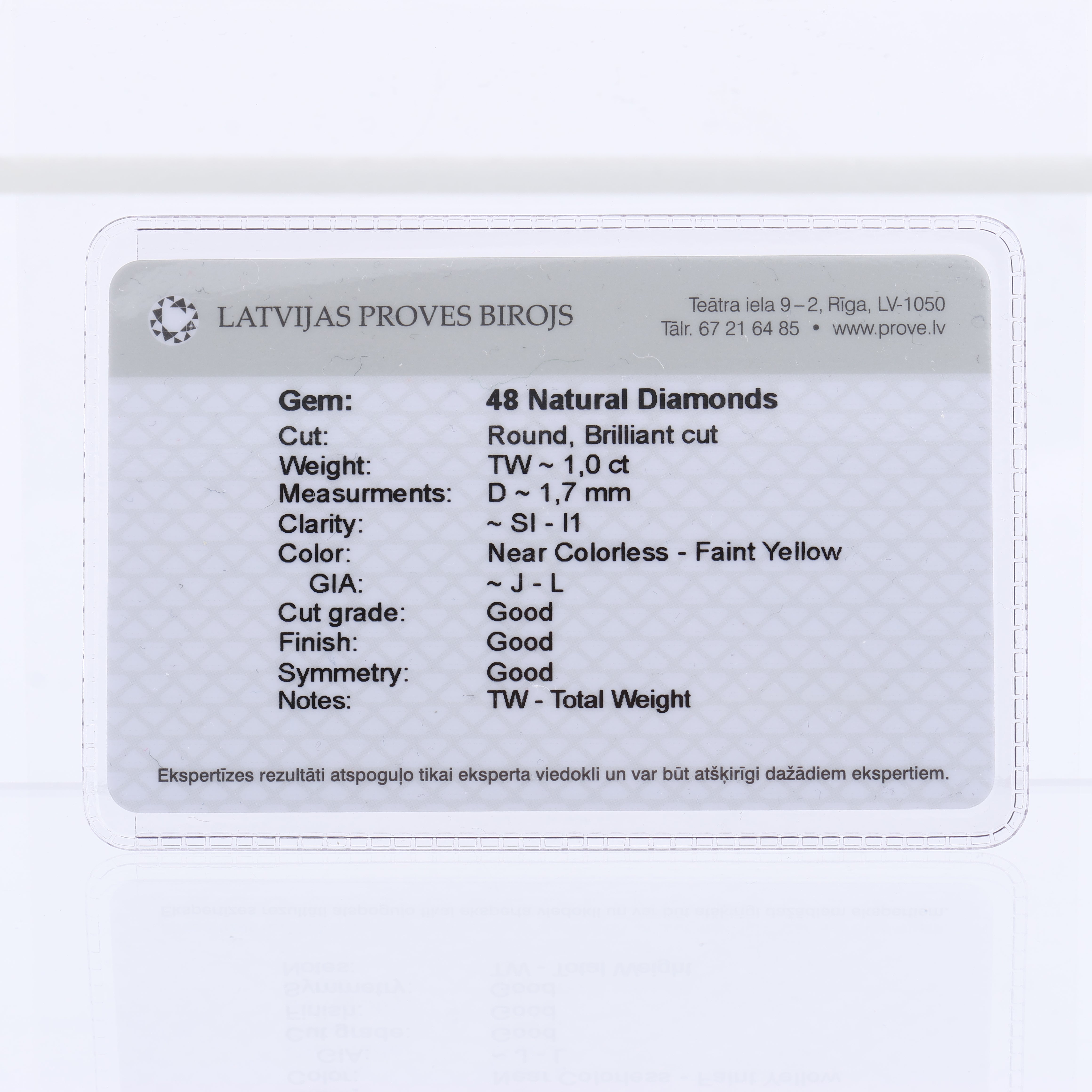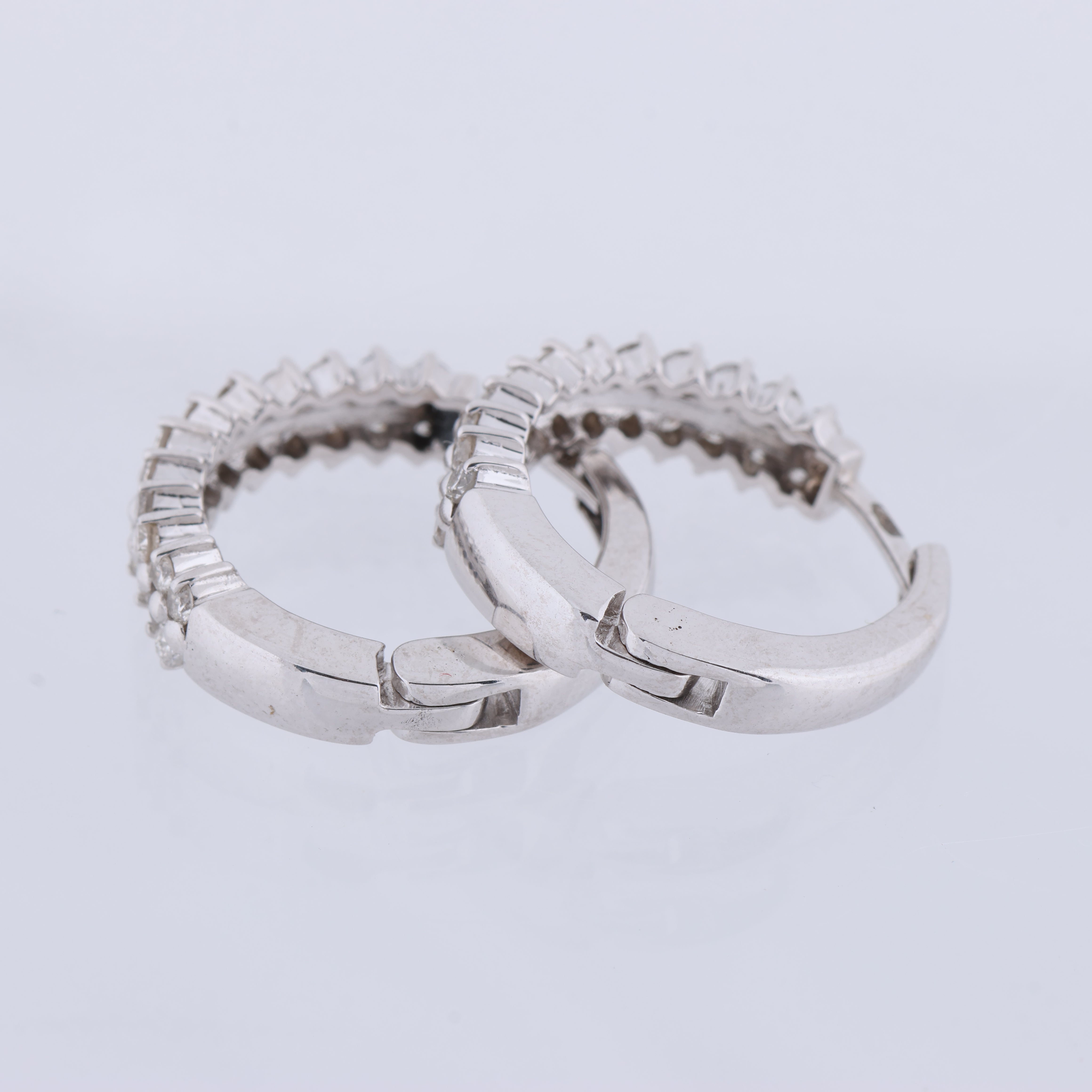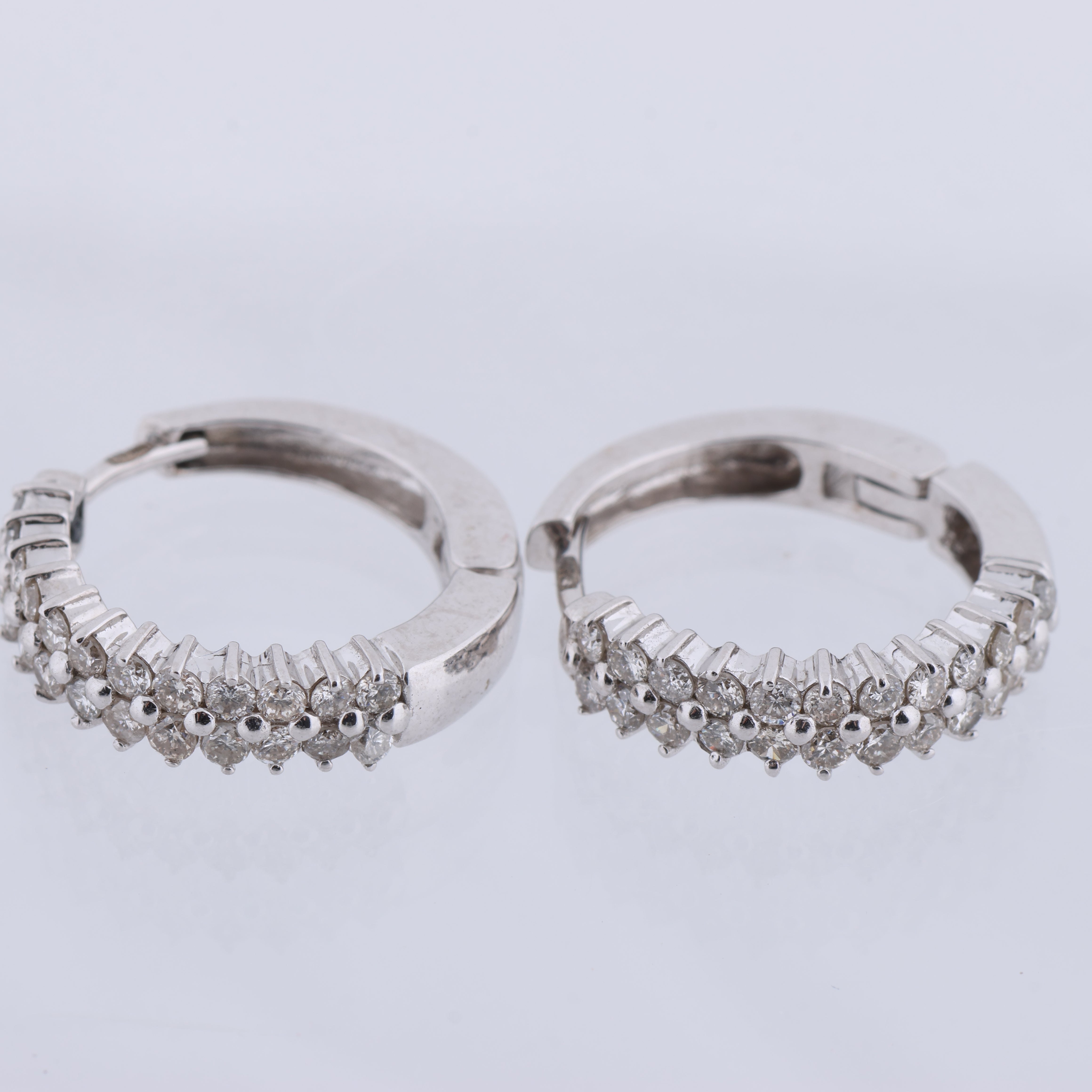 Elevate your style with these stunning 14K white gold earrings adorned with 48 natural diamonds totaling 1.0ct. Featuring brilliant round-cut stones with near-colorless hues (J-L) and sparkling clarity (SI-I1), these timeless hoops exude elegance and sophistication.