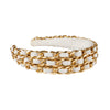 This hairband features 3 layers of woven chain and lacquered leather with gold tone metal creating a sophisticated touch on the white fabric. Be bold and bring some vintage flair to your everyday look.