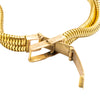 A stunning example of 1940s retro glamour, this convertible jewelry watch features a concealed dial hidden beneath a sculptural fan-motif cover. Crafted in 18k yellow gold and weighing approximately 50.78 grams, the bracelet showcases twin tubogas bands and an ornate centerpiece adorned with pavé-set diamonds and channel-set rubies.