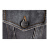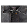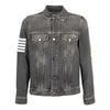 This Palm Angels Denim Jacket features a dark wash, two pockets, long sleeves, and is detailed with prints and patches, making it a timeless, stylish favorite.