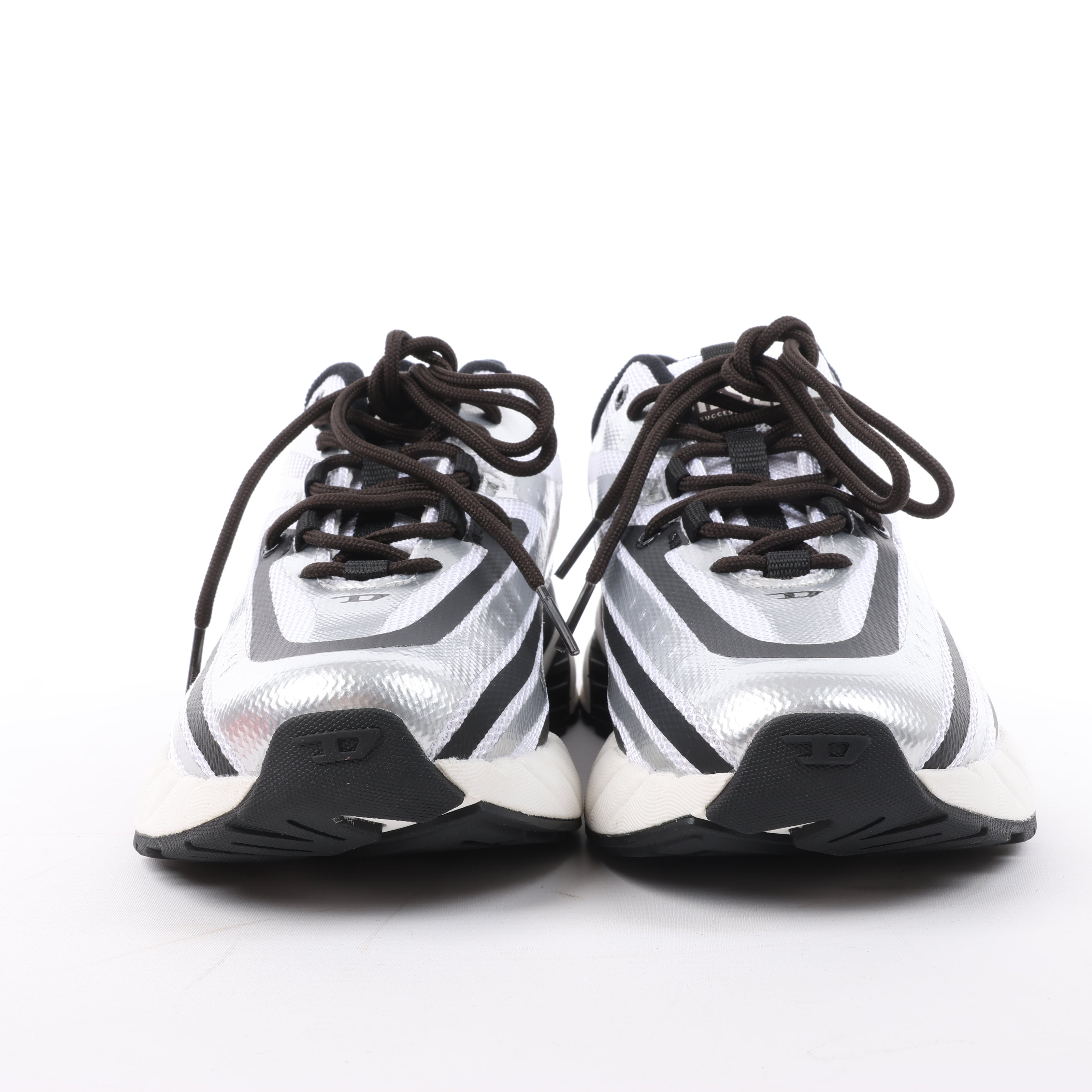 Step into futuristic style with Diesel D-Airspeed low-top sneakers in silver coated ripstop, featuring bold black stripes, layered sole design, and high-performance streetwear flair in size 43 EU.