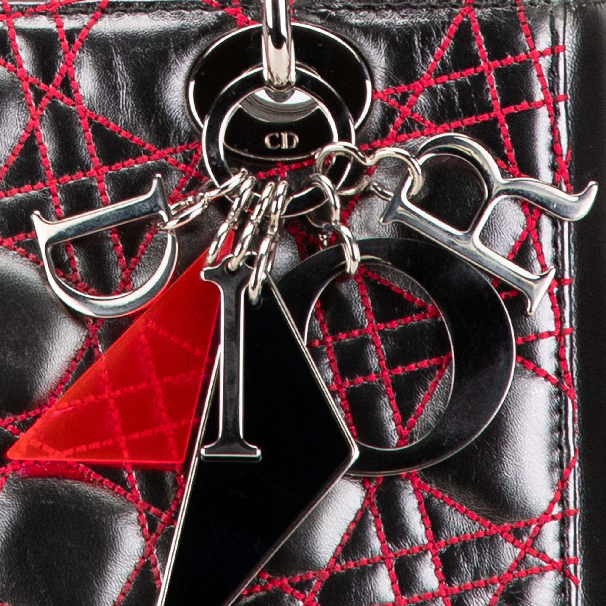 The Medium Lady Dior features a quilted metallic lambskin leather body, structured leather handles, a detachable flat leather strap, a top zip closure, and an interior zip pocket. Inclusion: authenticity card. Retail Price: 2150.00