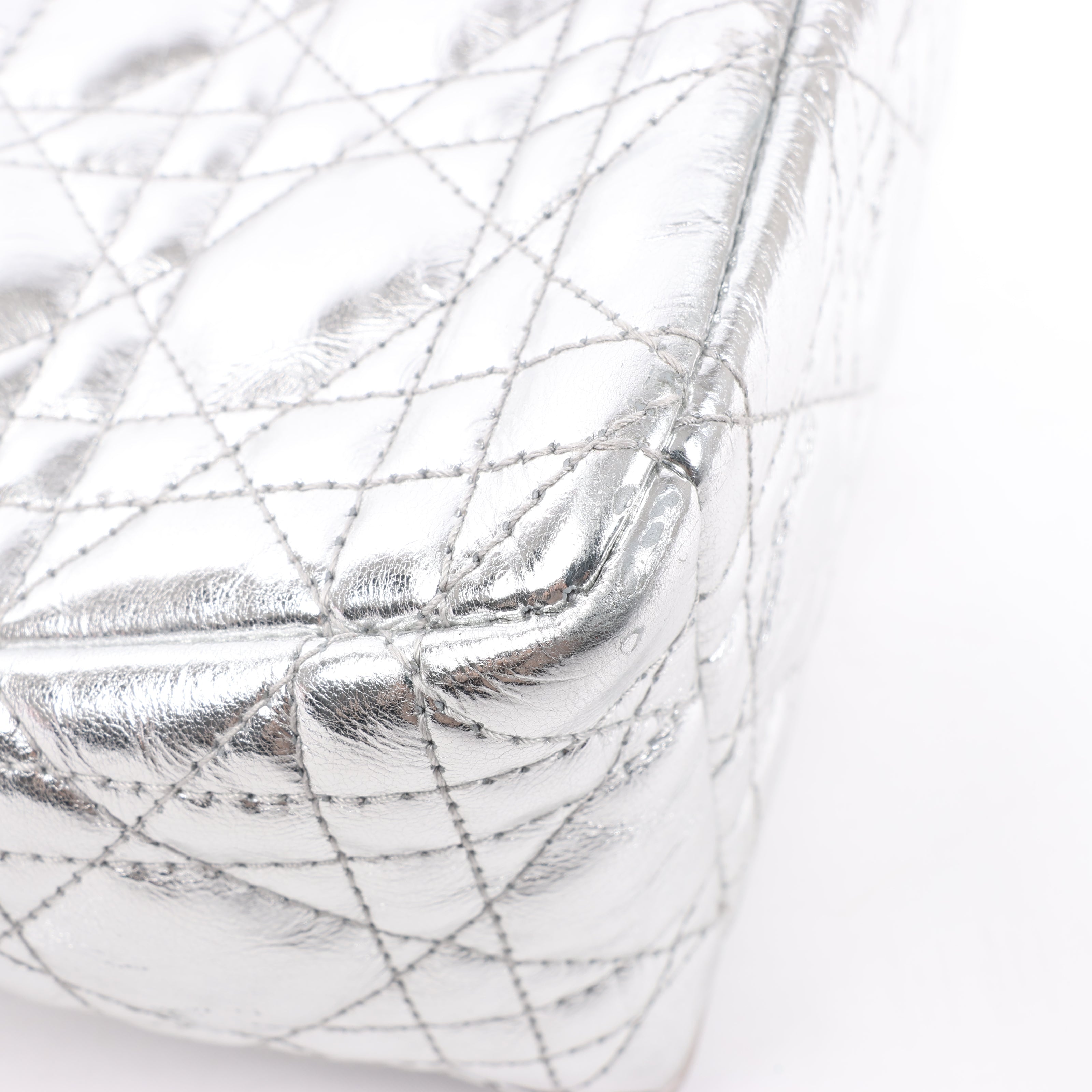 Make a bold statement with this Christian Dior Caro shoulder bag in metallic silver leather. Featuring signature Cannage quilting, a striking CD logo, and a chic chain strap, it's the perfect blend of glamour and modern elegance.