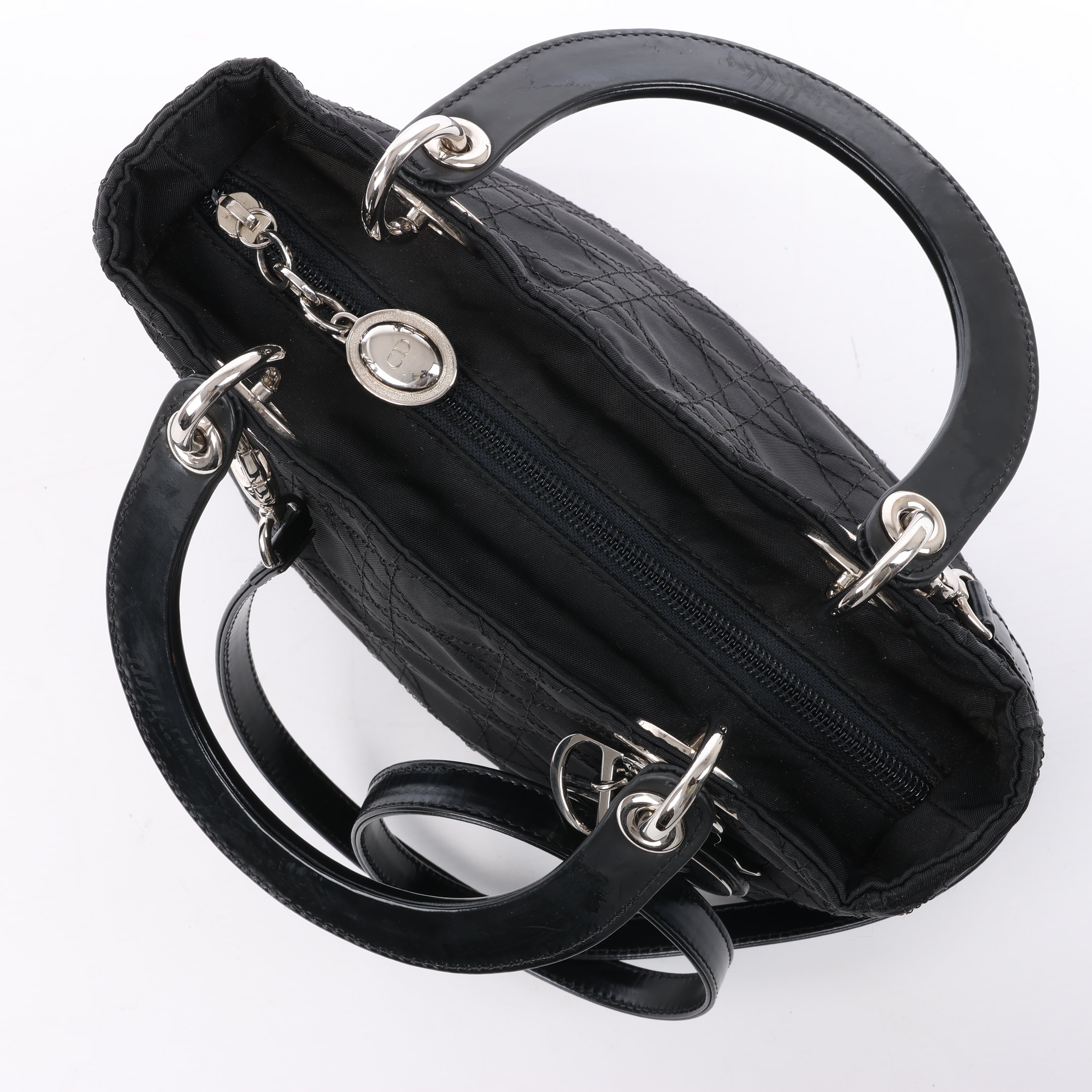 Iconic and elegant, this Dior Lady Dior handbag in black Cannage nylon features polished silver-tone hardware and signature charm detailing. A timeless piece that exudes Parisian sophistication and refined femininity.