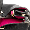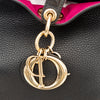 The Dior Diorissimo Tote Bag features a black calfskin grained leather design with signature Dior charms and gold tone hardware. The top snap button closure and removable shoulder/crossbody strap make it practical, while the pink leather lining with inner slip pockets add a touch of luxury.