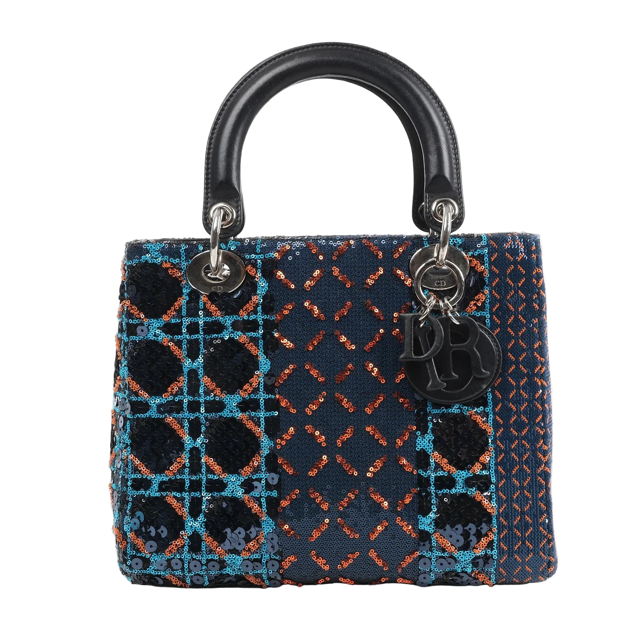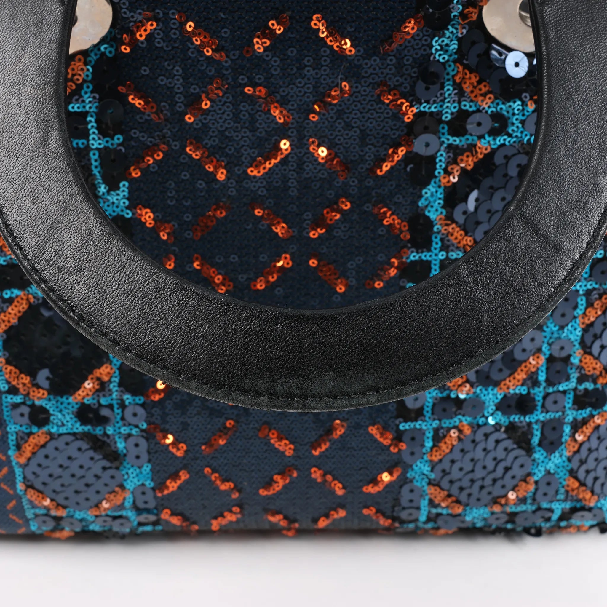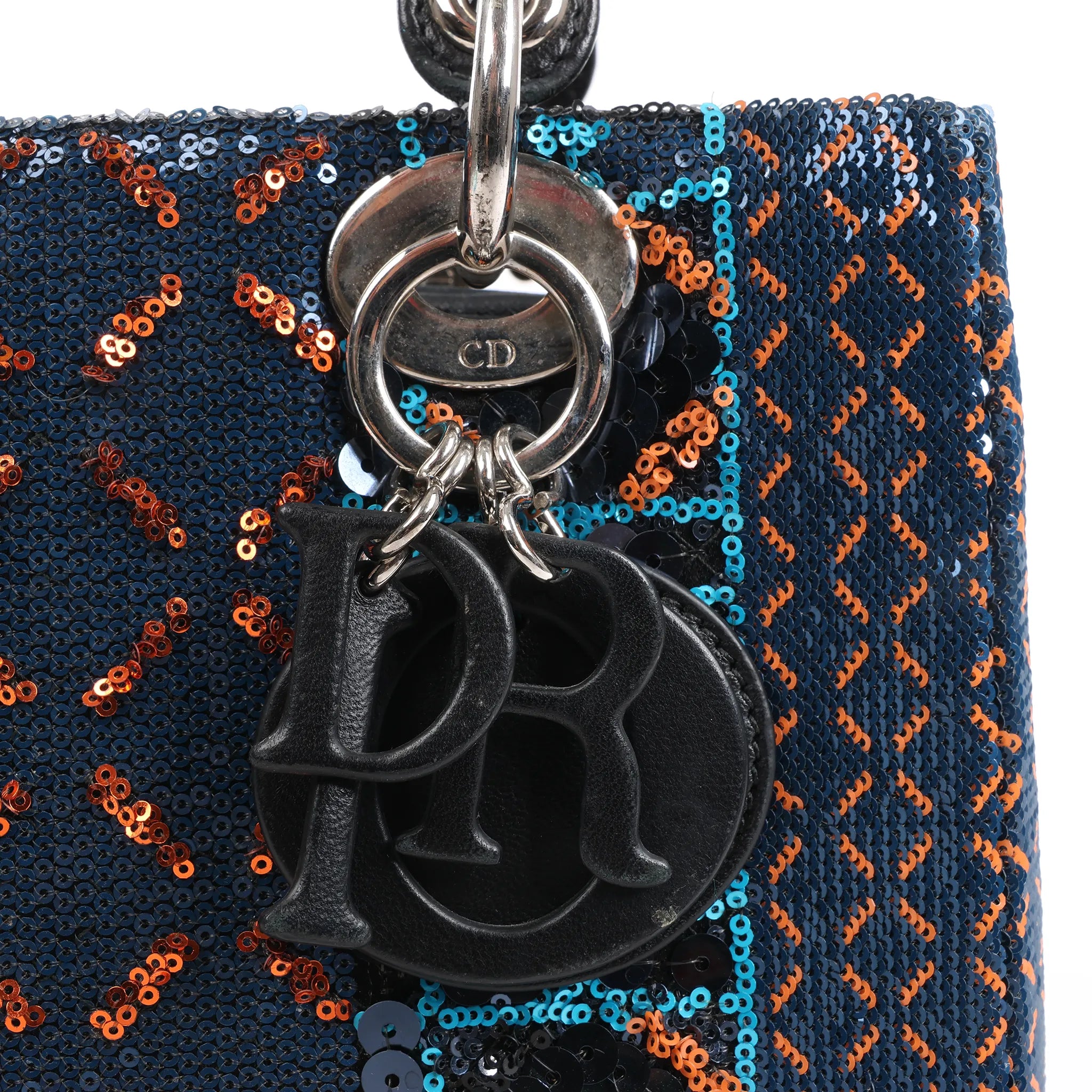 Brand: Dior Model: Lady DiorSize: MediumWidth: 25 cmHeight: 20 cmExterior Condition: ExcellentInterior Condition: Very goodCondition Details: Exterior is in excellent condition, the leather part is in great condition, but has small scratches, also near zipper part has glossy stain. The handles are clean and firm with some rubbings. Note: Shoulder strap is missing. Hardware is still shiny and crisp with dent. The interior lining has creases and some glossy stains.Colour: Navy BlueInterior Colour: Orange, BlueHardware Colour: SilverMaterial: Sequins, LeatherComes With: -