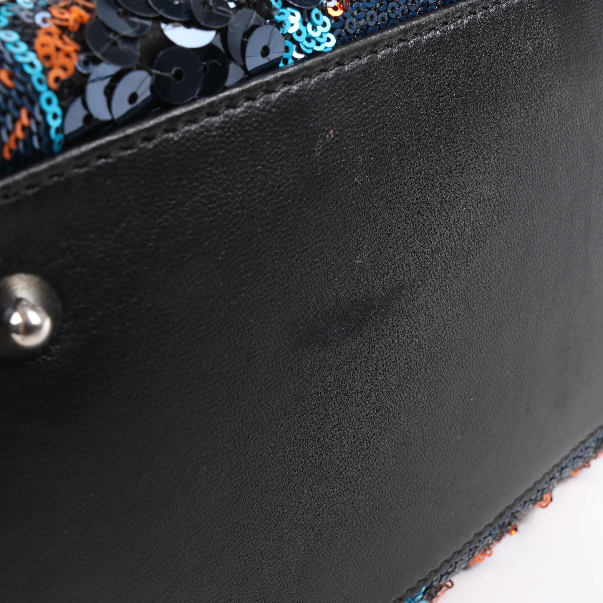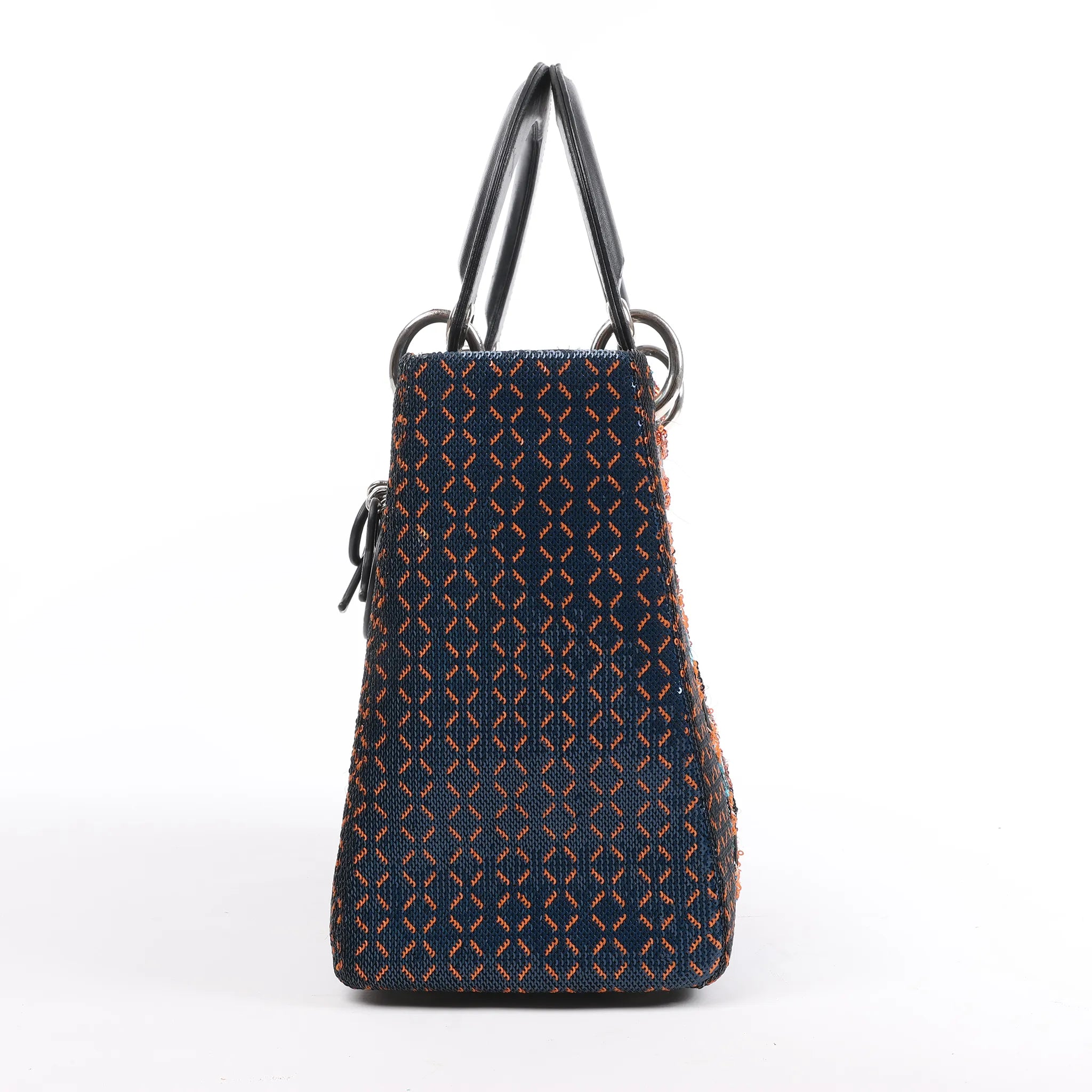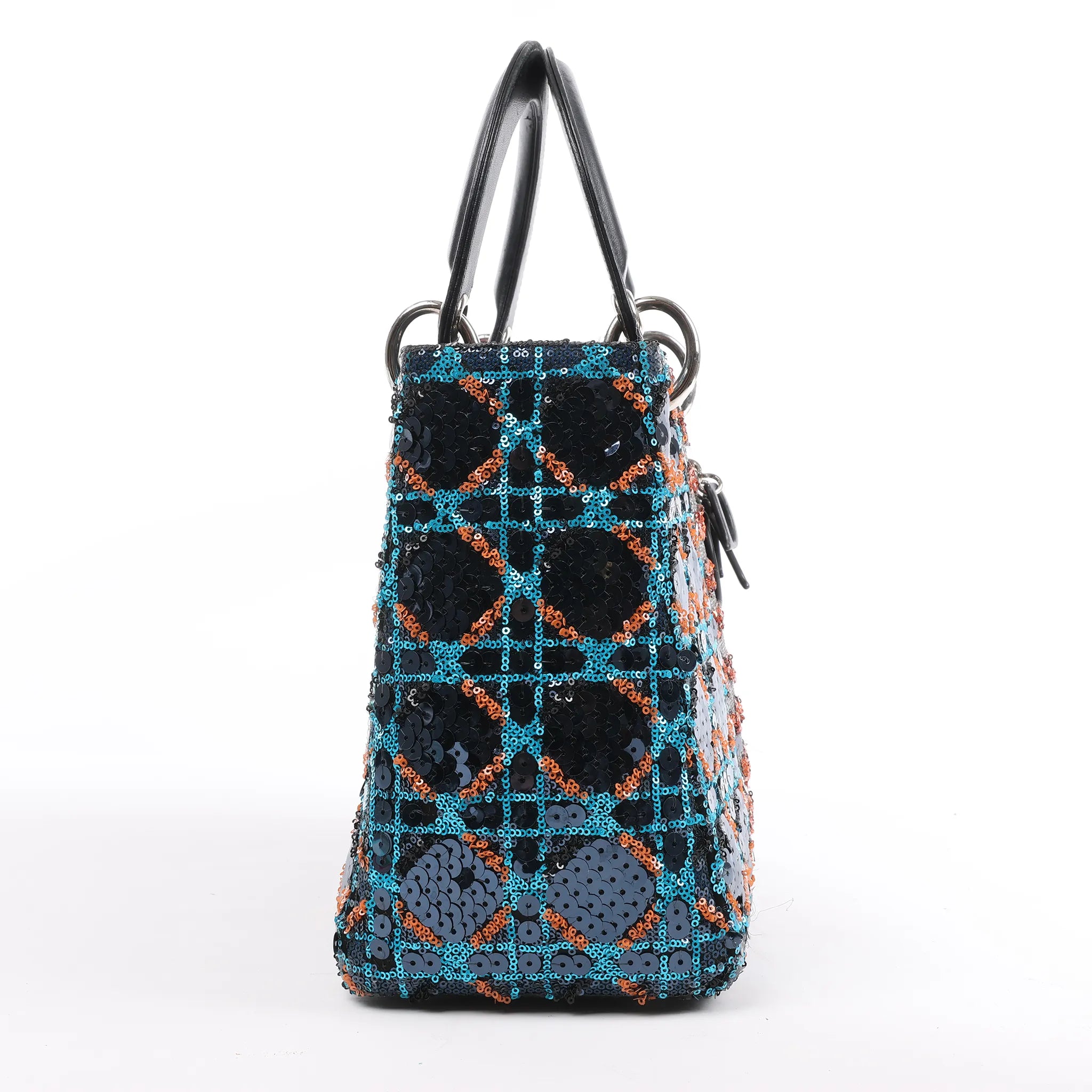 Brand: Dior Model: Lady DiorSize: MediumWidth: 25 cmHeight: 20 cmExterior Condition: ExcellentInterior Condition: Very goodCondition Details: Exterior is in excellent condition, the leather part is in great condition, but has small scratches, also near zipper part has glossy stain. The handles are clean and firm with some rubbings. Note: Shoulder strap is missing. Hardware is still shiny and crisp with dent. The interior lining has creases and some glossy stains.Colour: Navy BlueInterior Colour: Orange, BlueHardware Colour: SilverMaterial: Sequins, LeatherComes With: -