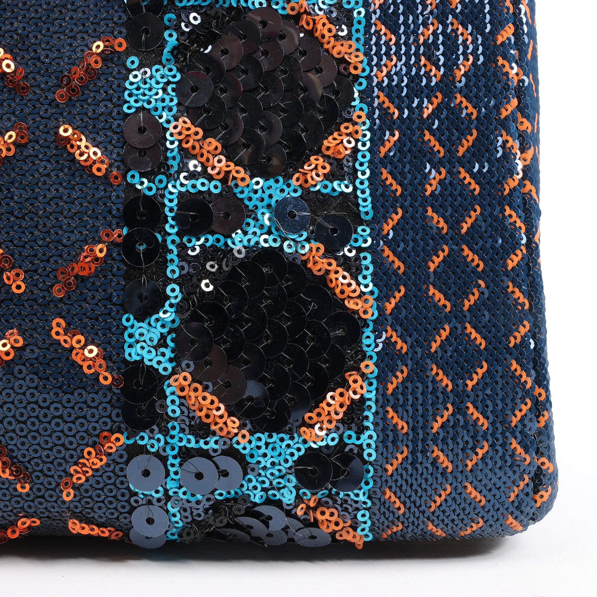 Turn heads with the Dior Lady Dior Medium Handbag in navy blue, dazzling in vibrant sequins. This iconic model features intricate geometric patterns, silver-tone hardware, and signature Dior charms—perfect for making a glamorous statement.