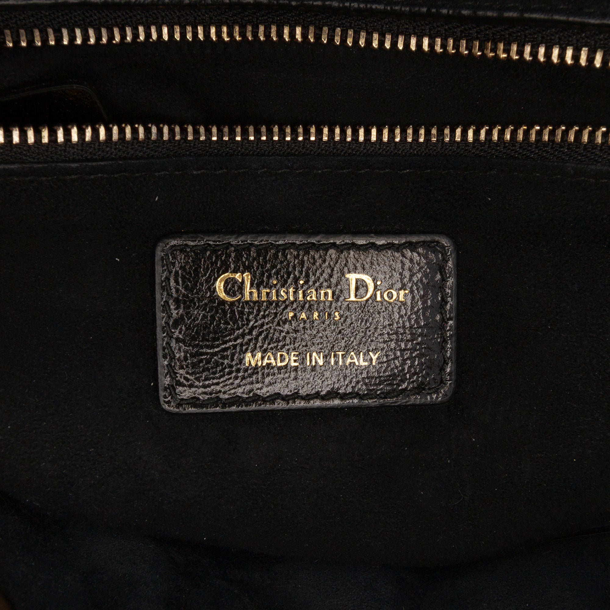 The Lady Dior features a quilted leather body, flat leather top handles, a detachable flat leather strap, a fold-in flap closure, and interior zip and slip pockets. Retail Price: 4400.00