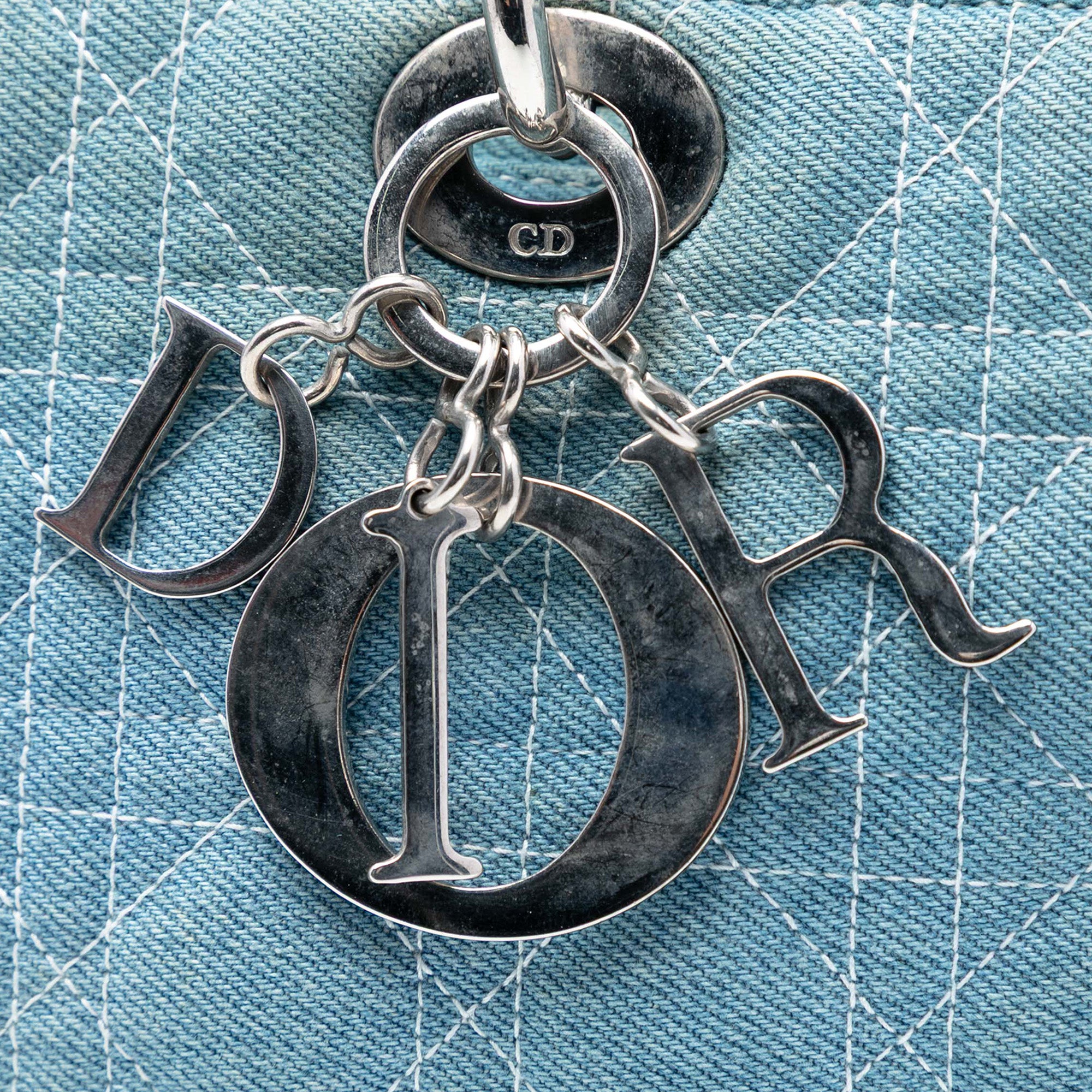 The Lady Dior satchel features a quilted denim body, flat plastic top handles, a detachable flat denim strap, a top zip closure, and an interior zip pocket. Inclusion: authenticity card. Retail Price: 2900.00