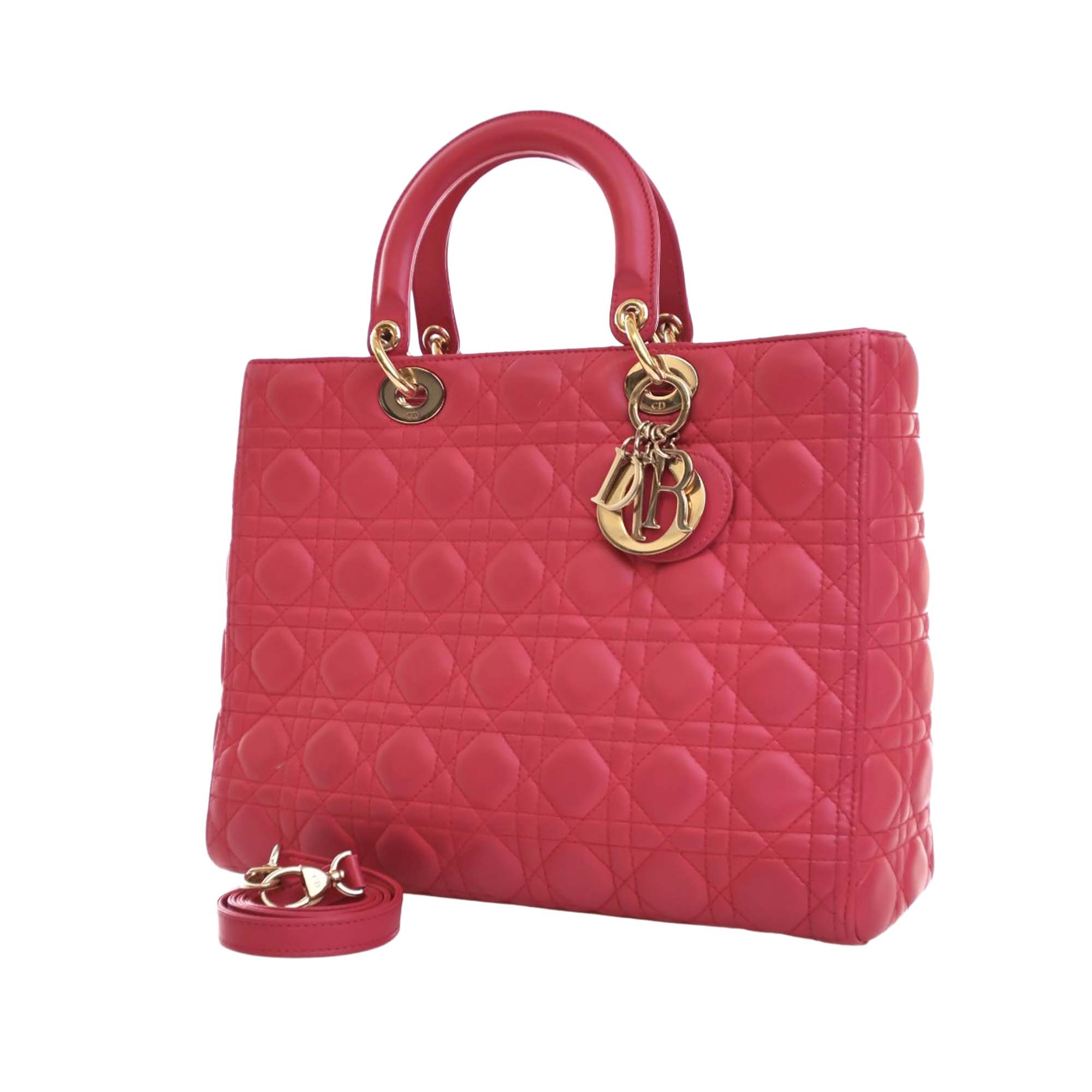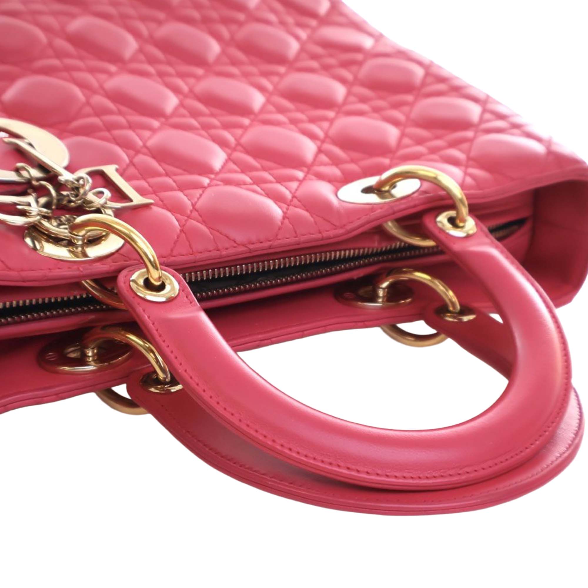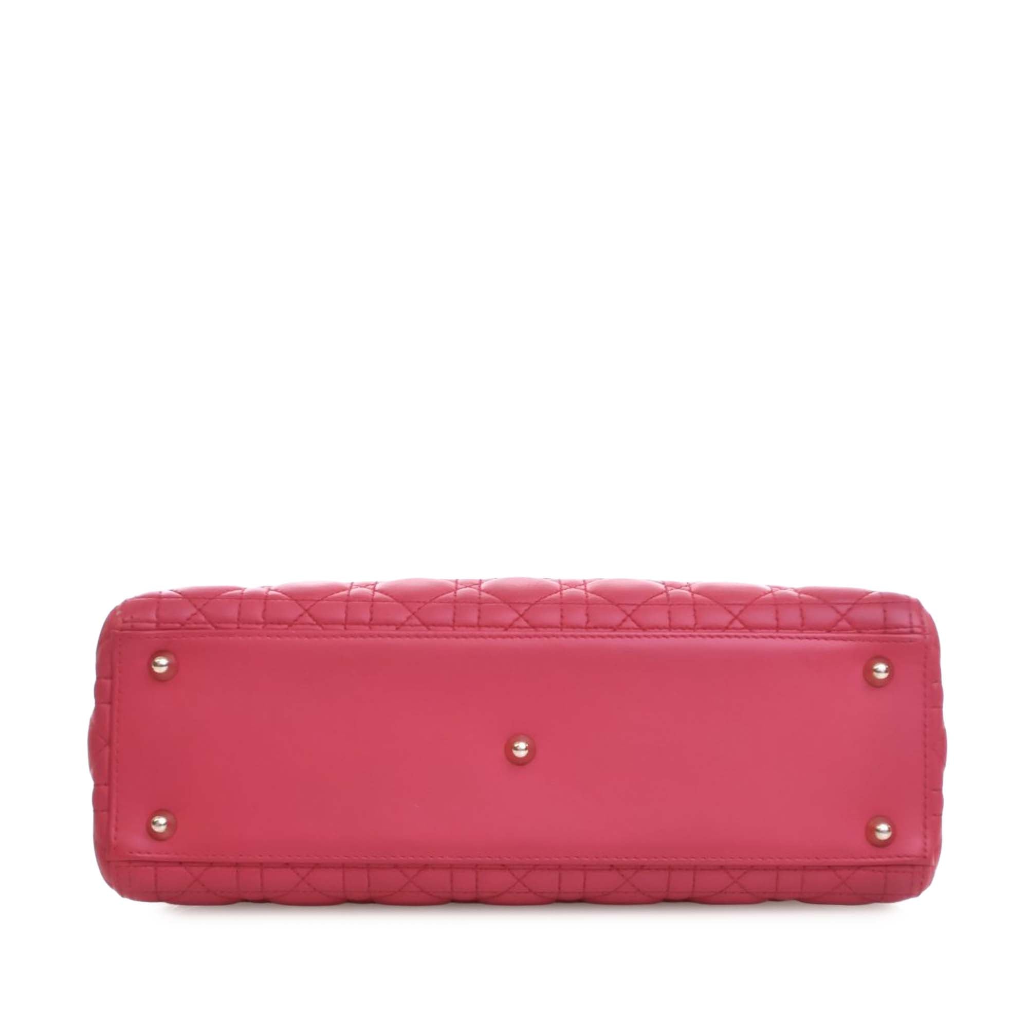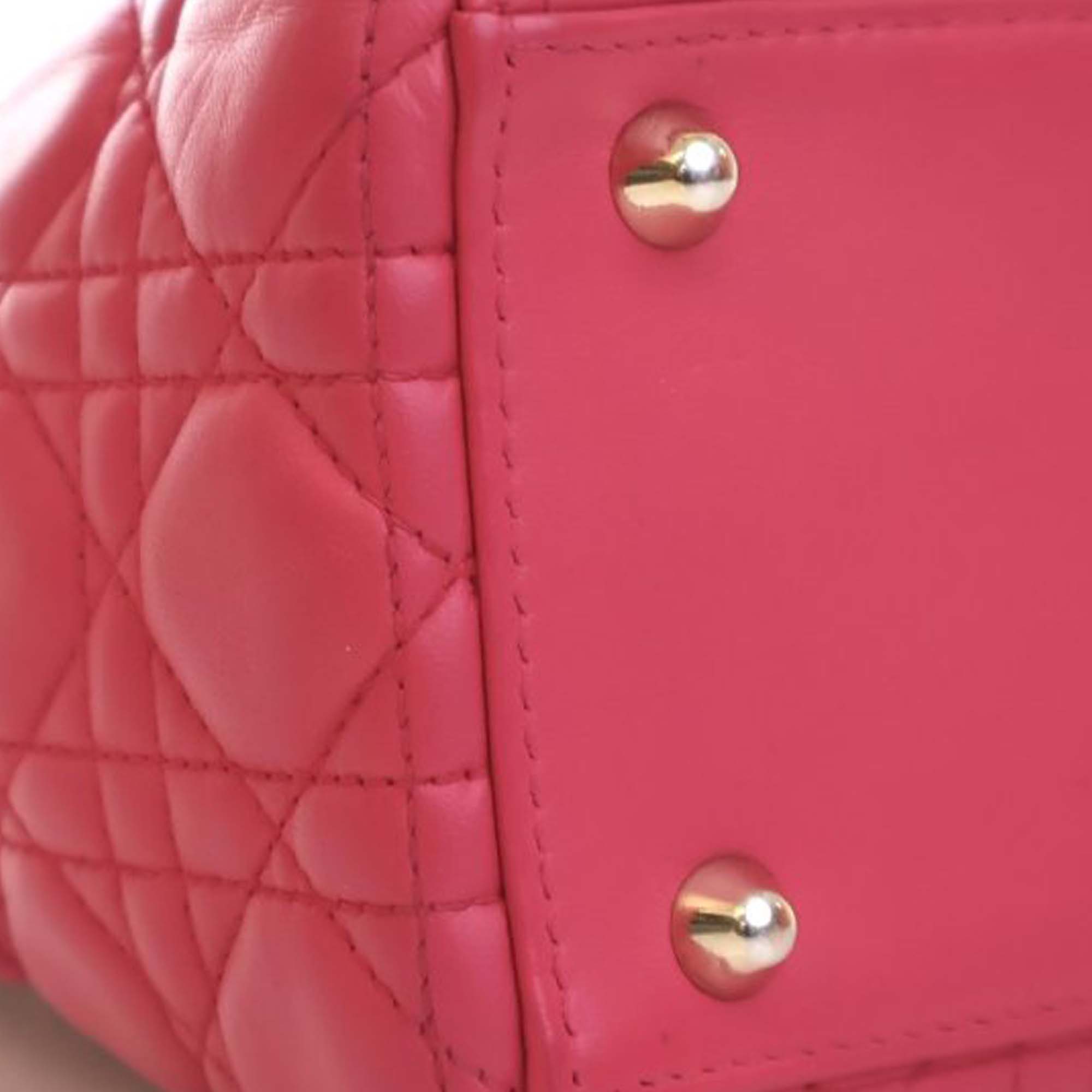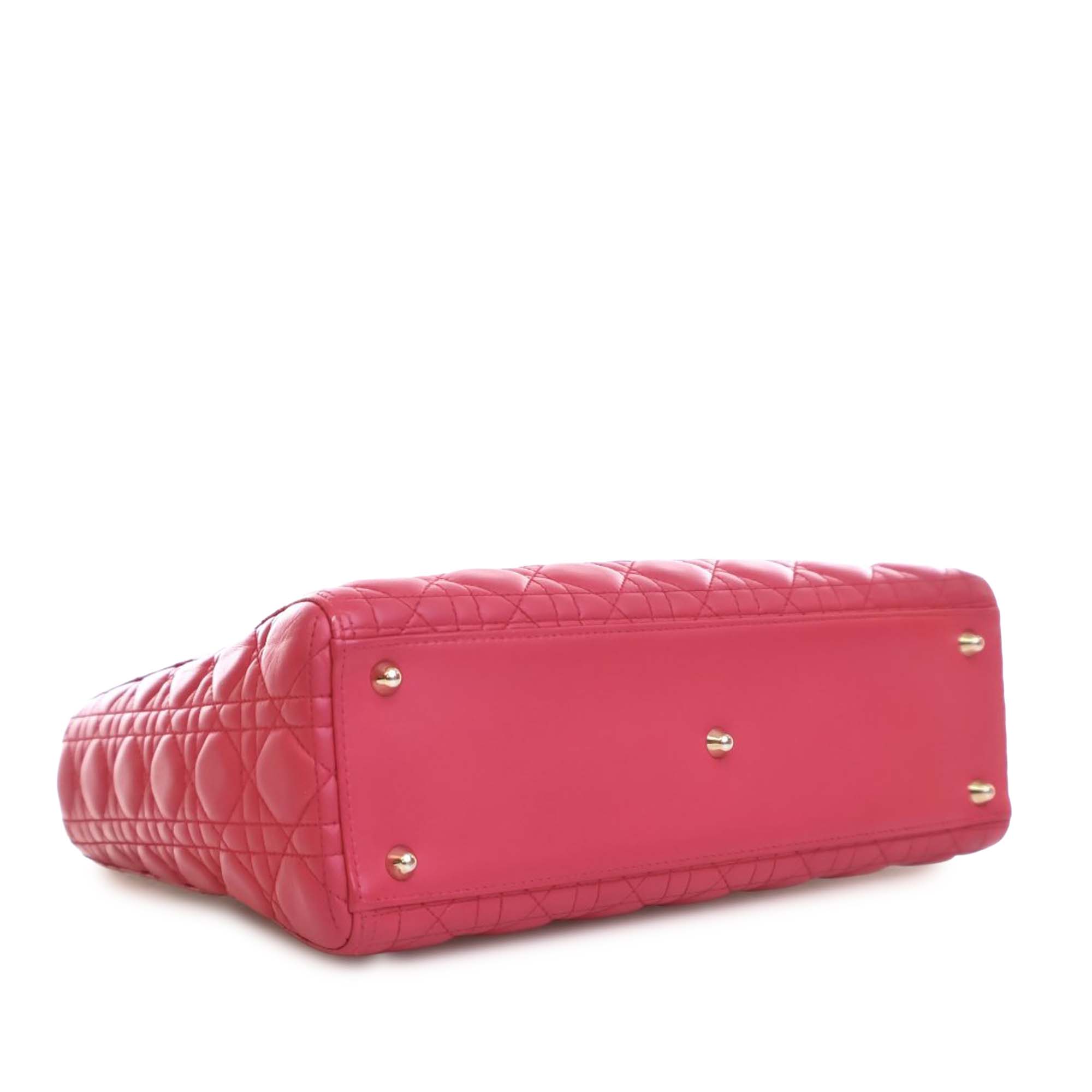 The Lady Dior features a quilted lambskin leather body, flat top handles, a detachable flat leather strap, a top zip closure, and an interior zip pocket. Retail Price: 7000.00