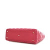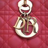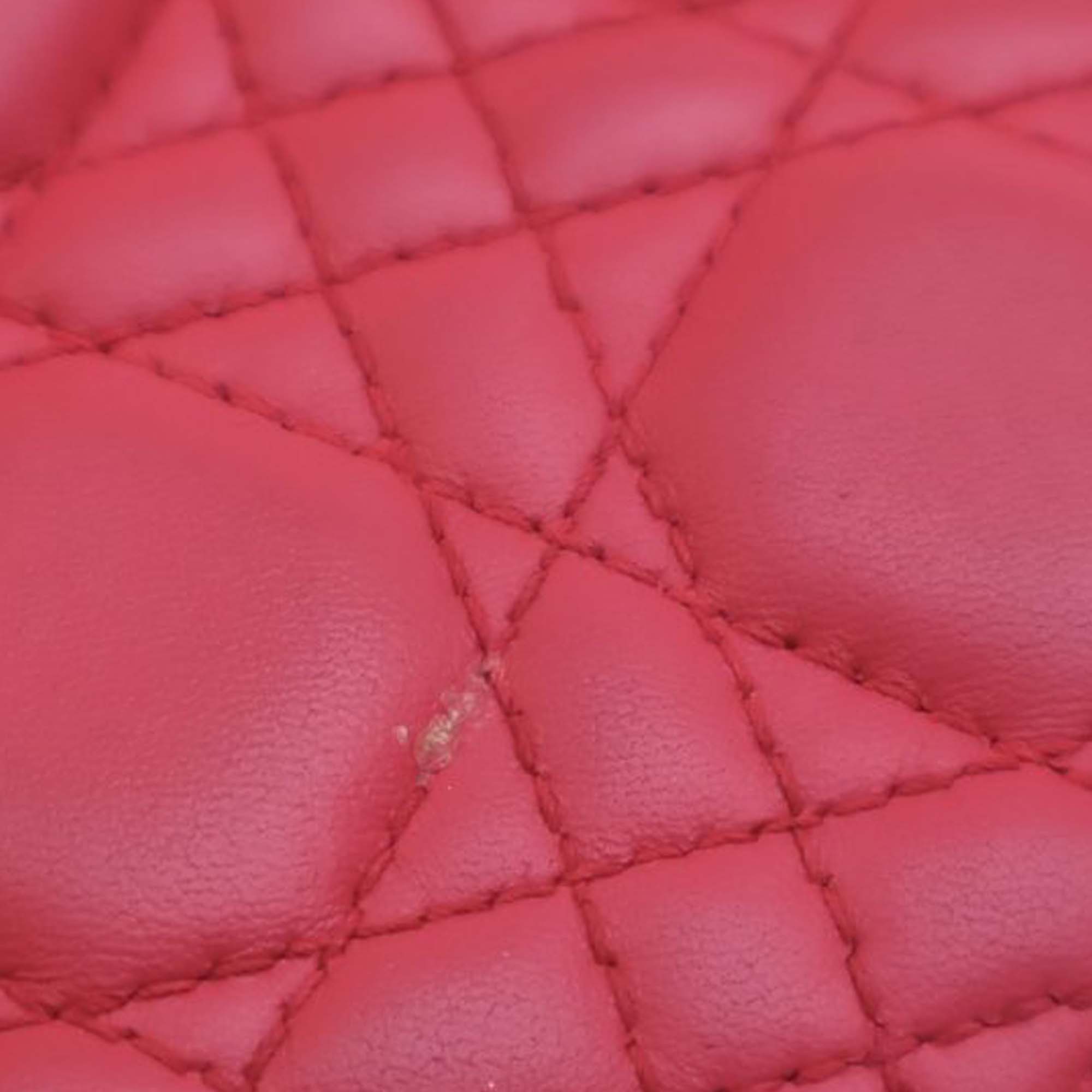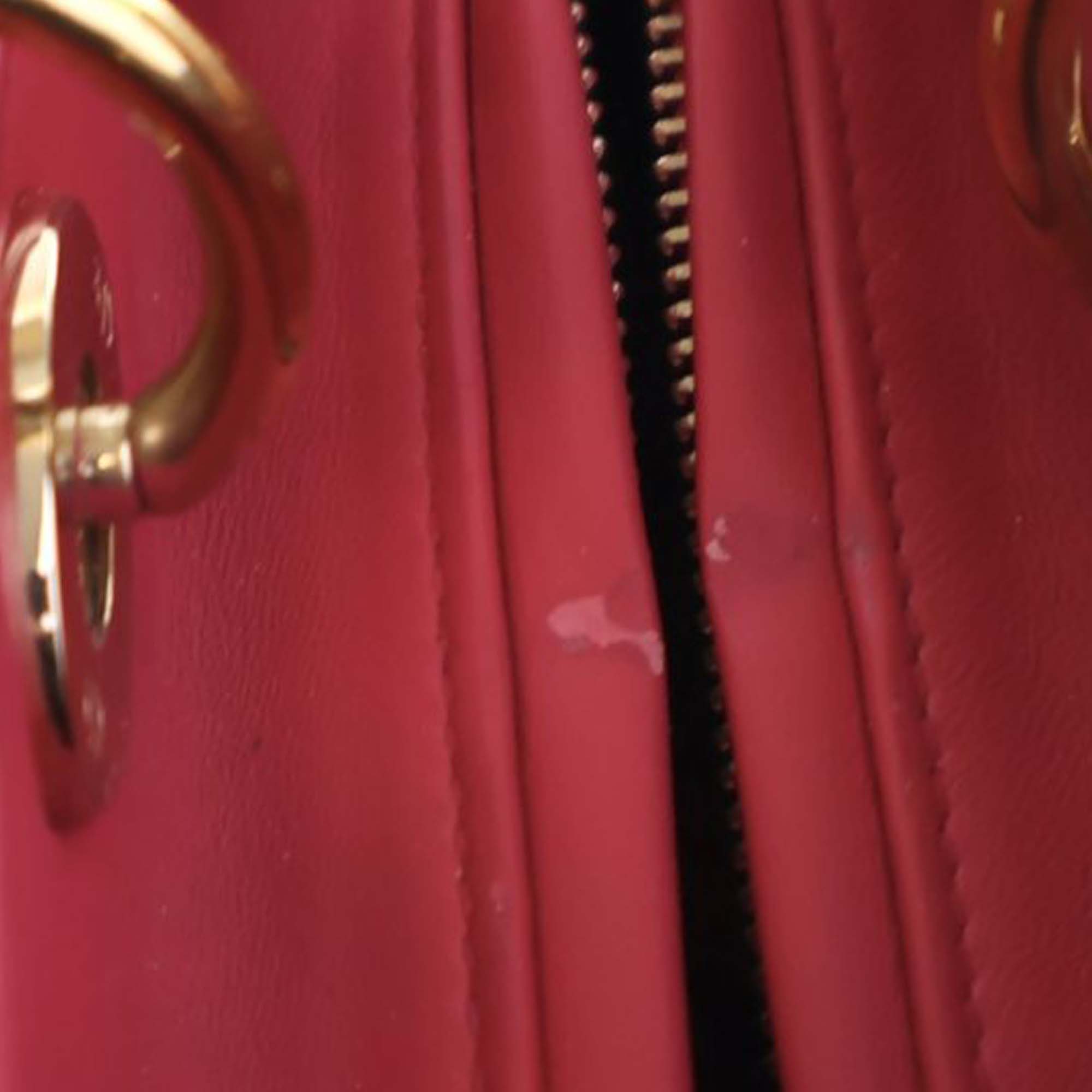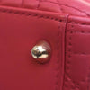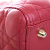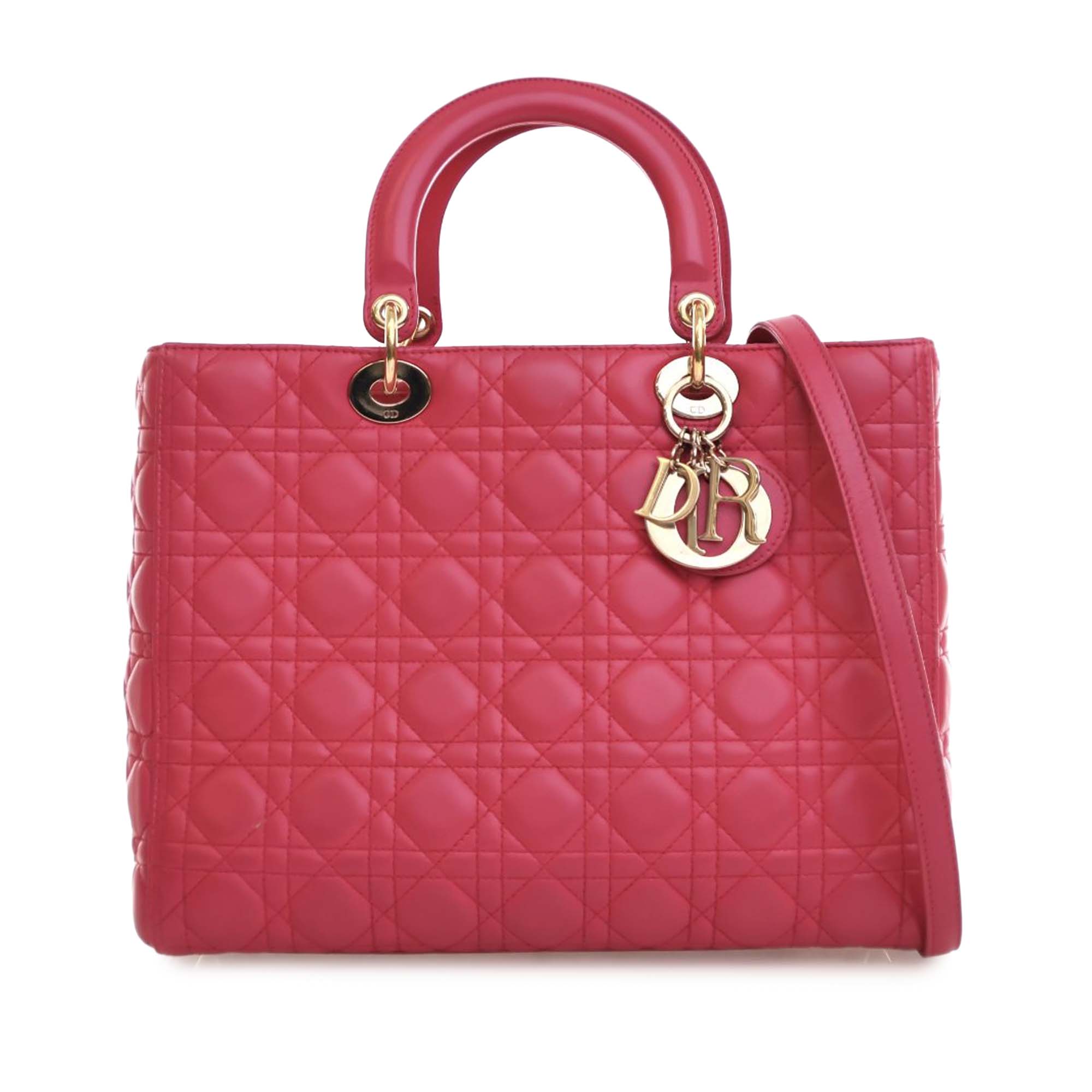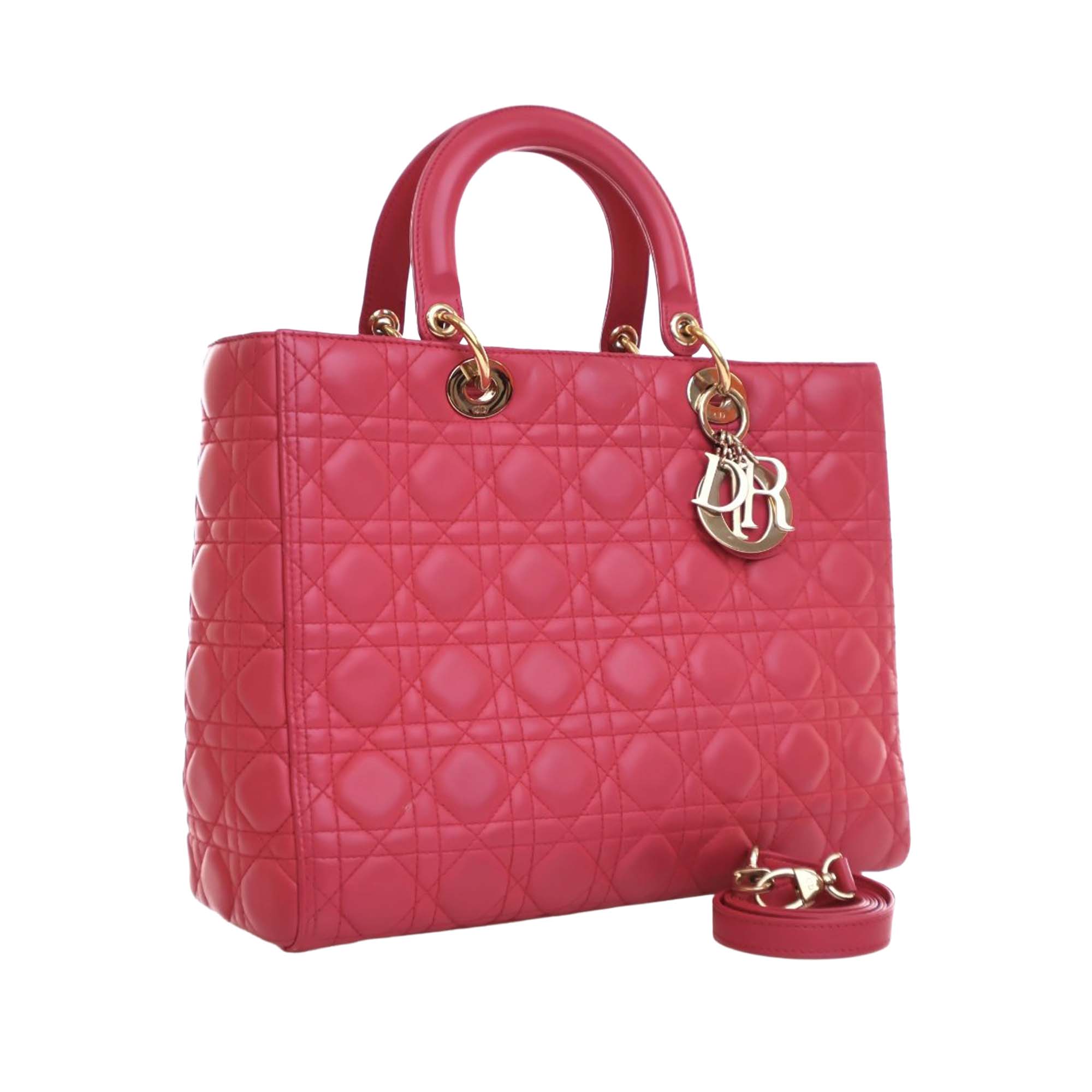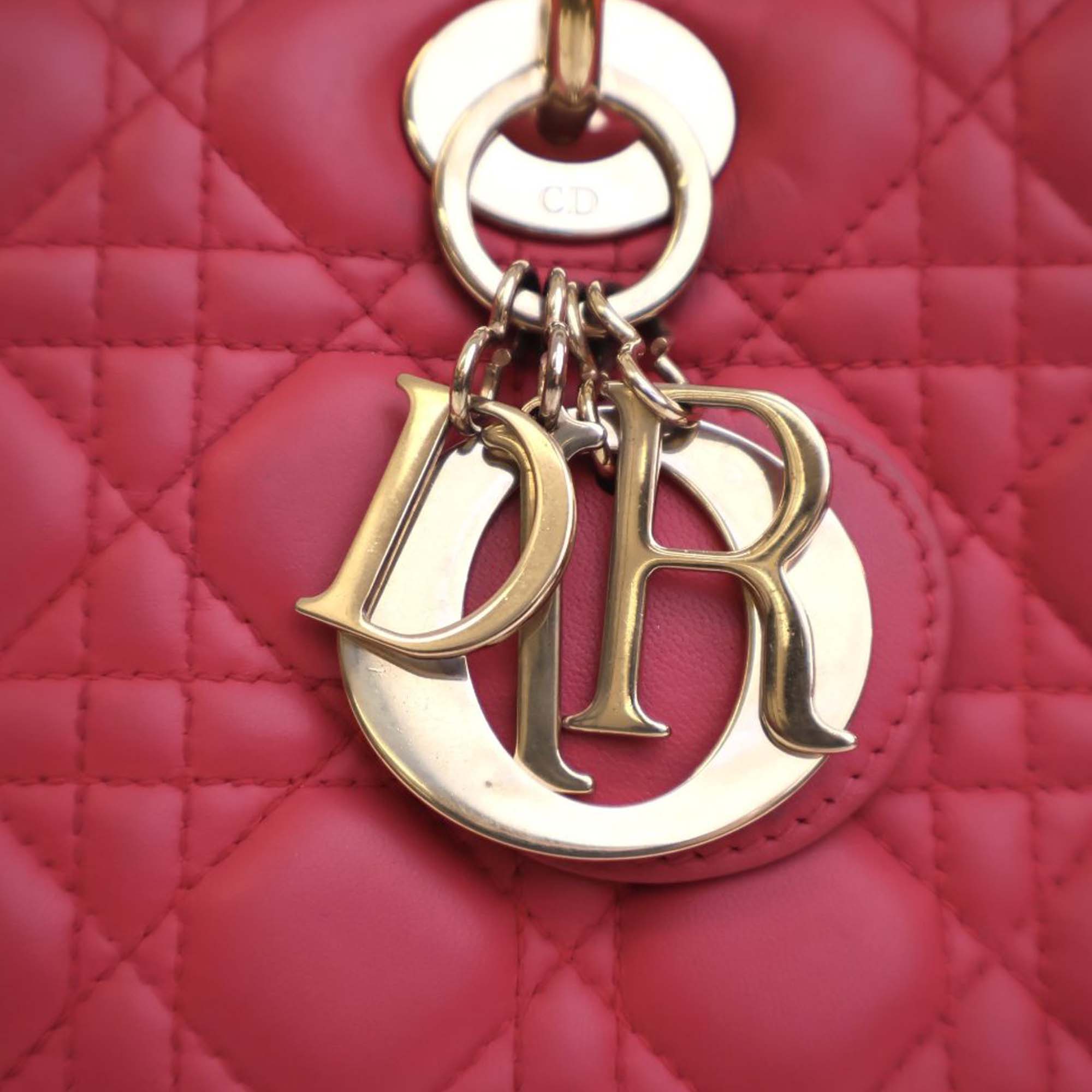 The Lady Dior features a quilted lambskin leather body, flat top handles, a detachable flat leather strap, a top zip closure, and an interior zip pocket. Retail Price: 7000.00