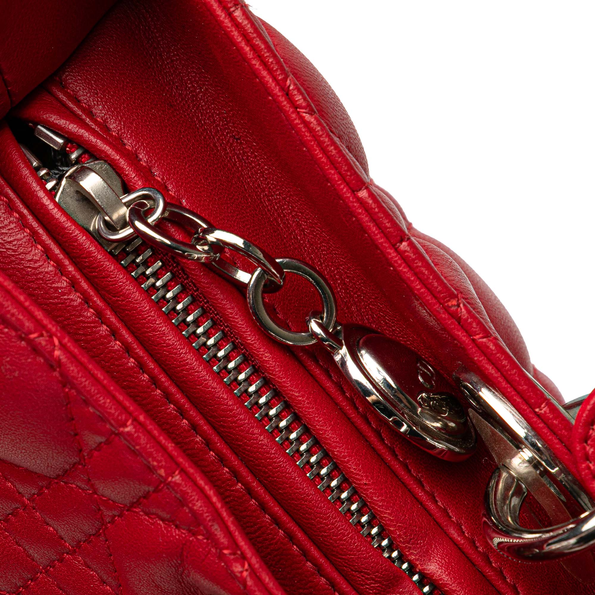The Lady Dior features a quilted lambskin leather body, structured top handles, a detachable flat leather strap, a top zip closure, and an interior zip pocket. Inclusion: authenticity card. Retail Price: 4100.00