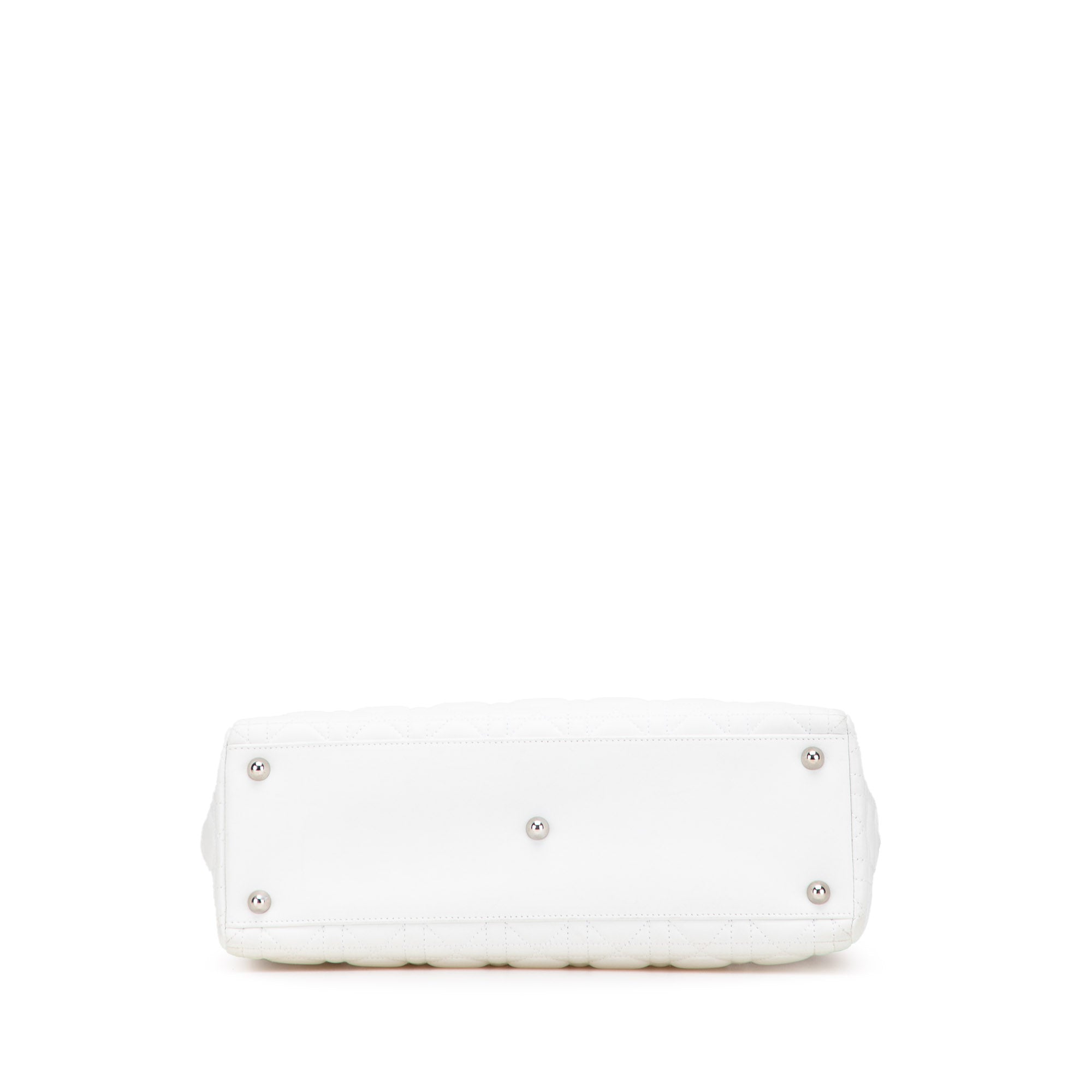 The Lady Dior features a quilted lambskin leather body, flat top handles, a detachable flat leather strap, a top zip closure, and an interior zip pocket. Inclusion: authenticity card. Retail Price: 4100.00