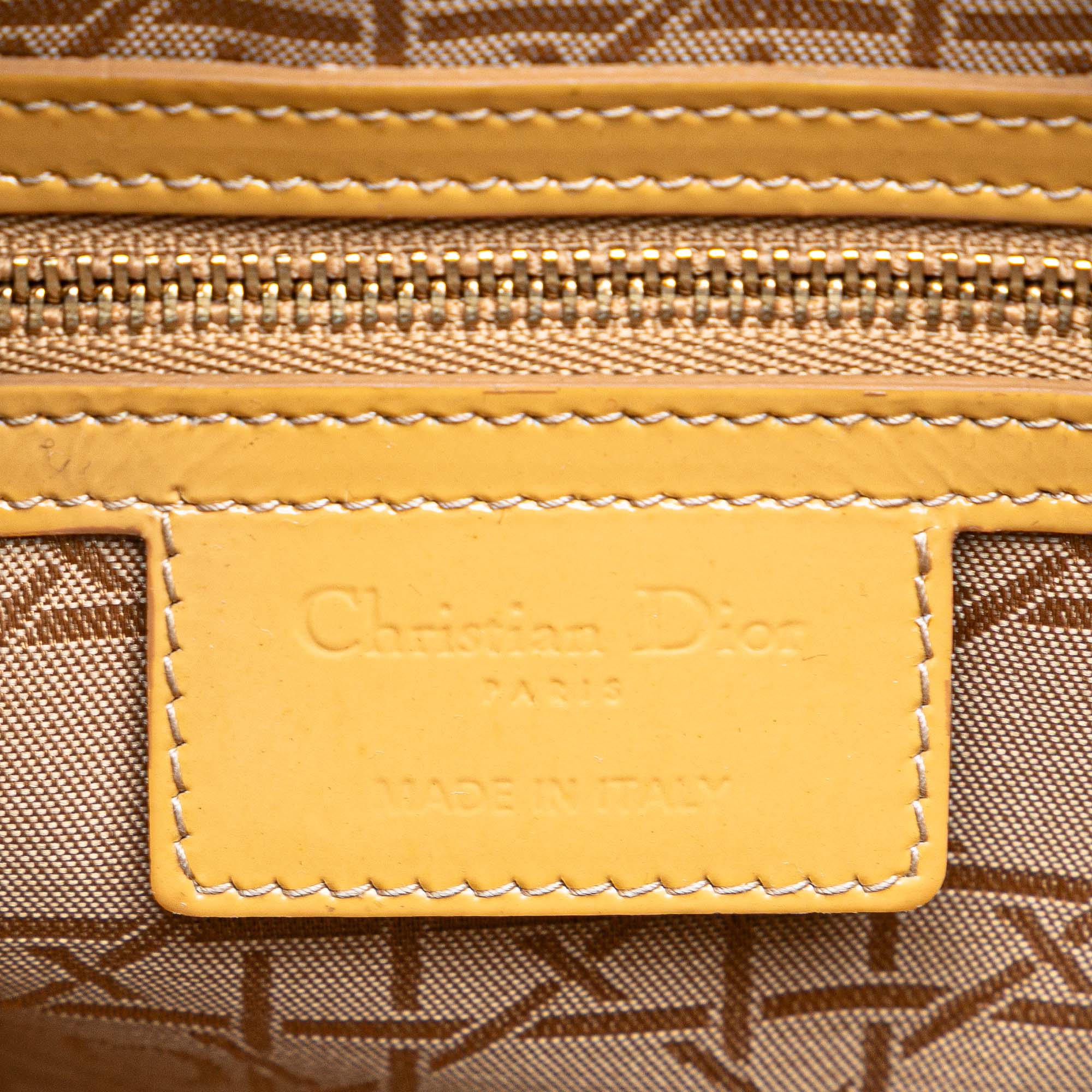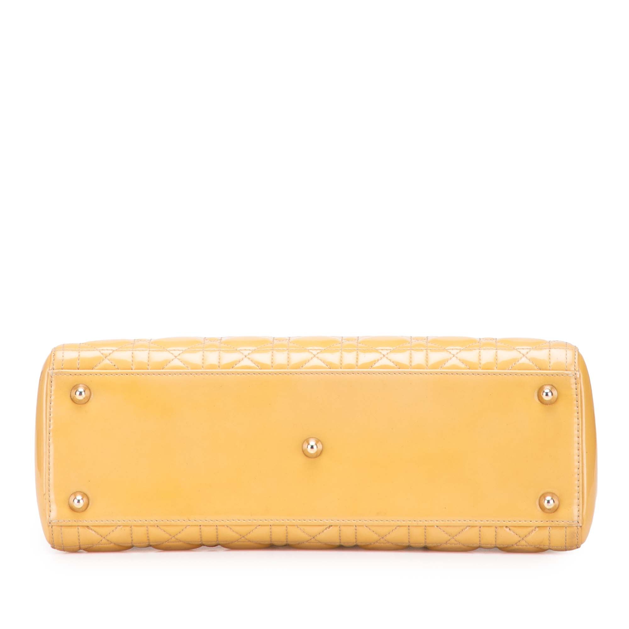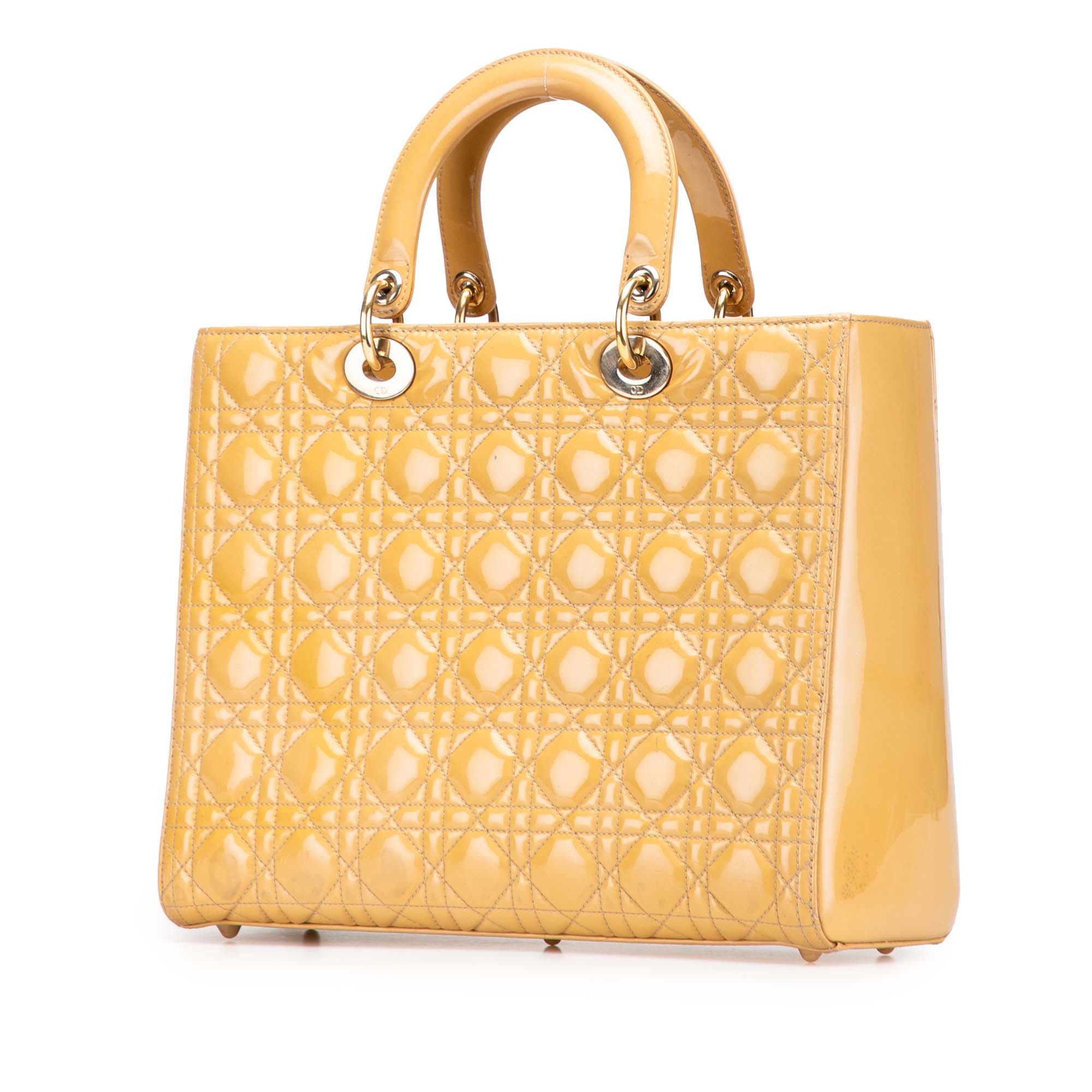 The Lady Dior features a patent leather body, flat leather handles, a detachable flat leather strap, a top zip closure, and an interior zip pocket. Retail Price: 6500.00