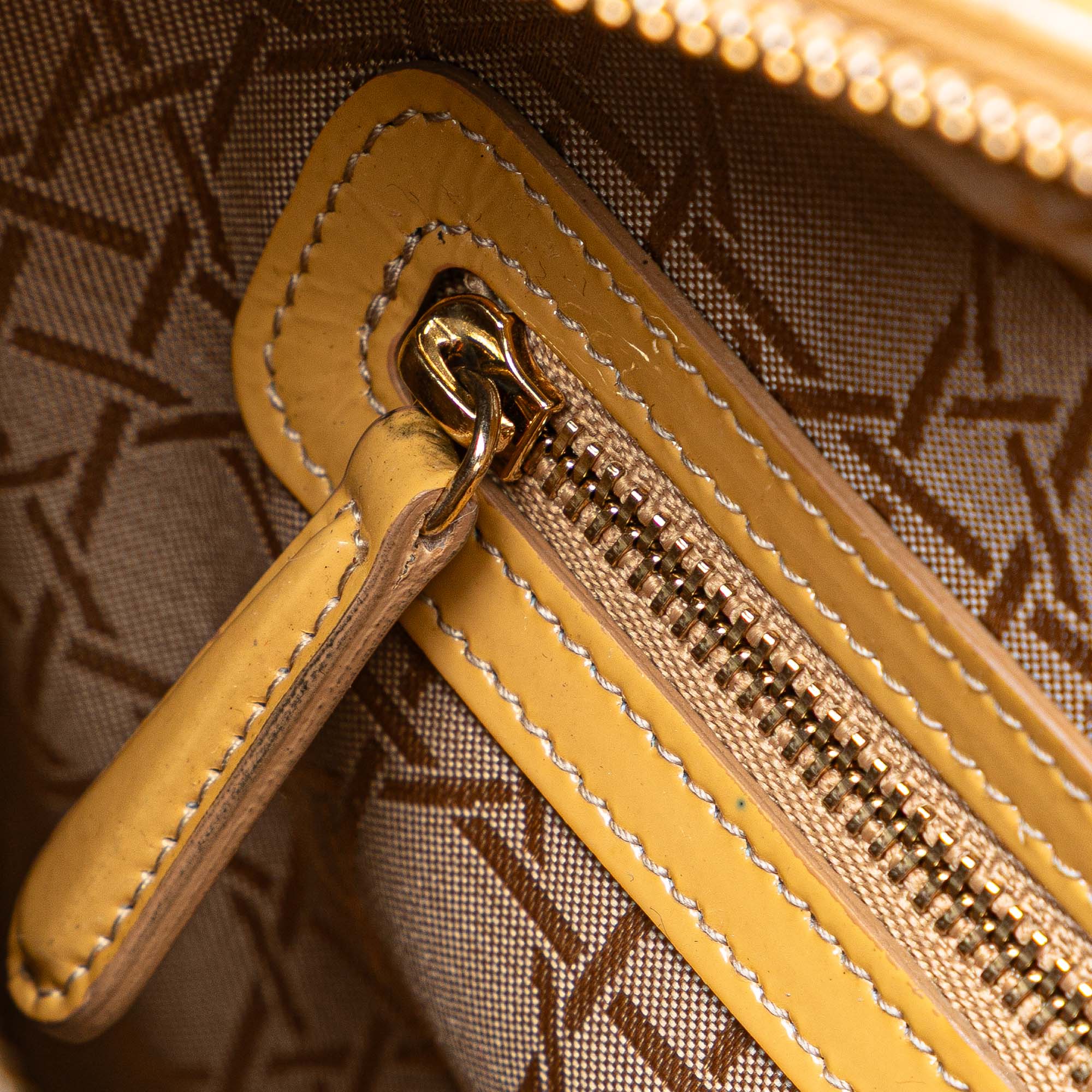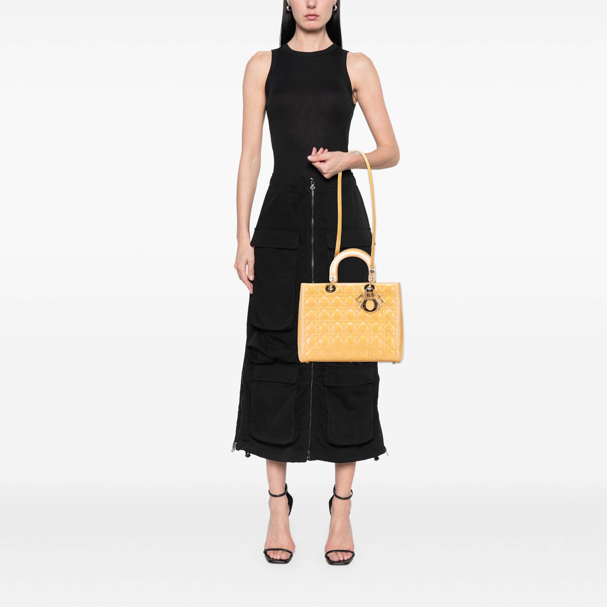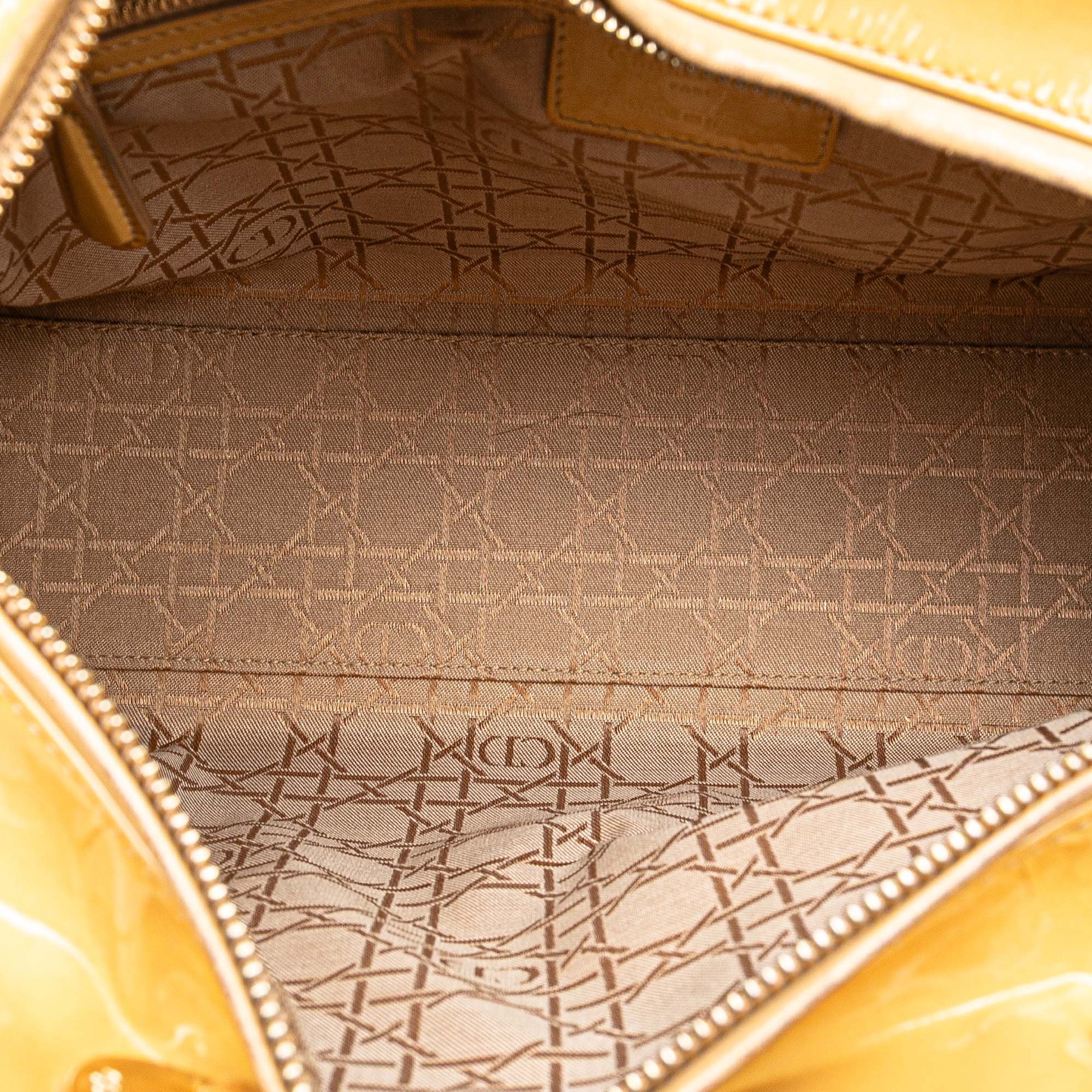 The Lady Dior features a patent leather body, flat leather handles, a detachable flat leather strap, a top zip closure, and an interior zip pocket. Retail Price: 6500.00
